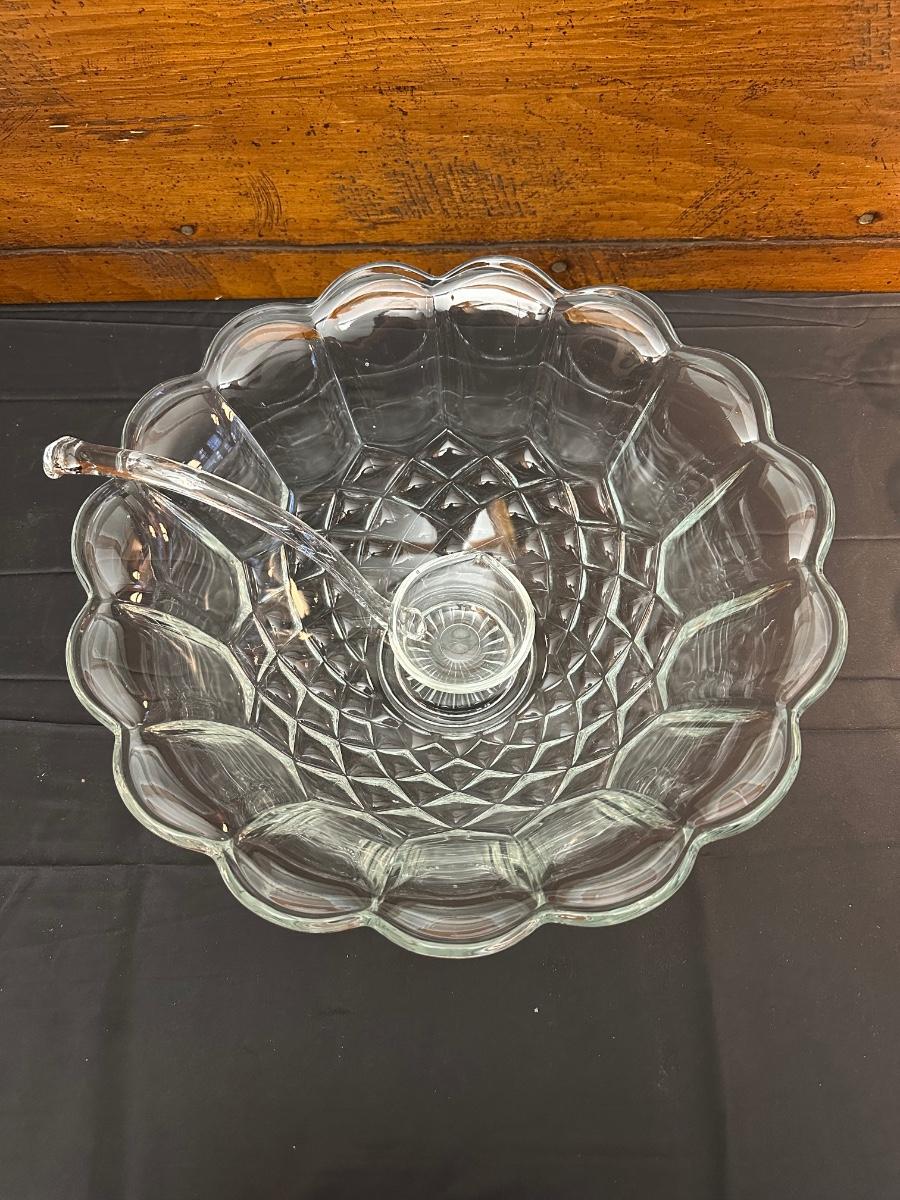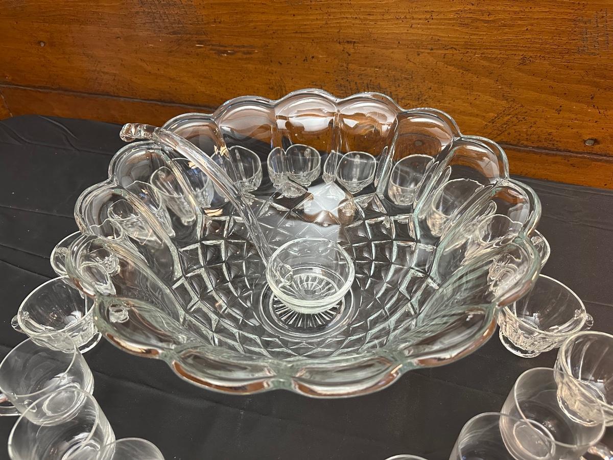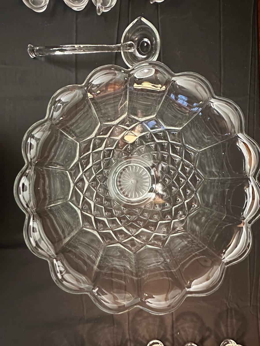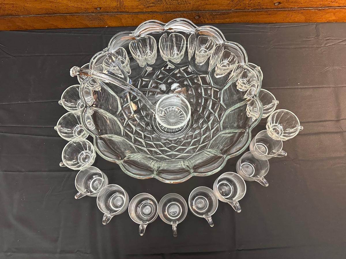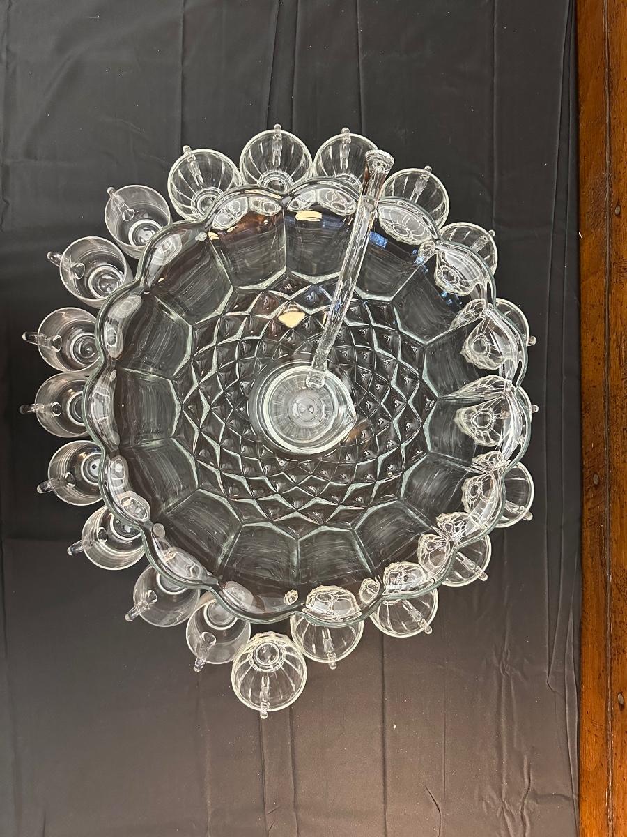 This bowl is large and can serve a group of people. There are two sets of glasses — see photos for details. Absolutely beautiful! Not pictured, a large matching plate that sits under the punch bowl.