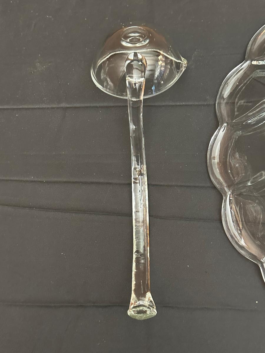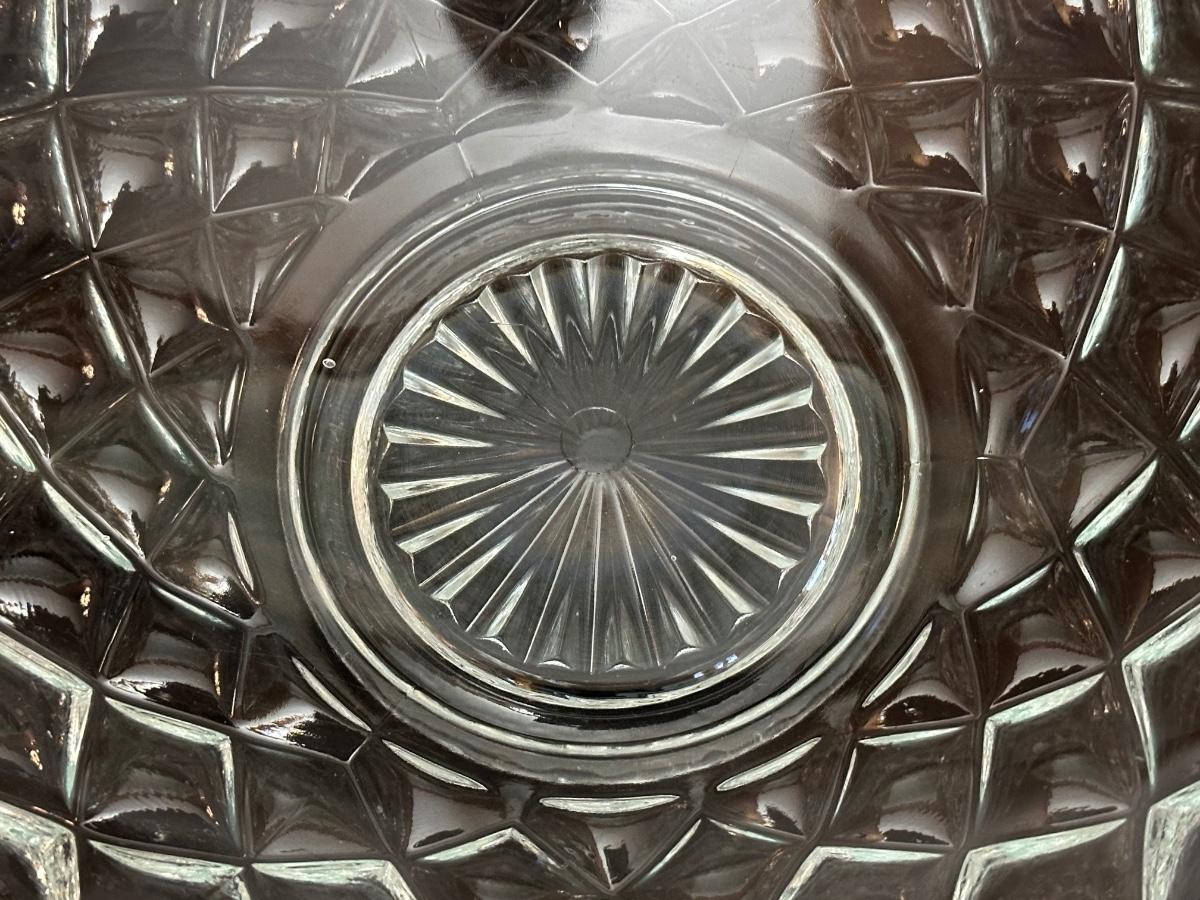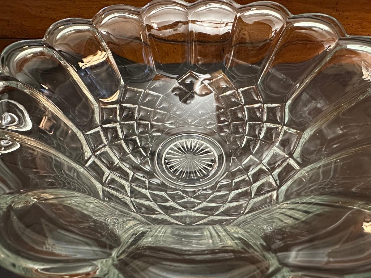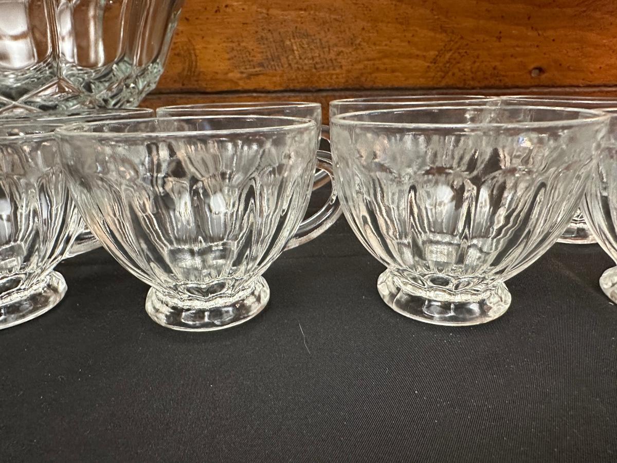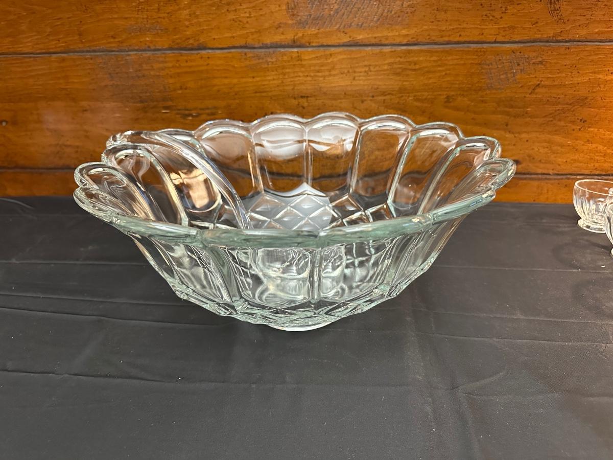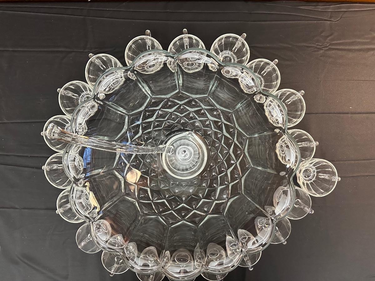 This bowl is large and can serve a group of people. There are two sets of glasses — see photos for details. Absolutely beautiful! Not pictured, a large matching plate that sits under the punch bowl.