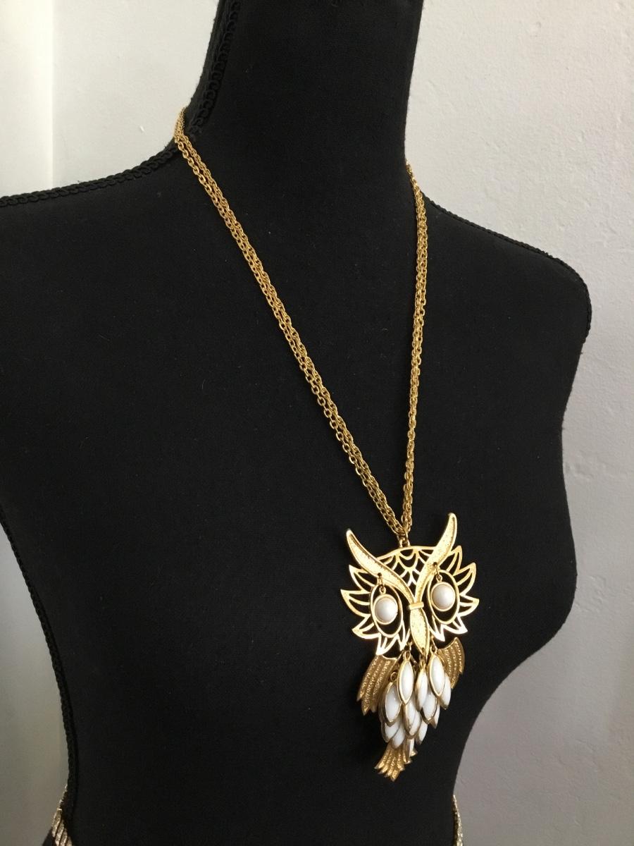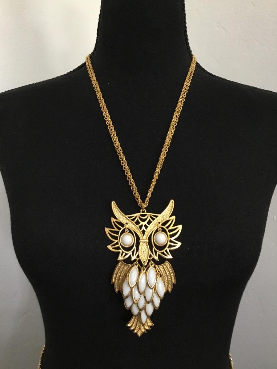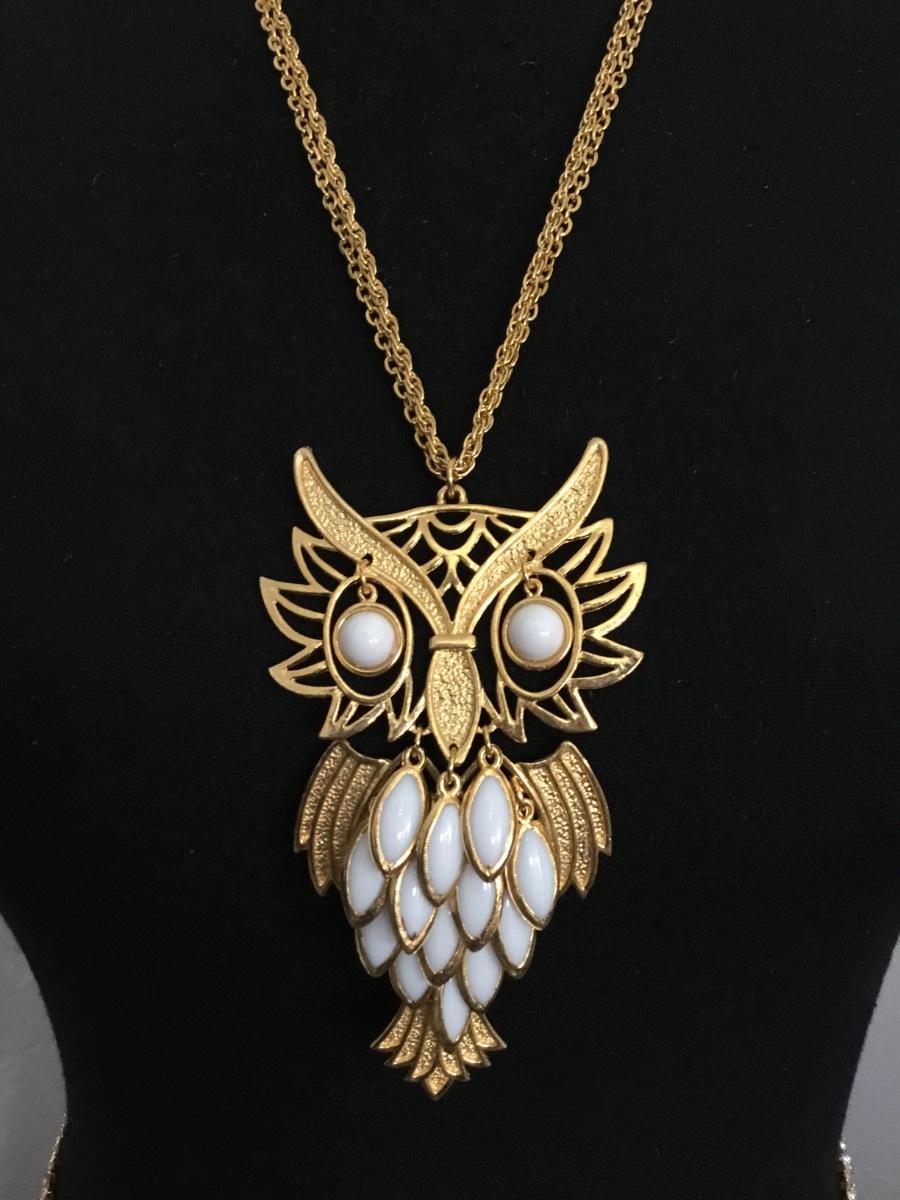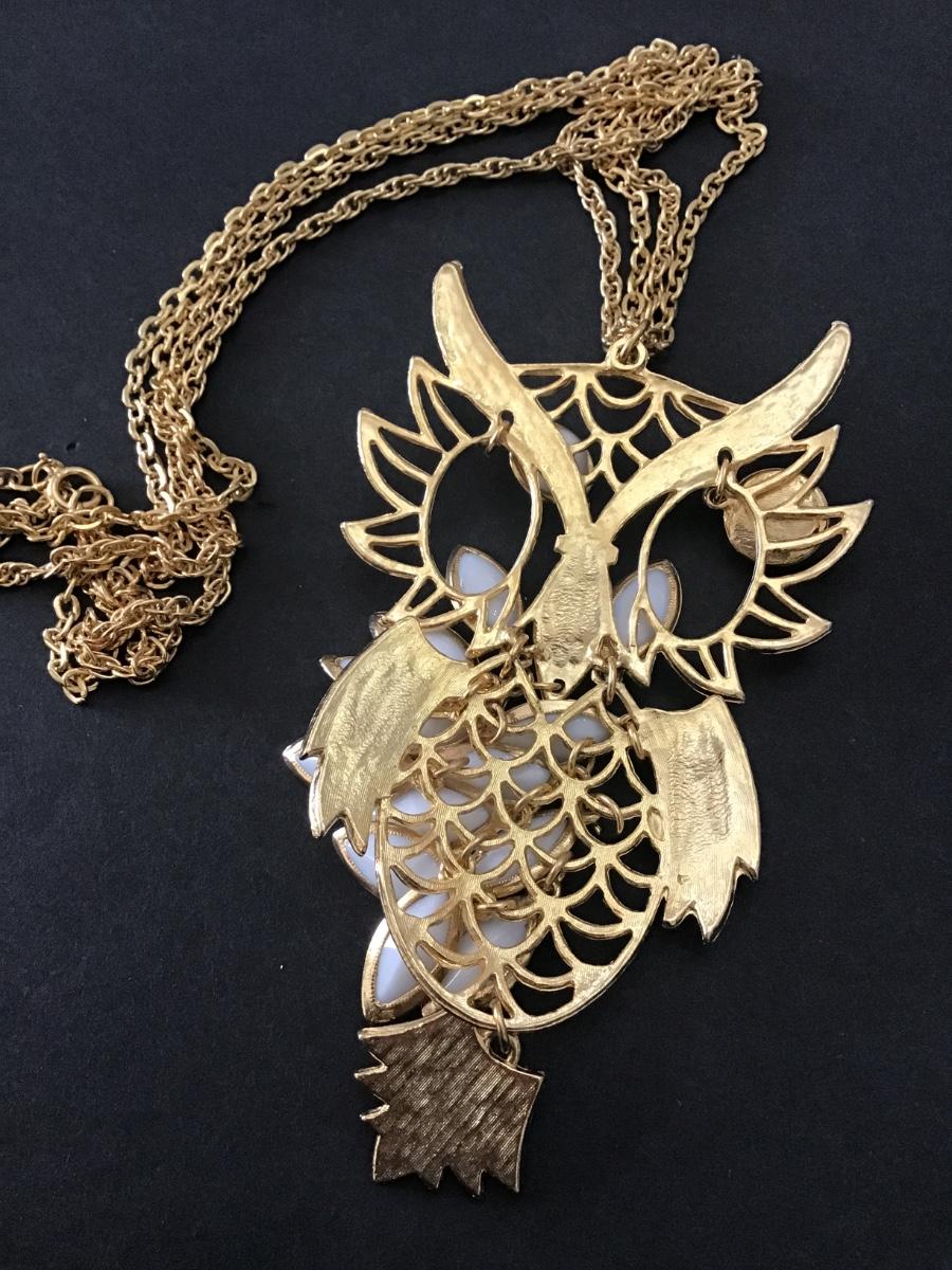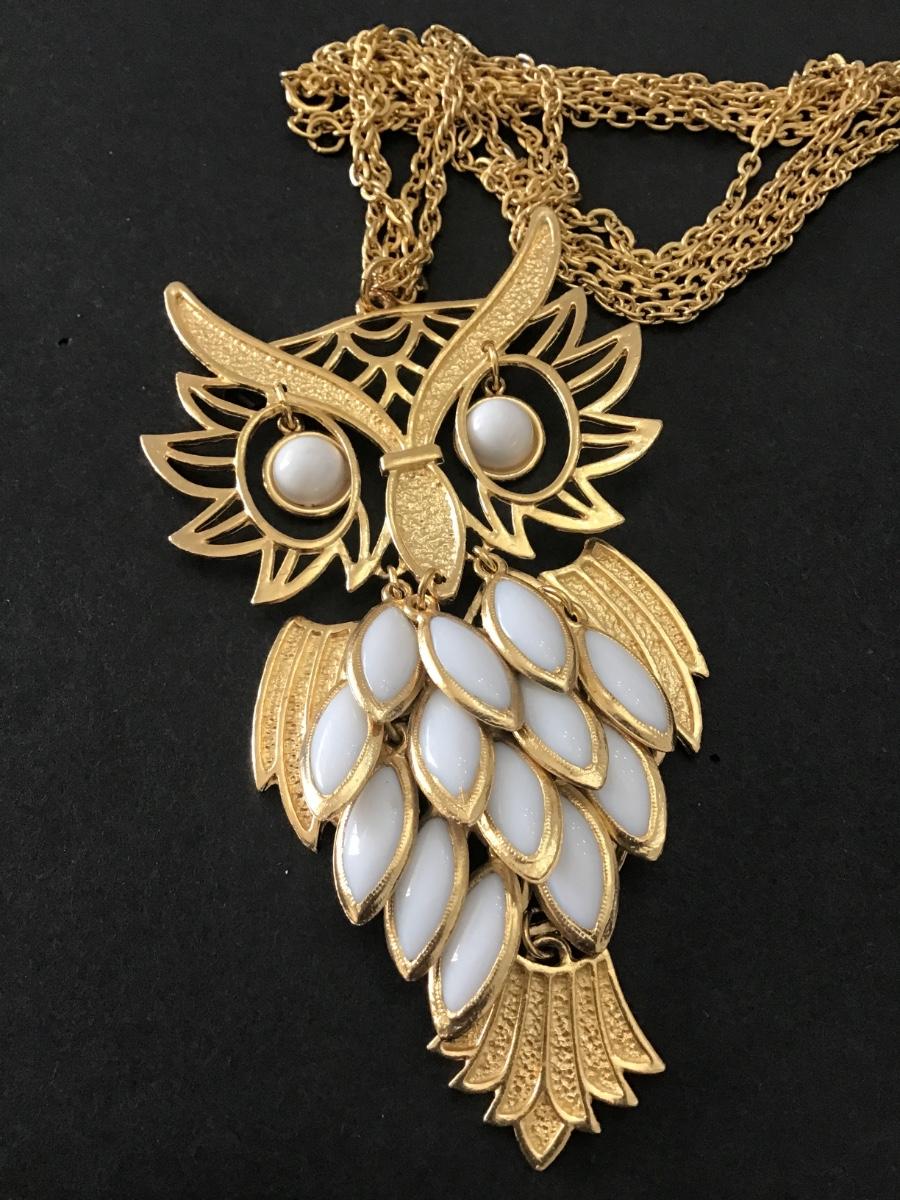 Beautiful vintage, dancing feather 1960s, white milk, glass, large, gold tone, owl, statement, necklace