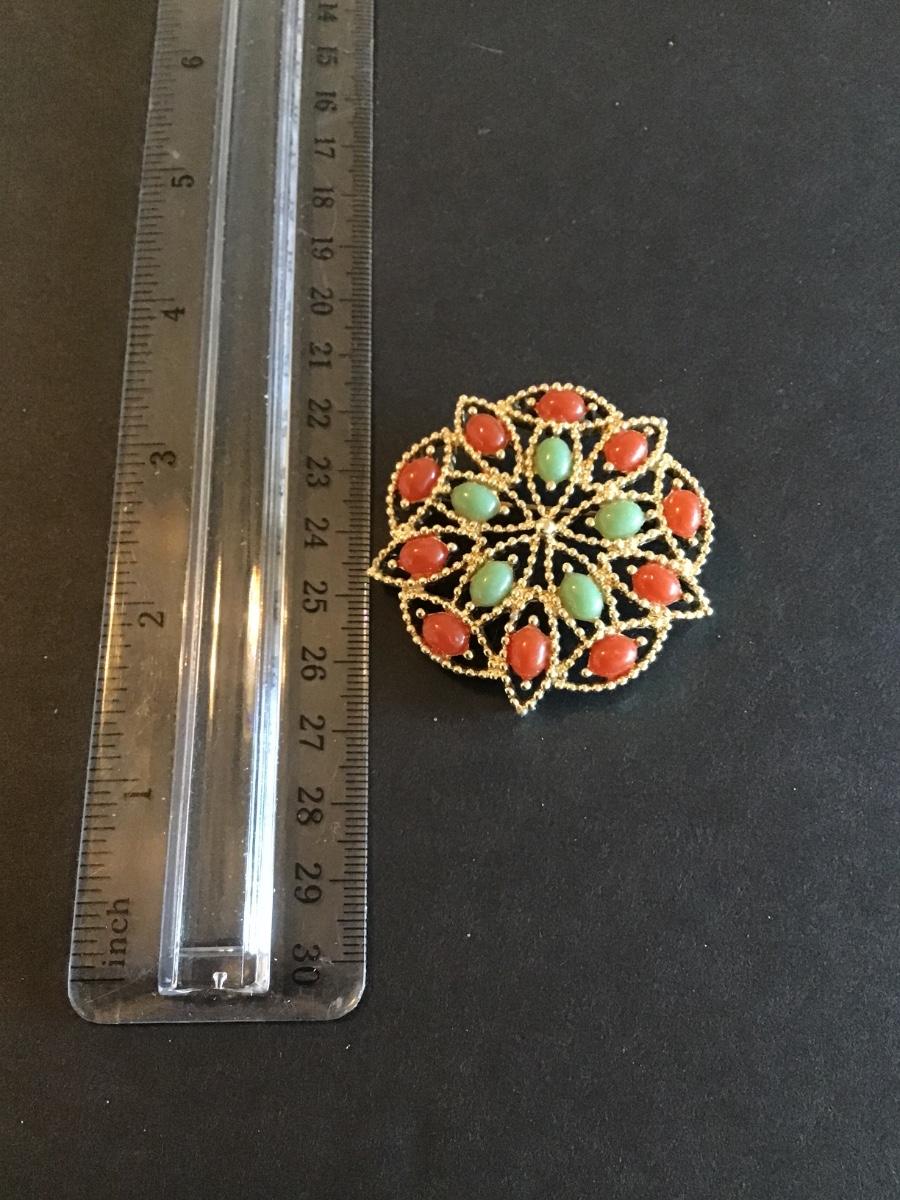 Beautiful Vintage Sarah Coventry Acapulco brooch with gold tone setting with faux green Jade and red coral cabochon stones