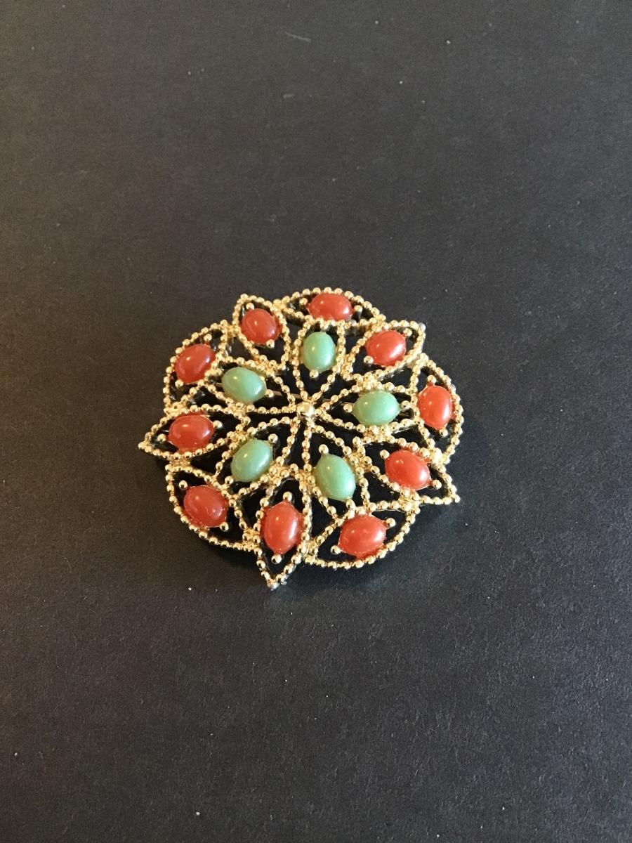 Beautiful Vintage Sarah Coventry Acapulco brooch with gold tone setting with faux green Jade and red coral cabochon stones
