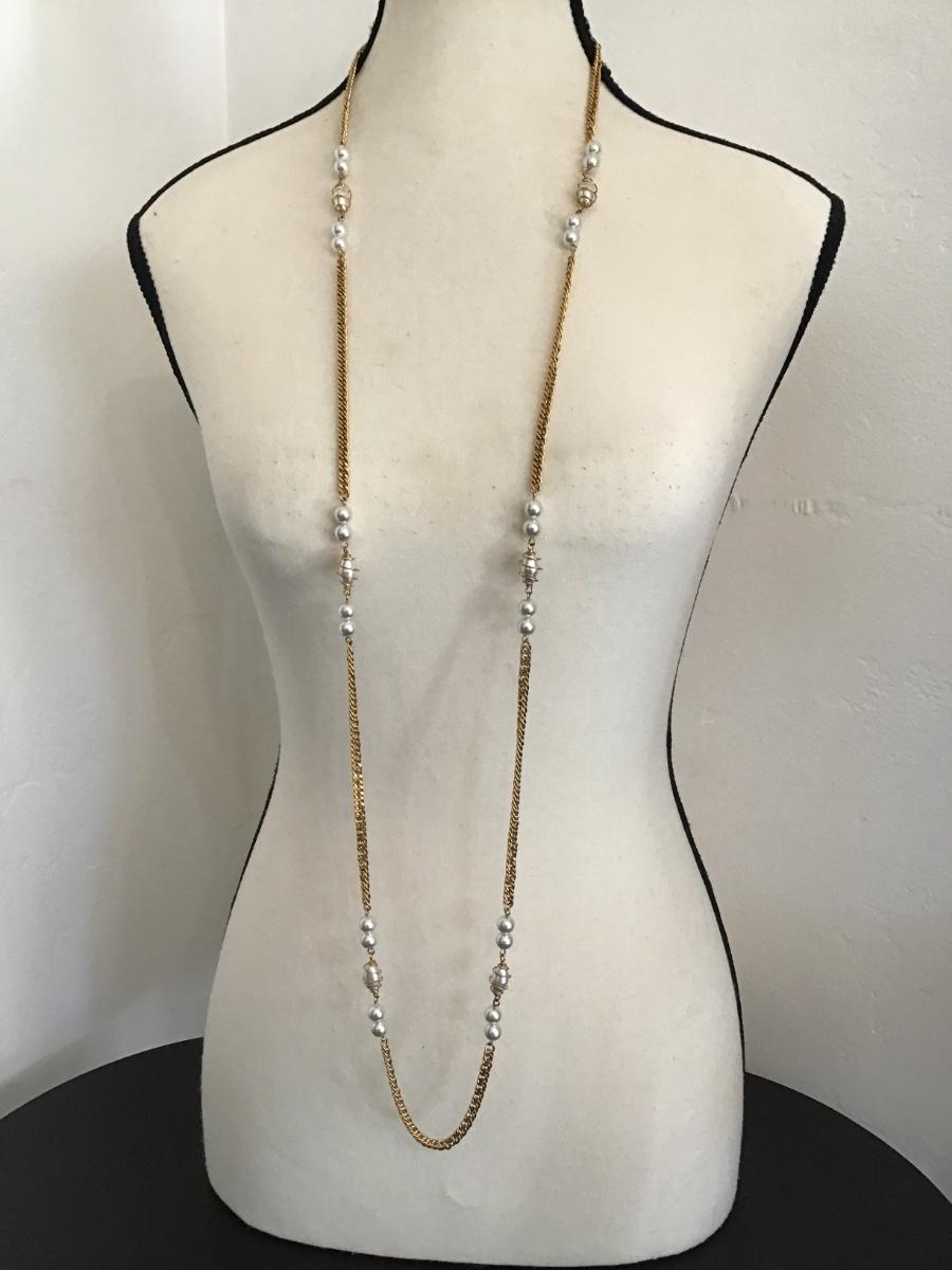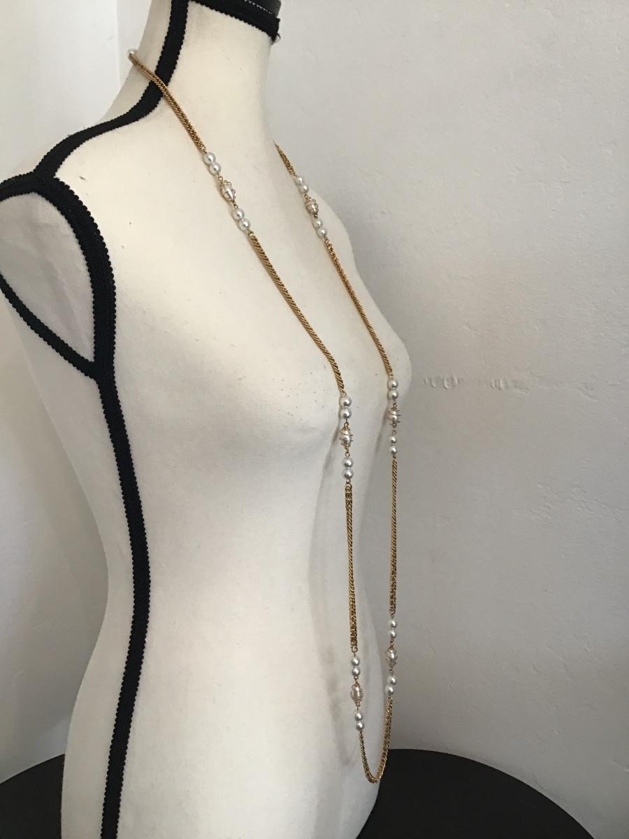 Beautiful vintage, Sarah Coventry, faux pearl and gold tone long chain necklace