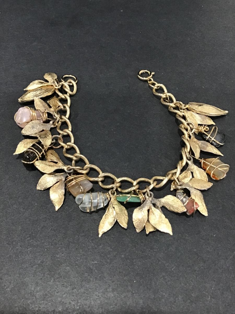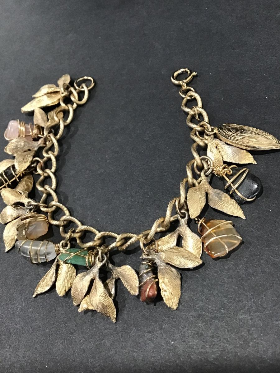 Beautiful vintage, semi precious stone, charm bracelet, satin gold toned