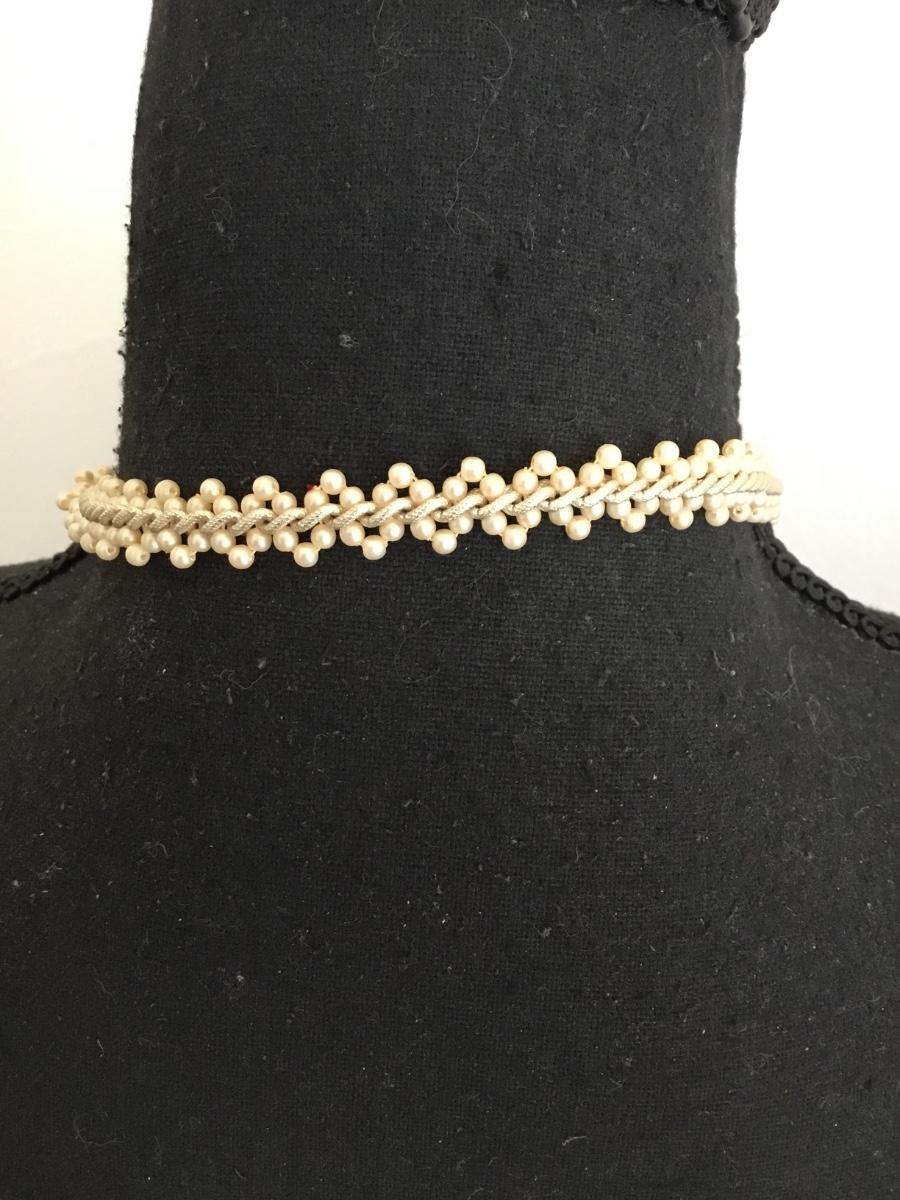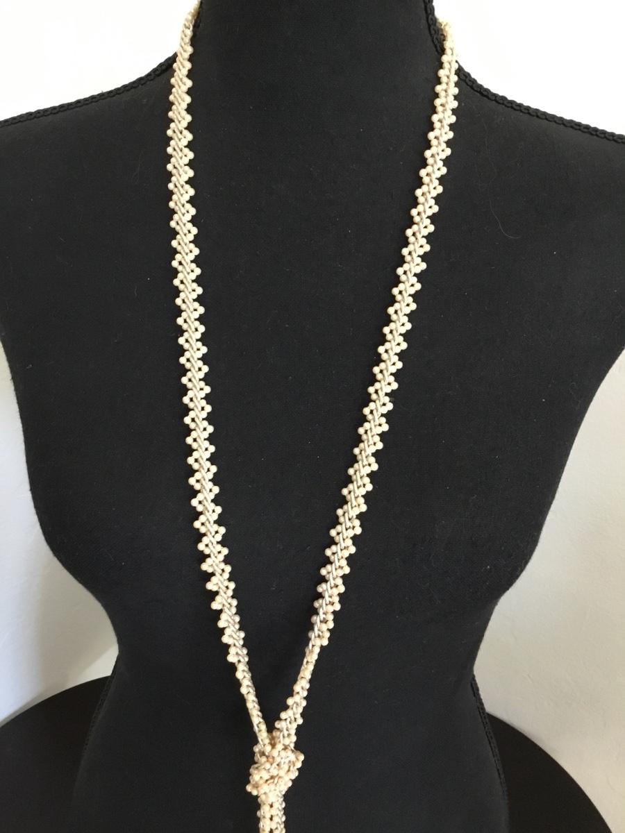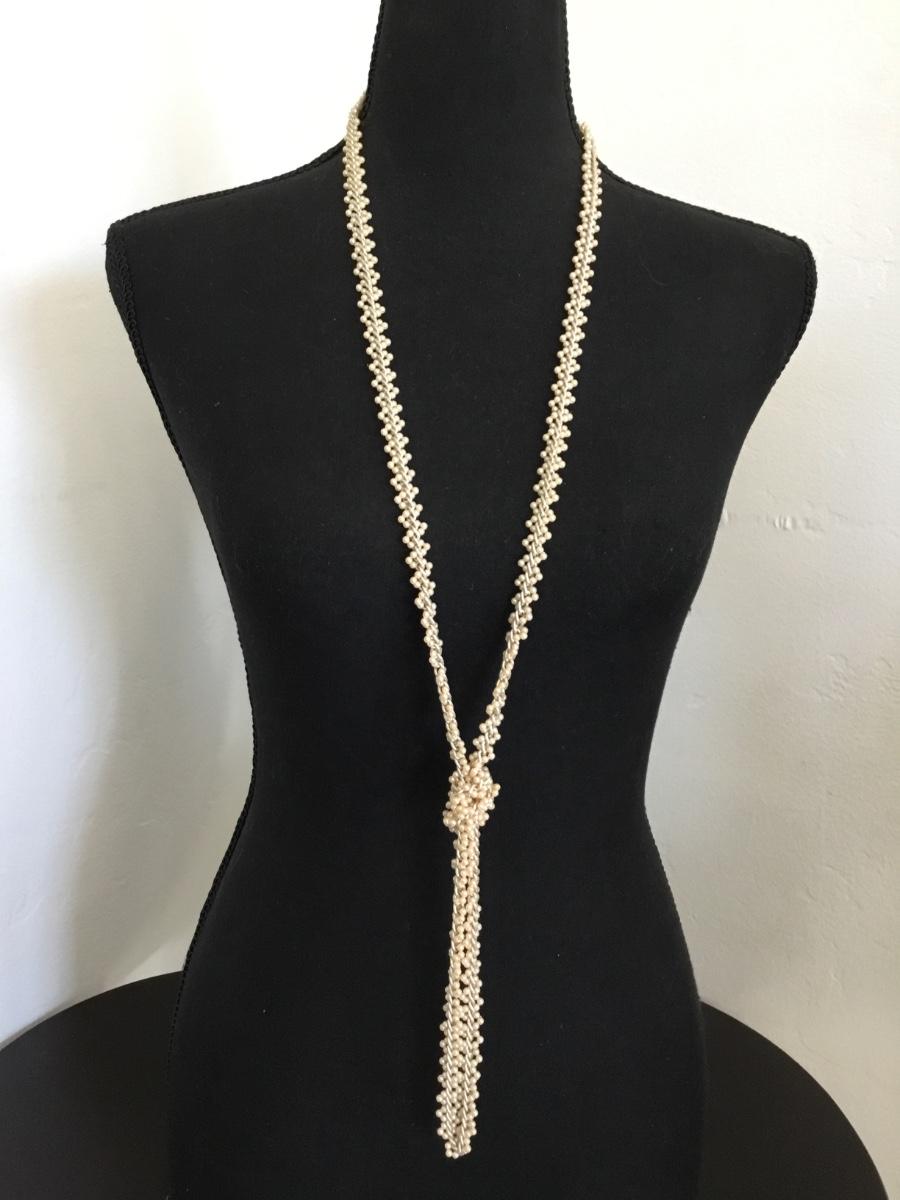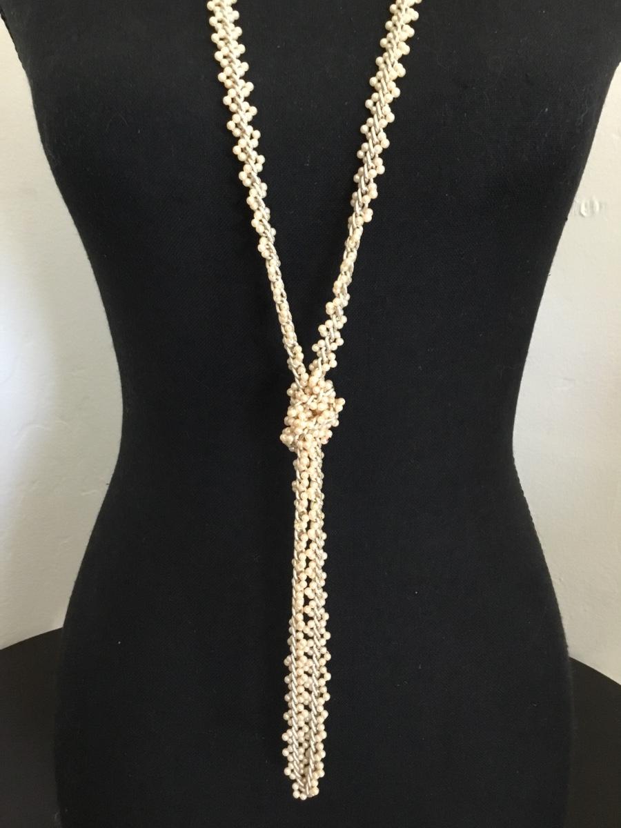 Beautiful, vintage, silver tone, chain faux pearl bead tassel knotted necklace