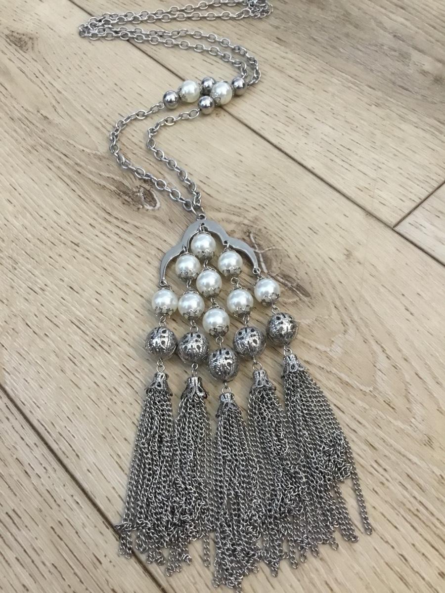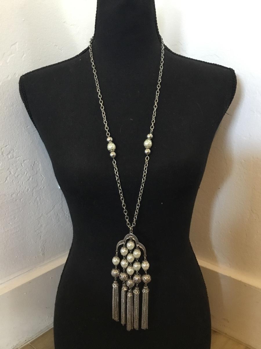 Beautiful vintage, Silver tone faux, pearl chandelier, statement, tassel necklace