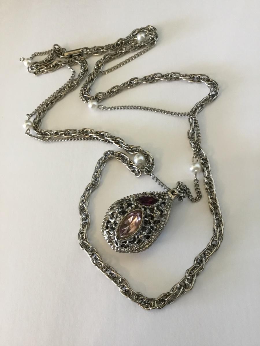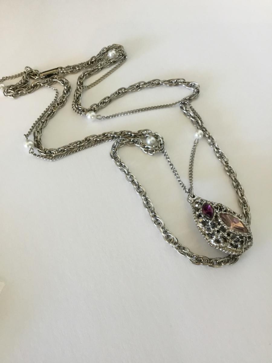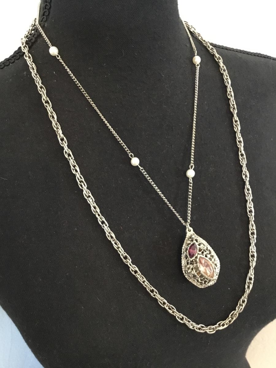 Beautiful, vintage, Silver tone, filagree, rhinestone, hollow, teardrop, caged, pendant, multi strand layered necklace
