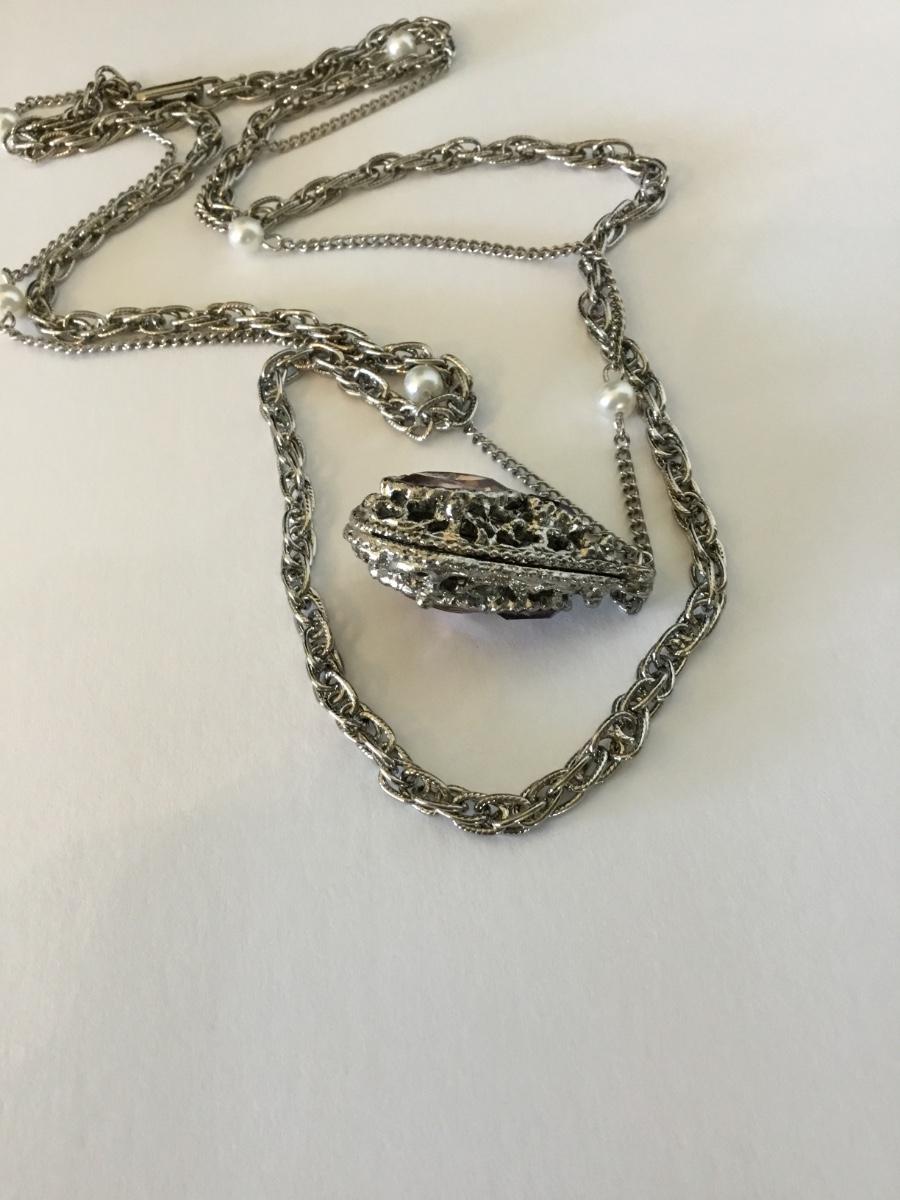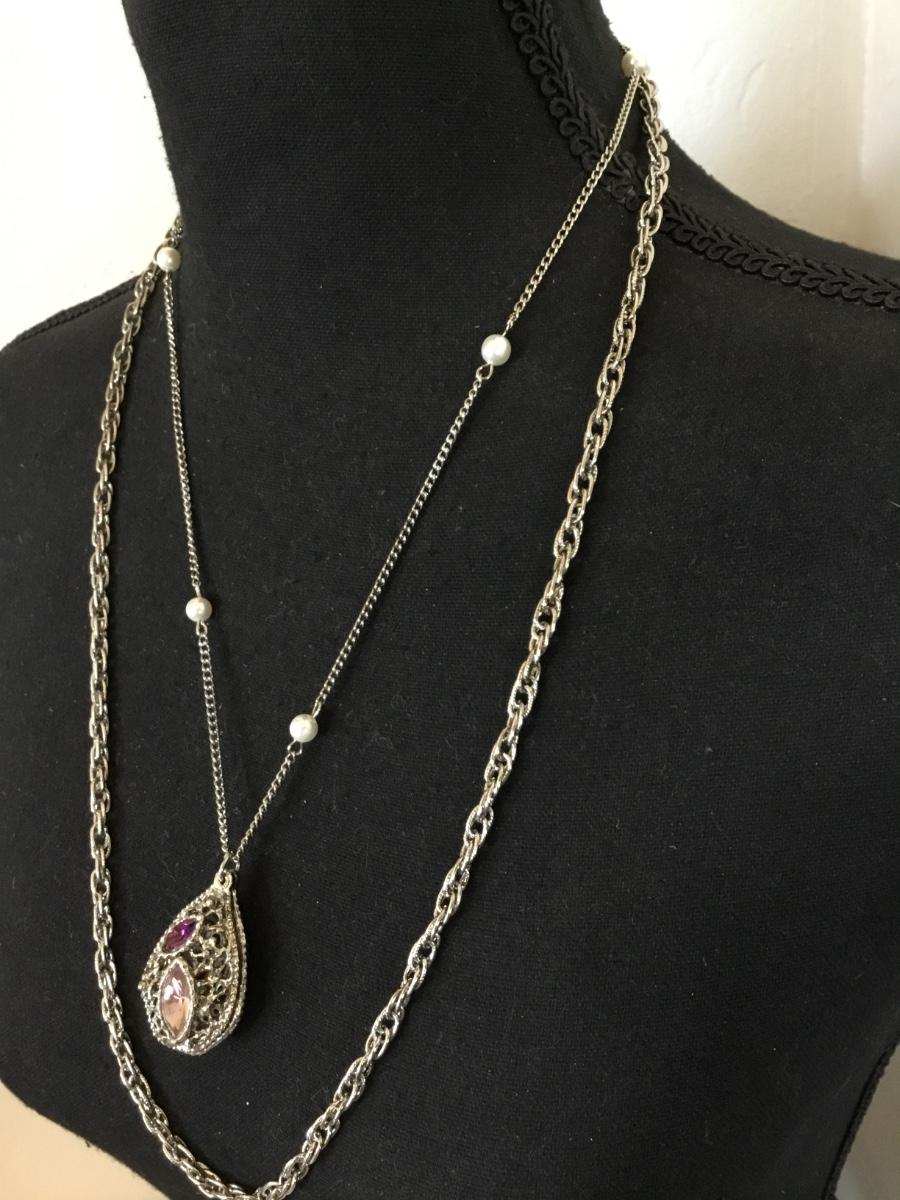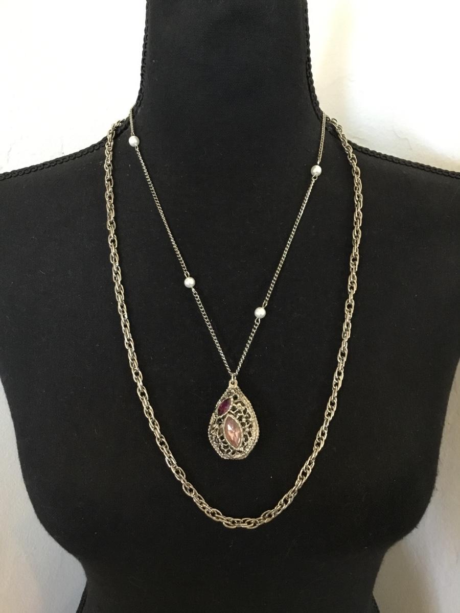 Beautiful, vintage, Silver tone, filagree, rhinestone, hollow, teardrop, caged, pendant, multi strand layered necklace