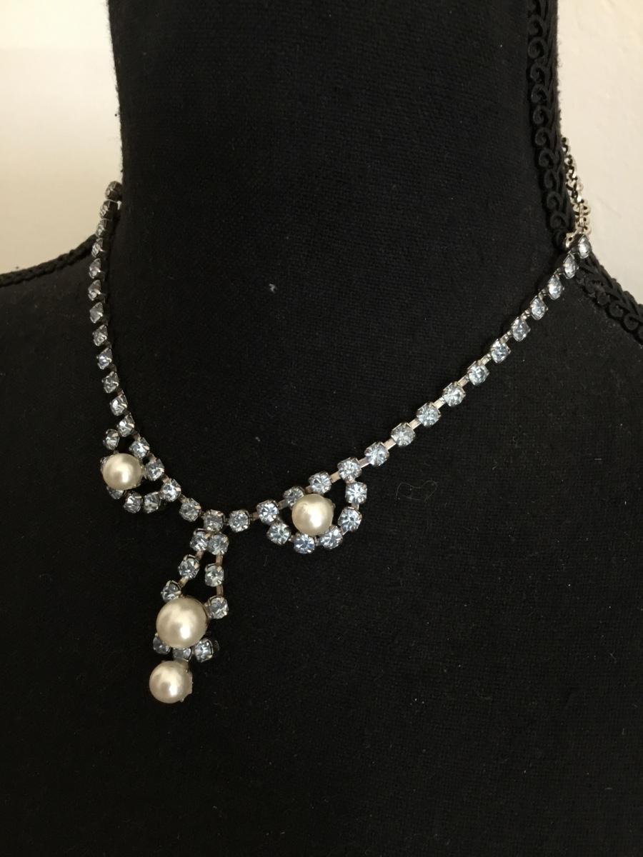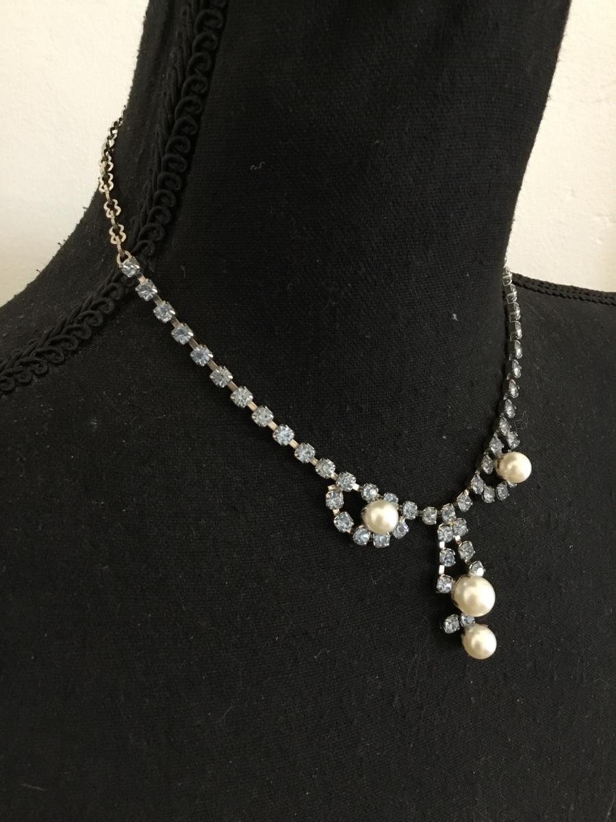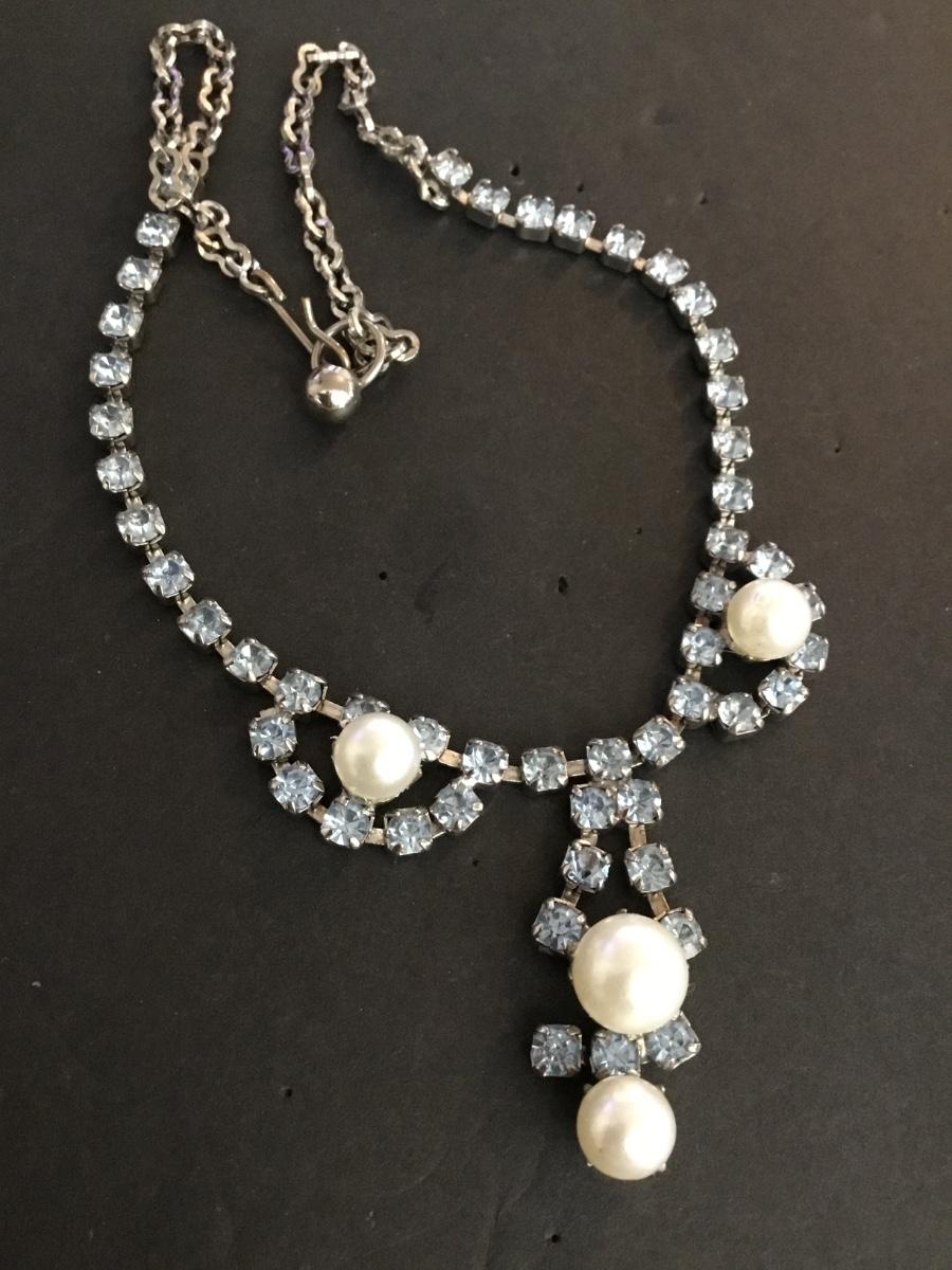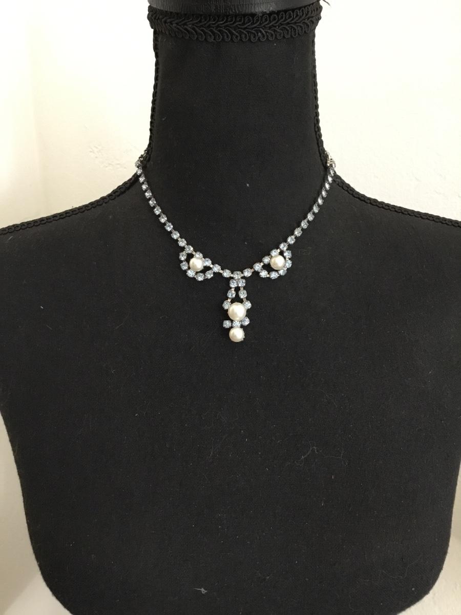 Beautiful vintage, silver toned, light, blue crystal rhinestone, faux pearl necklace. Excellent condition.