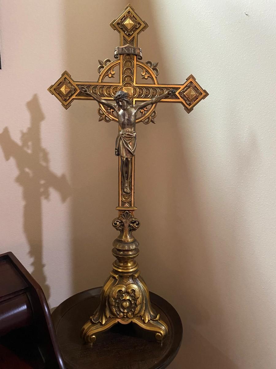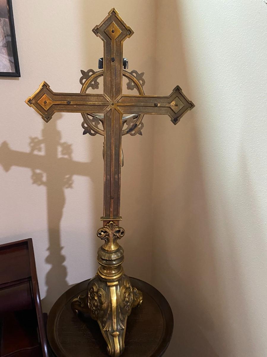 Beautiful vintage solid brass crucifix from St. Elizabeth's orphanage. Purchased from the estate of Anne Rice. Approx. 29" H x 13-1/2" W. 3-point base is approx. 8" W.