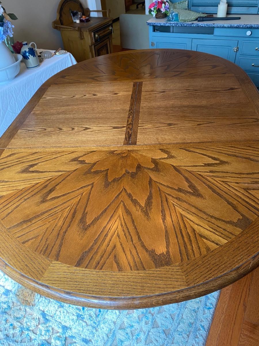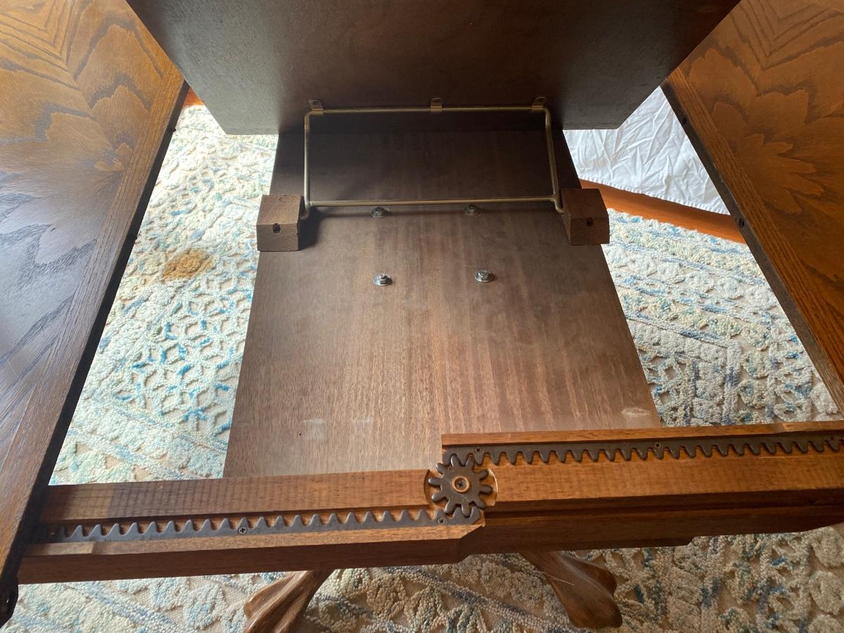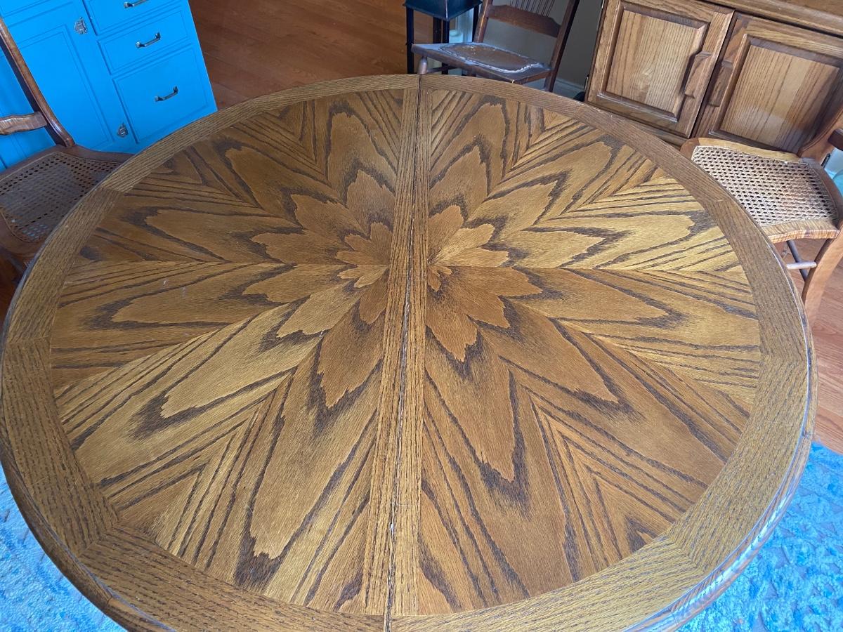 Beautiful vintage solid oak clawfoot pedestal dining table with one 24” leaf built-in. Table opens w/gear system. Excellent condition. 47”round x 30”h. When open it is 72”L oval.