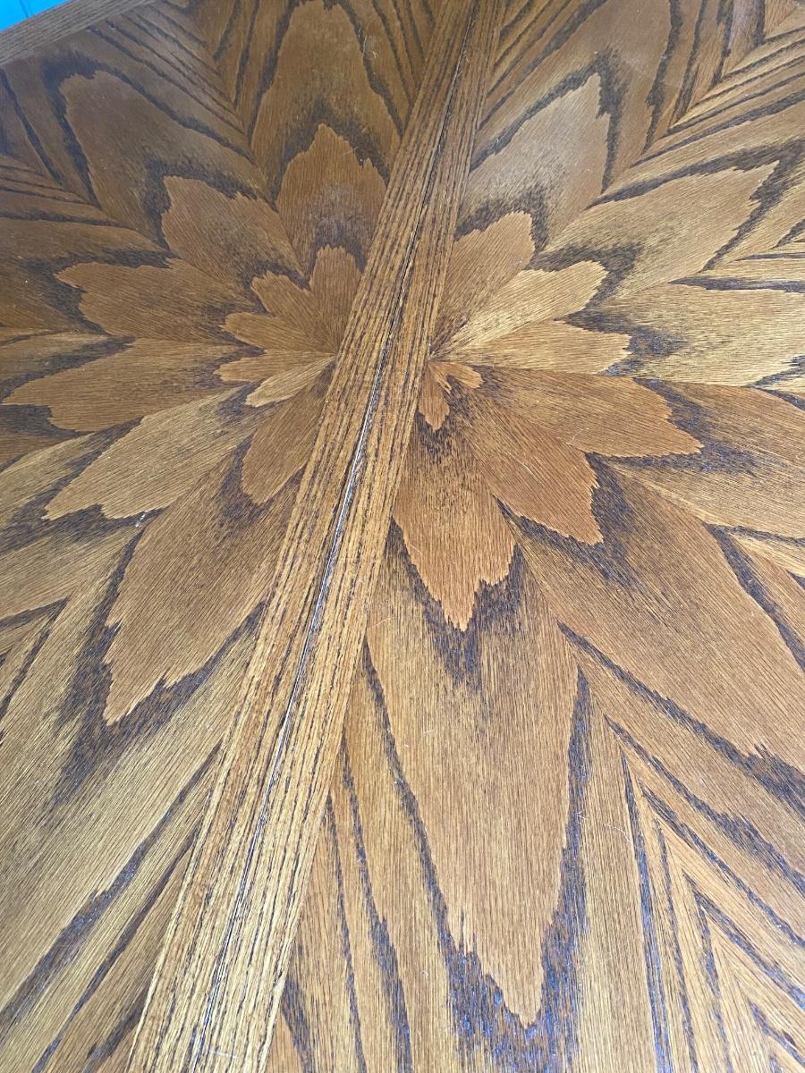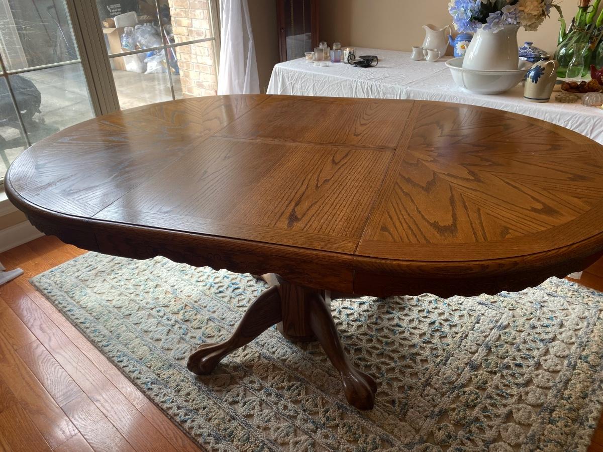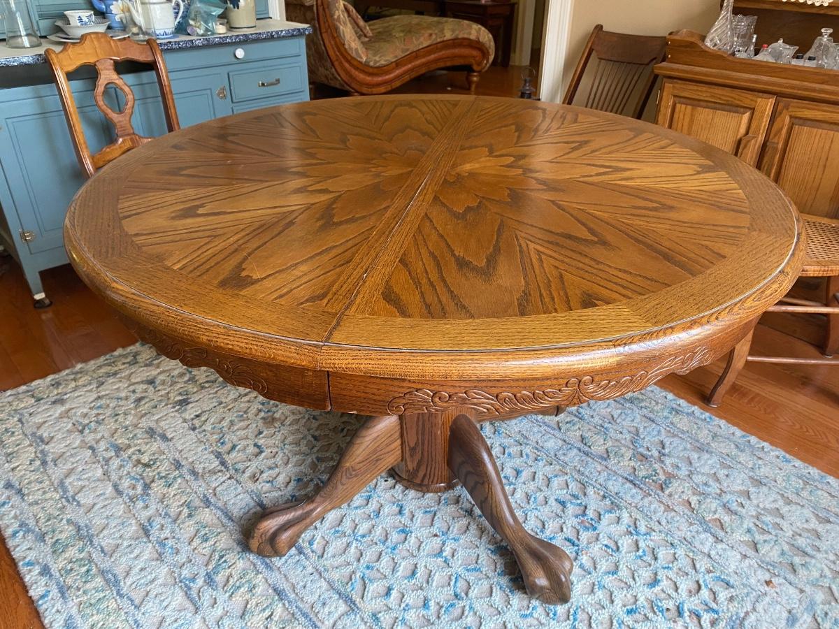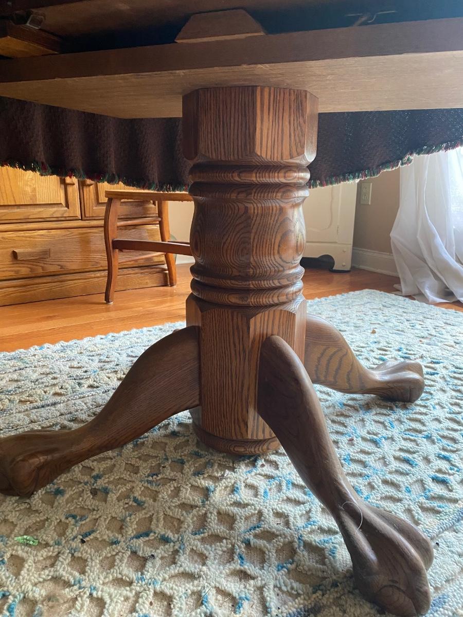Beautiful vintage solid oak clawfoot pedestal dining table with one 24” leaf