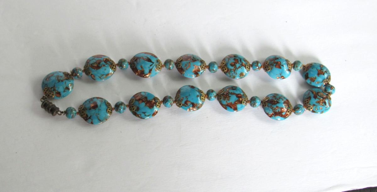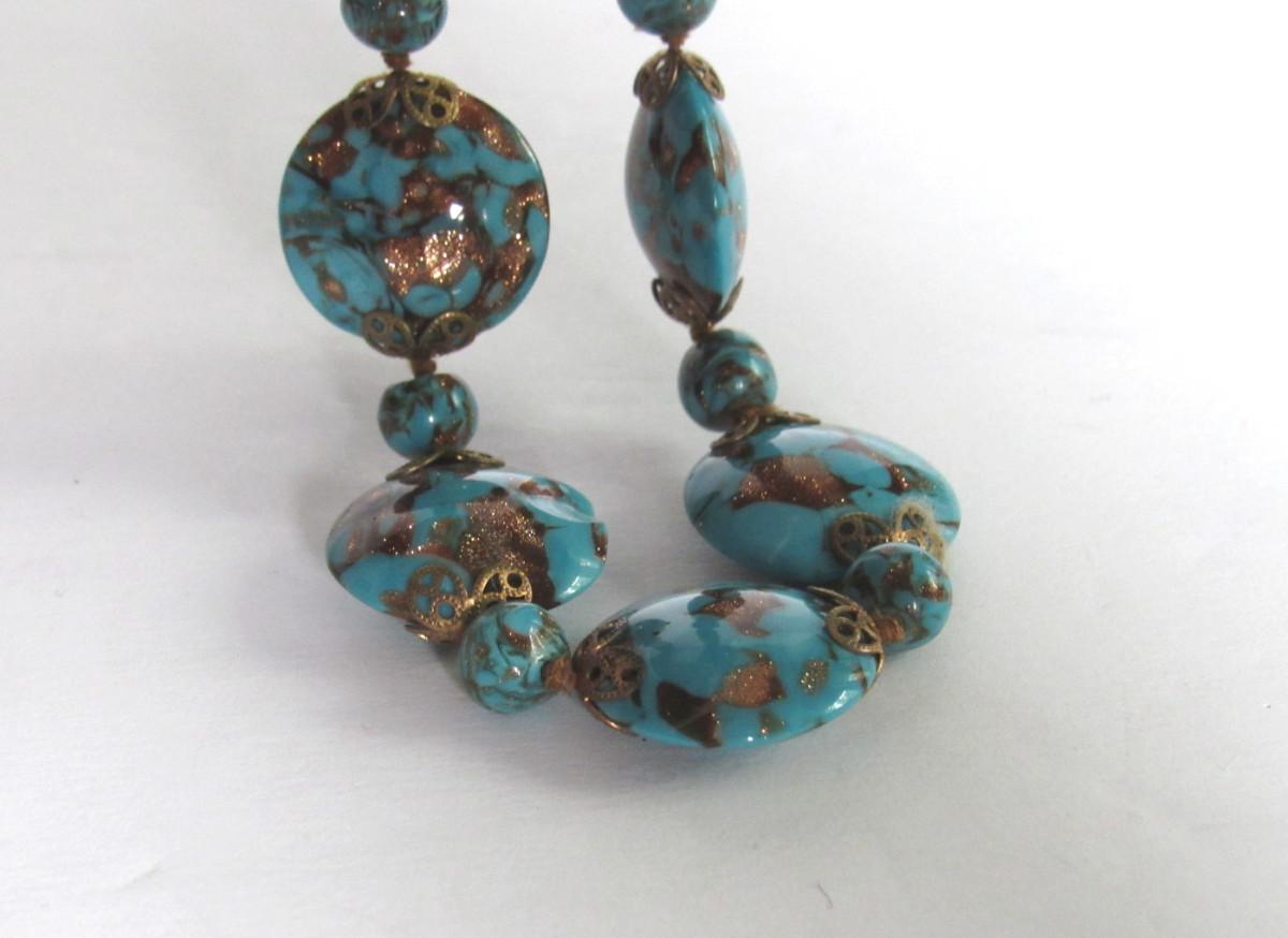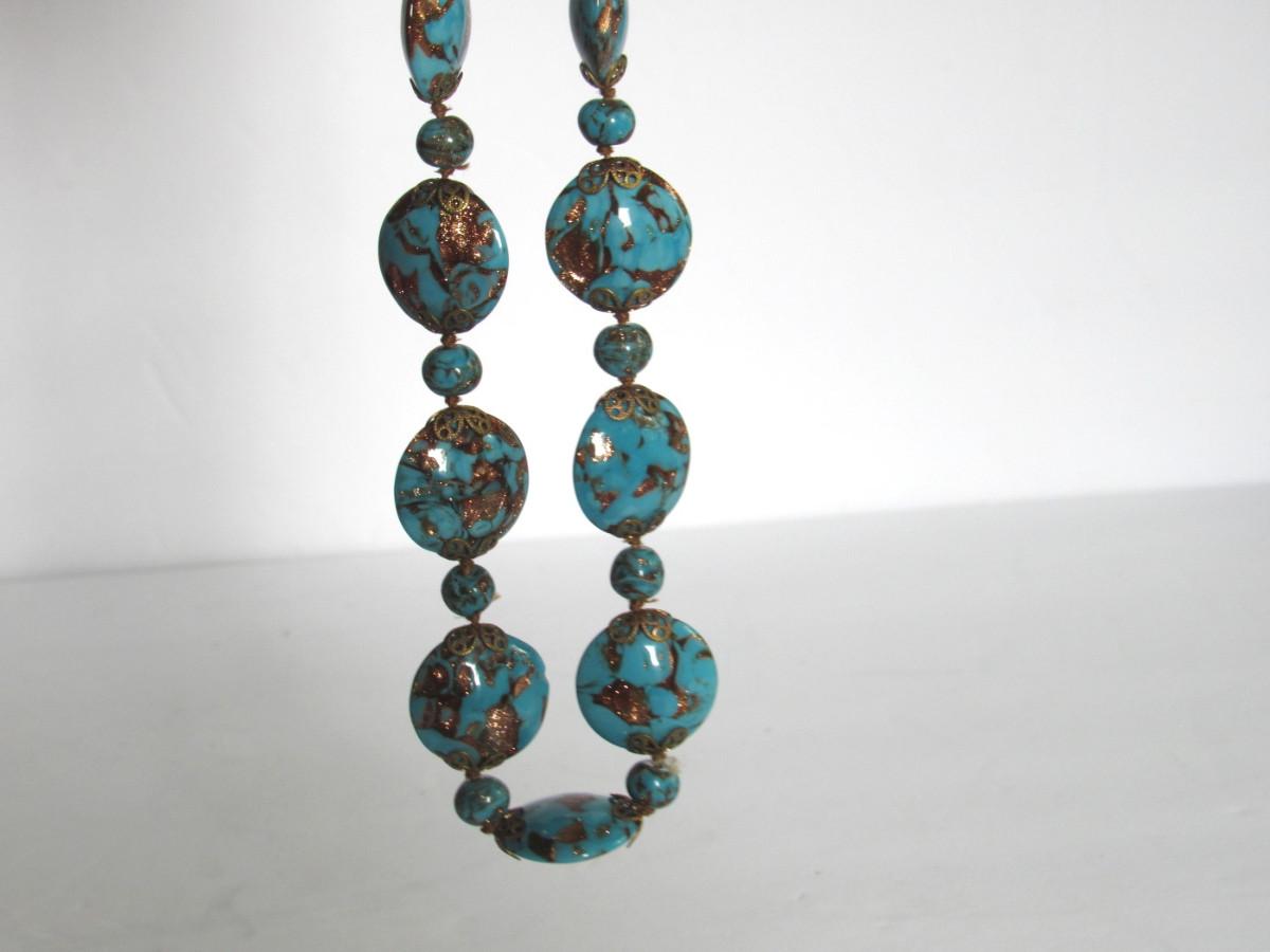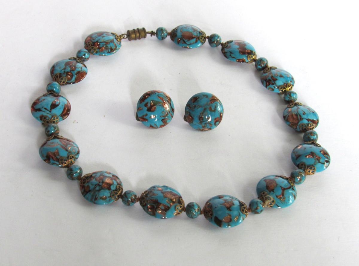 I found something similar online (a different shade of blue for $98) that called this Murano Art Glass. I am no expert - you will have to decide for yourself. It looks like a multi colored blue stone or glass with copper colored sandstone. This is a beautiful matching set, just marked Italy. Barrel clasp. Shipping is available at actual shipping cost plus $5.00 handling fee per box for supplies/labor. See our terms for details. All sales are final. Condition notes may not be all inclusive, we may miss some issues as most vintage items are not in mint condition and have some degree of wear, paint loss, etc, but we always try to note obvious damage.