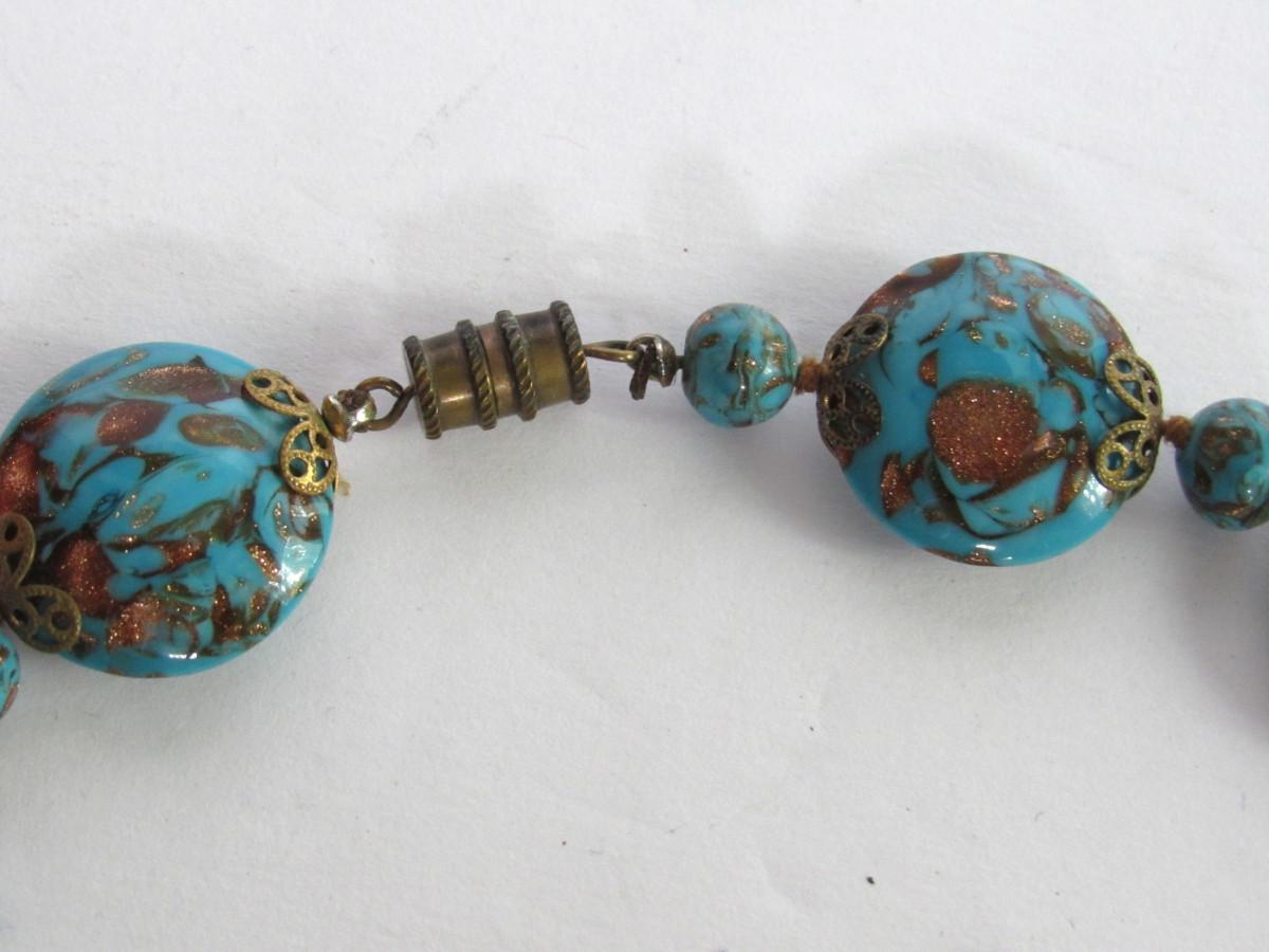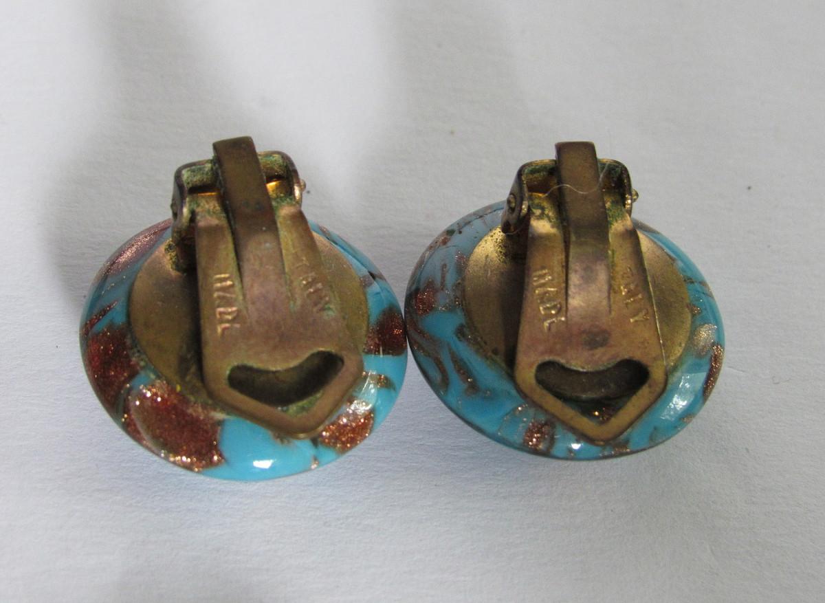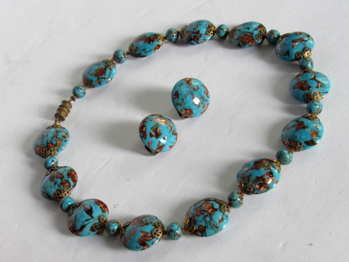 I found something similar online (a different shade of blue for $98) that called this Murano Art Glass. I am no expert - you will have to decide for yourself. It looks like a multi colored blue stone or glass with copper colored sandstone. This is a beautiful matching set, just marked Italy. Barrel clasp. Shipping is available at actual shipping cost plus $5.00 handling fee per box for supplies/labor. See our terms for details. All sales are final. Condition notes may not be all inclusive, we may miss some issues as most vintage items are not in mint condition and have some degree of wear, paint loss, etc, but we always try to note obvious damage.