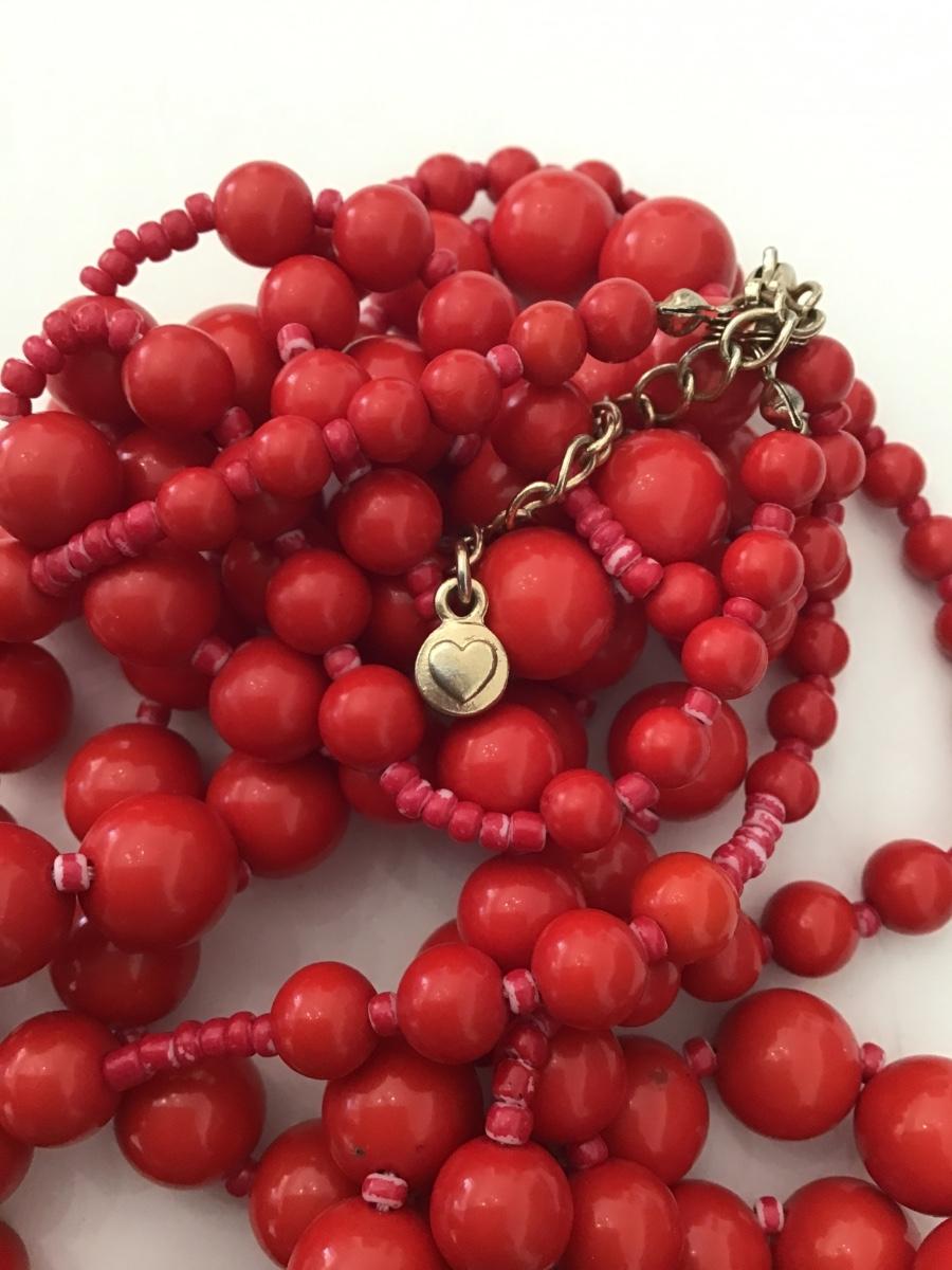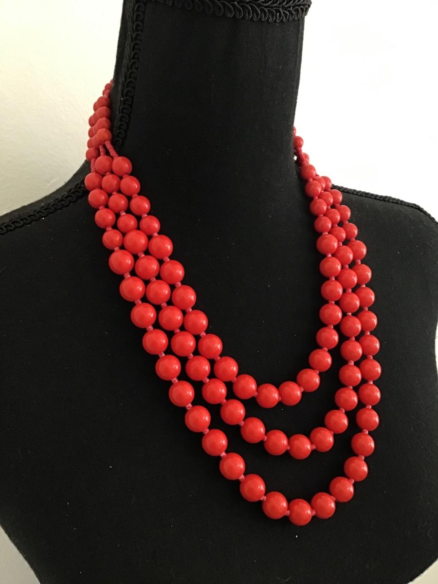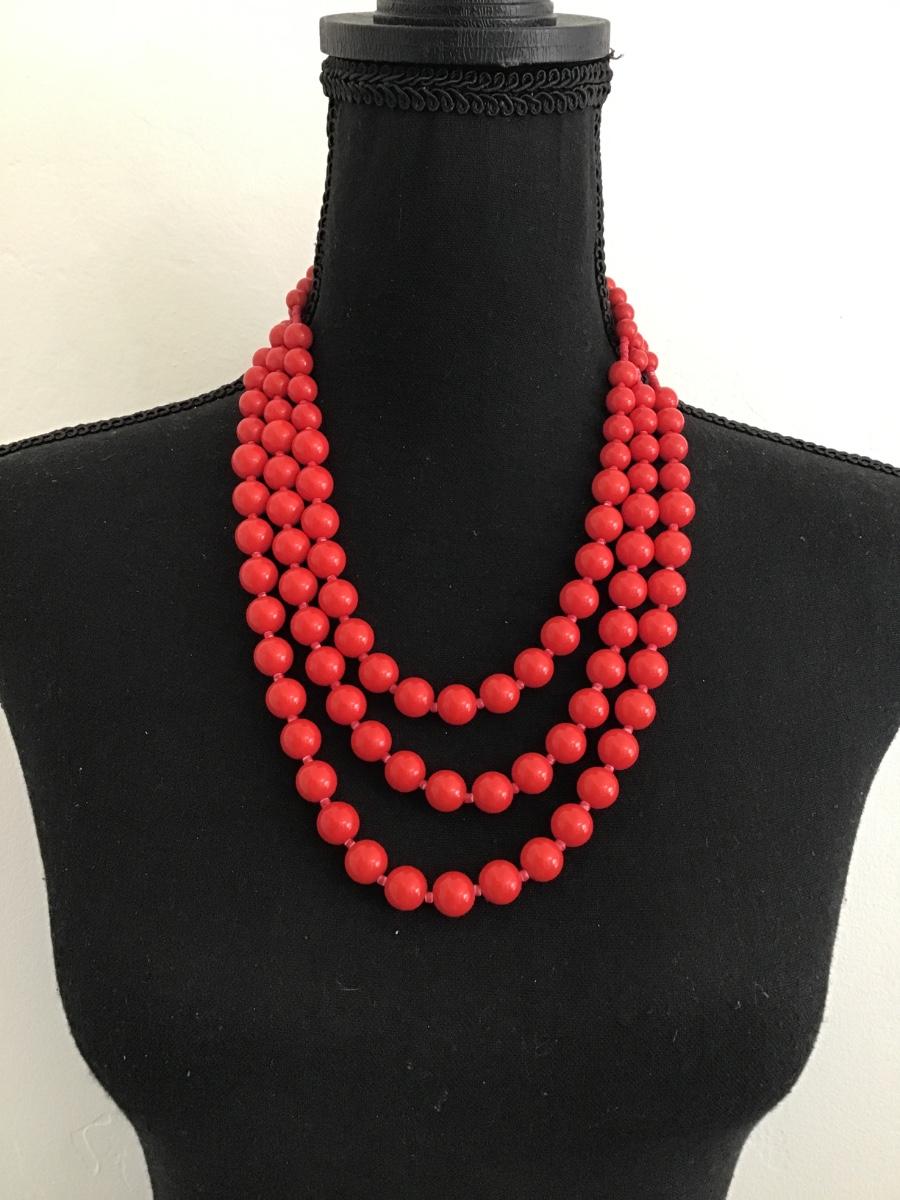 Beautiful Vintage three strand cherry red beaded statement necklace signed