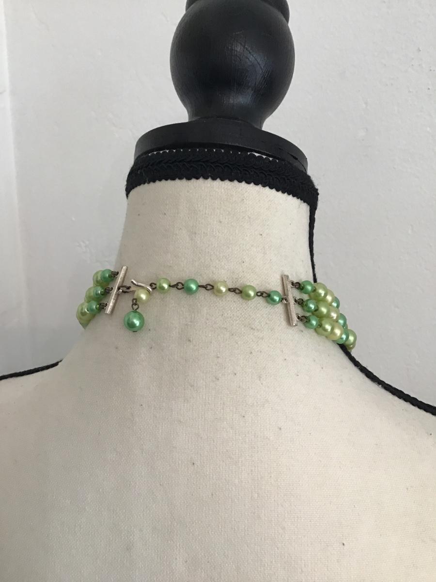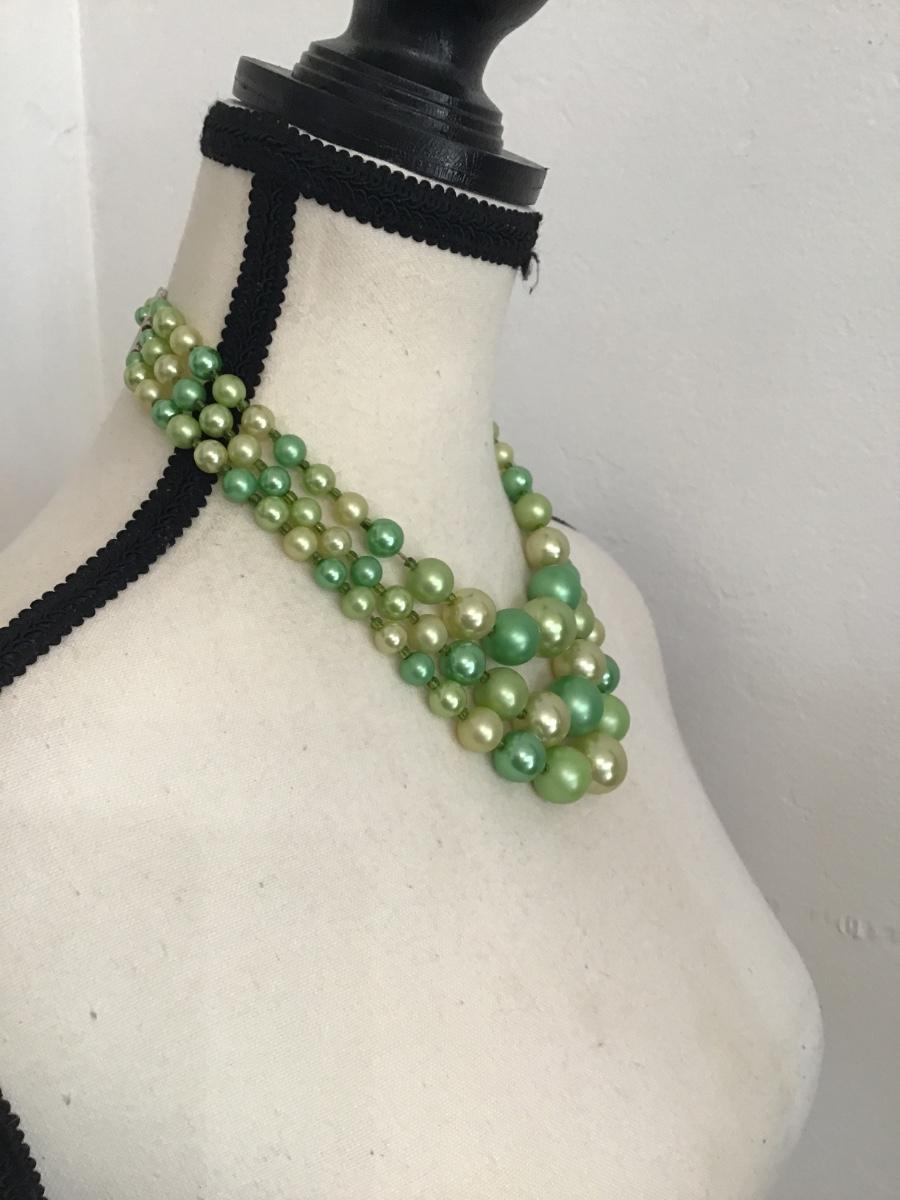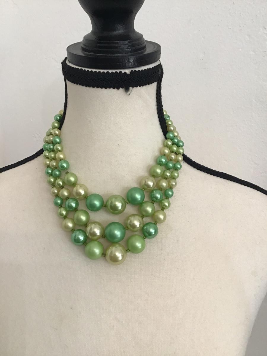 Beautiful vintage, triple strand necklace with beads shades of different green and cream
