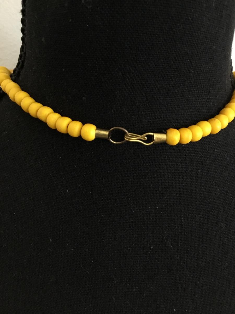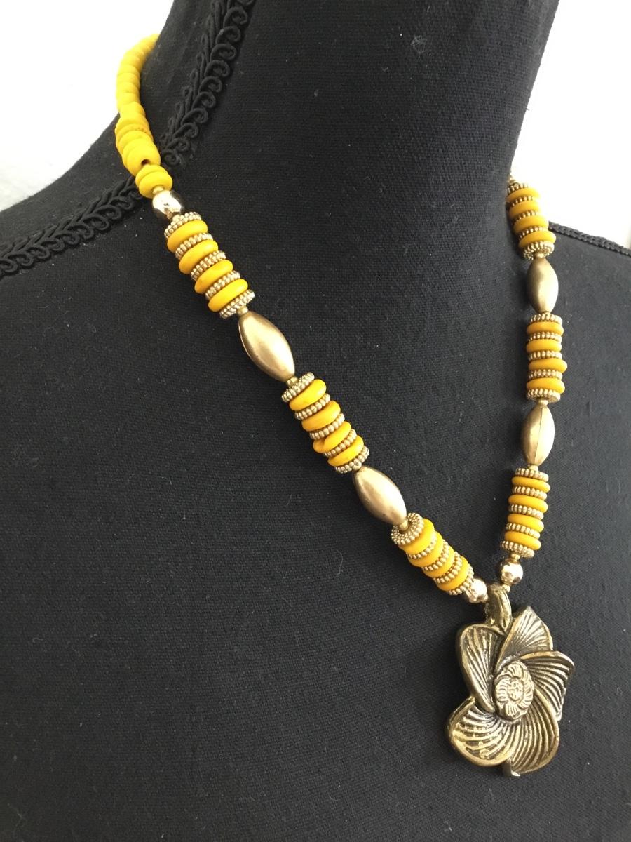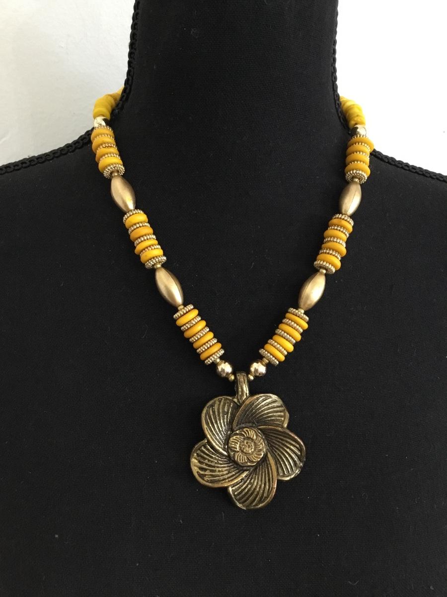 Beautiful, vintage, yellow beaded gold beaded necklace with bronze gold flower pendant