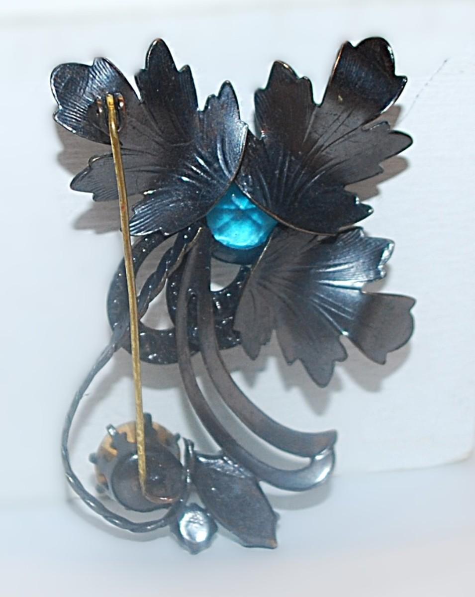 Beautiful Vintage-Style Rust & Black BEJEWELED BROOCH (2¾" x 2") with Large Blue and Clear Stone Accents on a Dark Setting