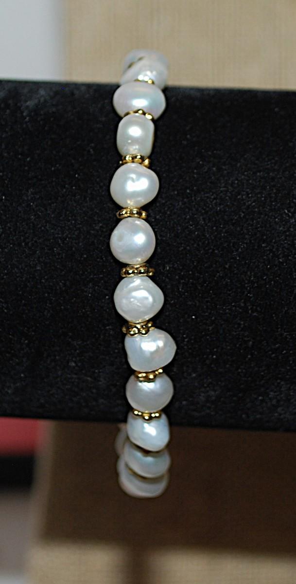 Beautiful White Faux PEARLS BRACELET (2" Opening) with Brushed Gold-Tone HEART, Spacers and Toggle Clasp