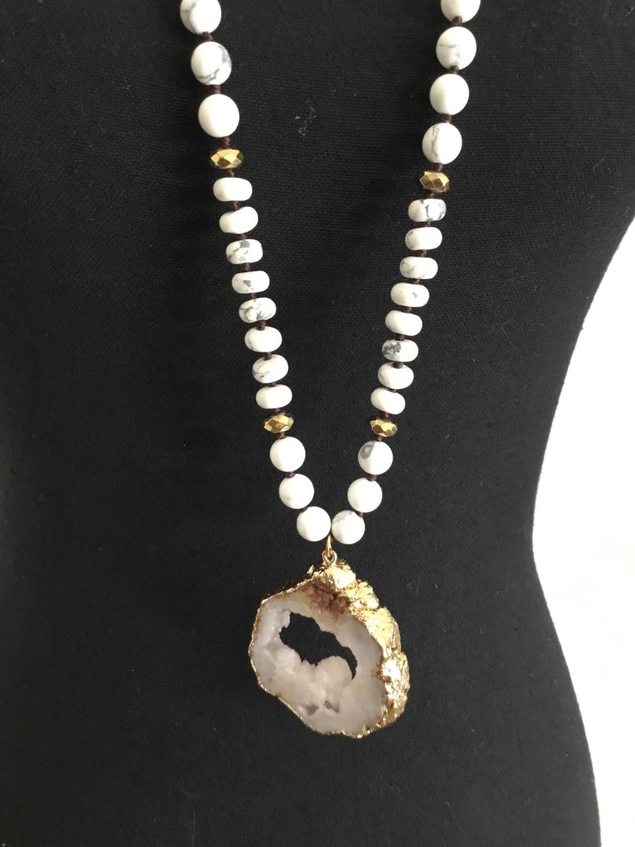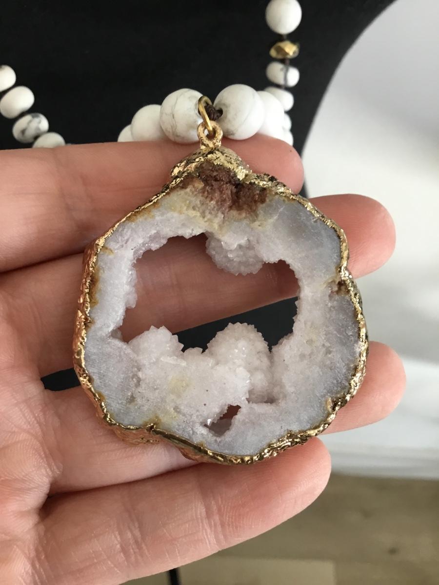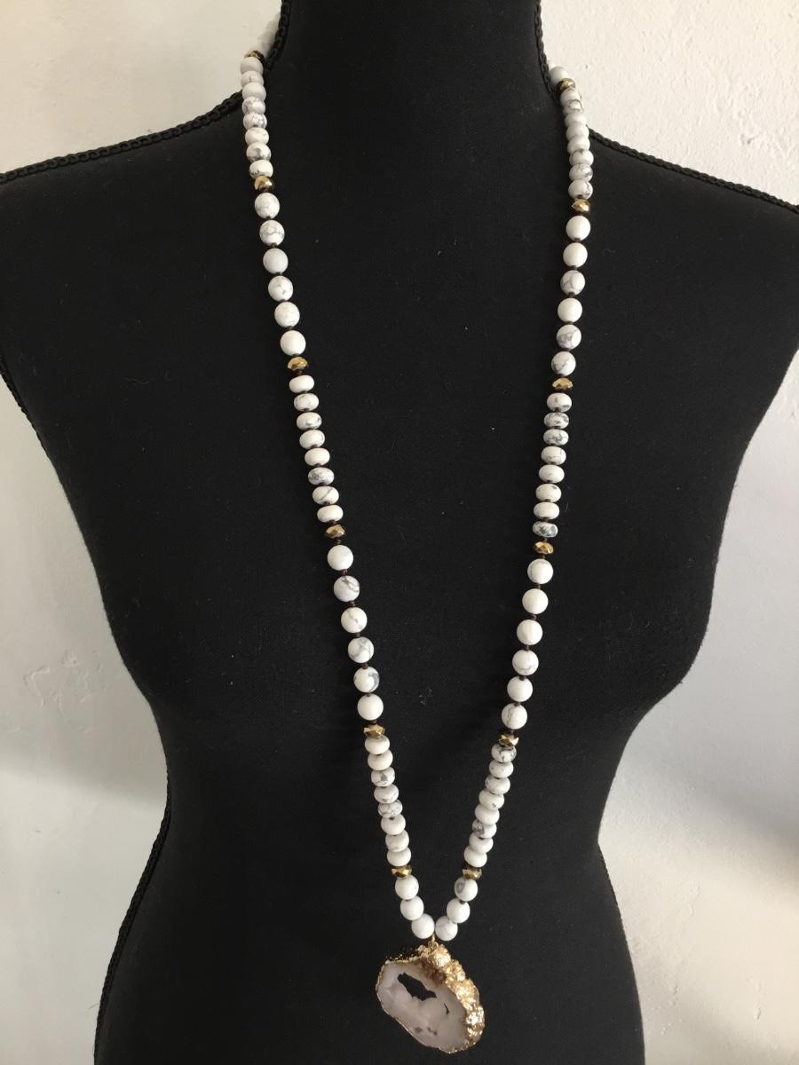 Beautiful white & gray stone beaded necklace with gorgeous, crystal stone pendant
