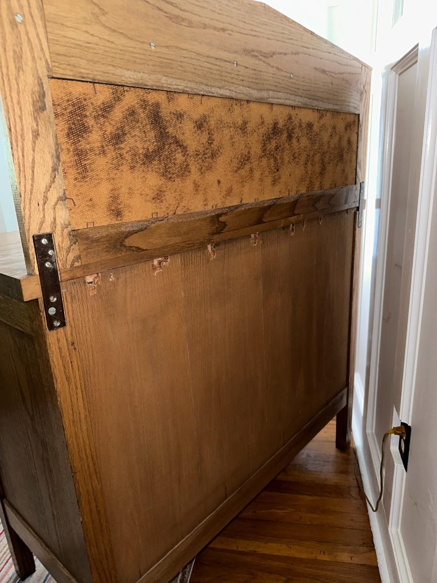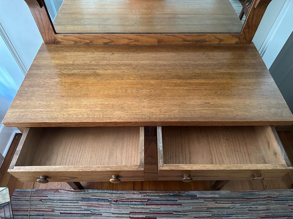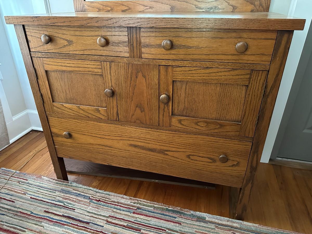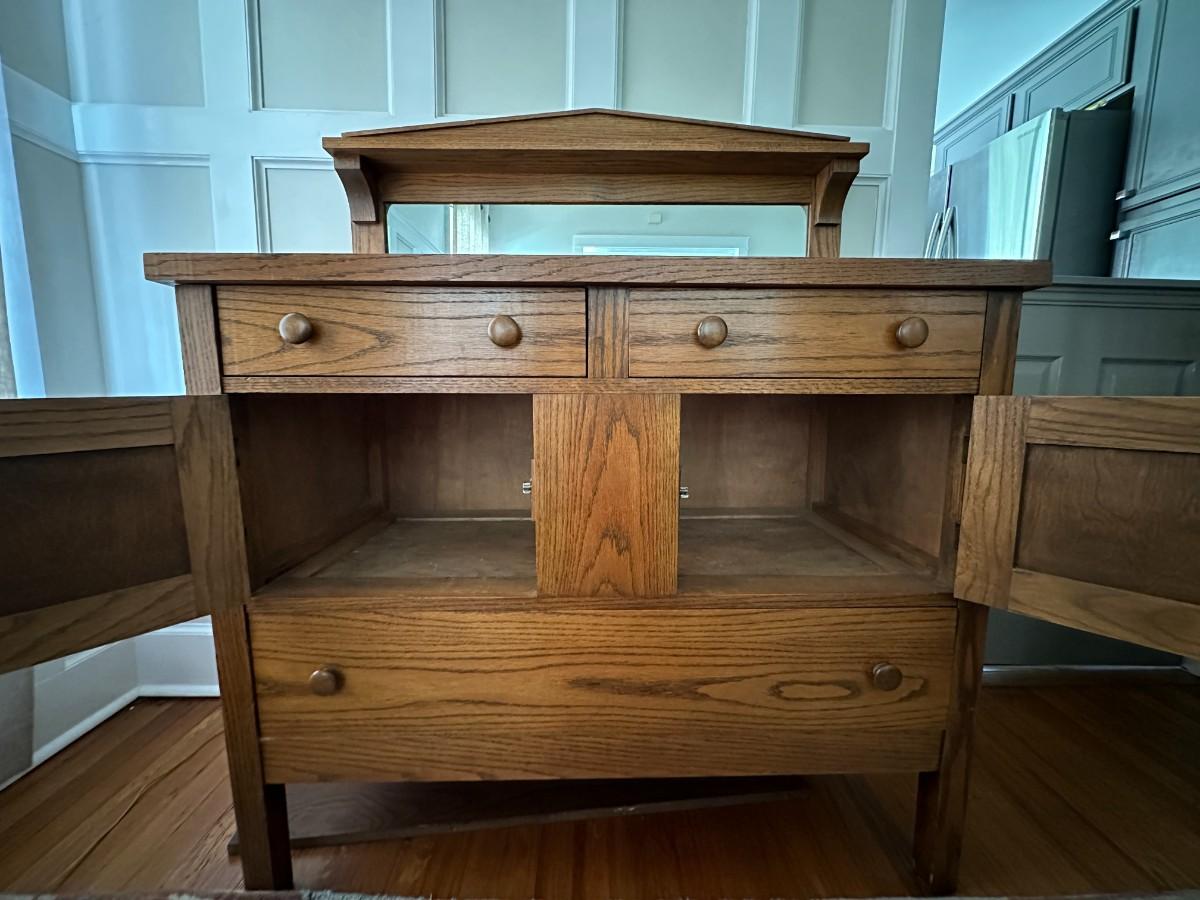 Sideboard features 2 small drawers, 2 doors, and one long drawer. Top has a minor water stain, hardly visible to the eye. 42"w x 20"d x 53"h