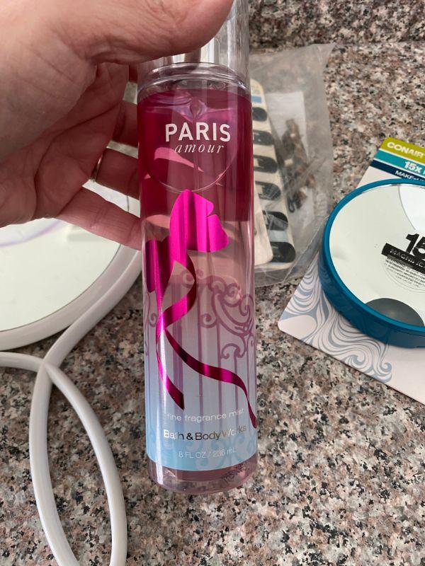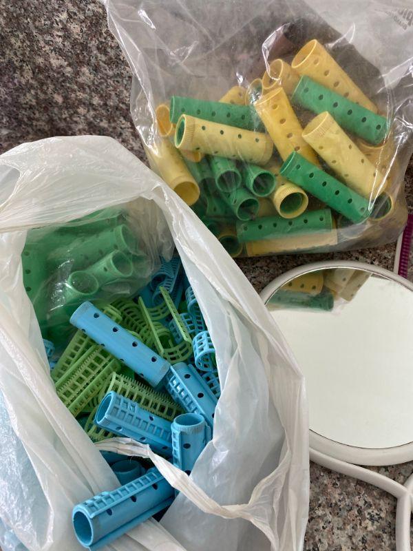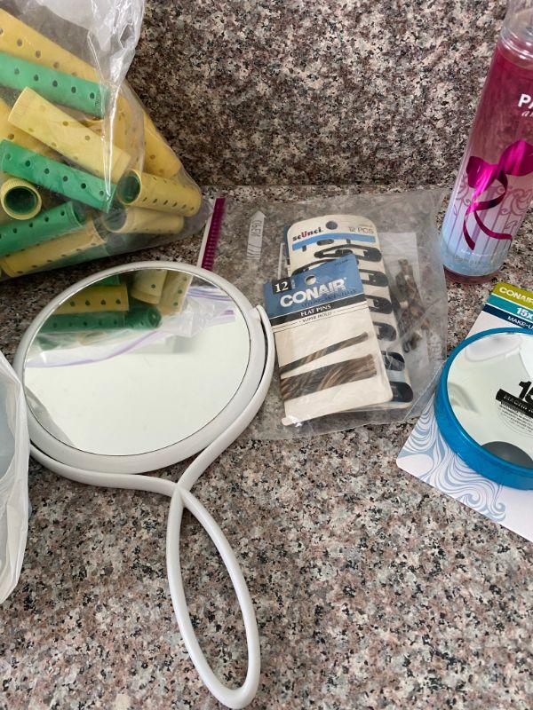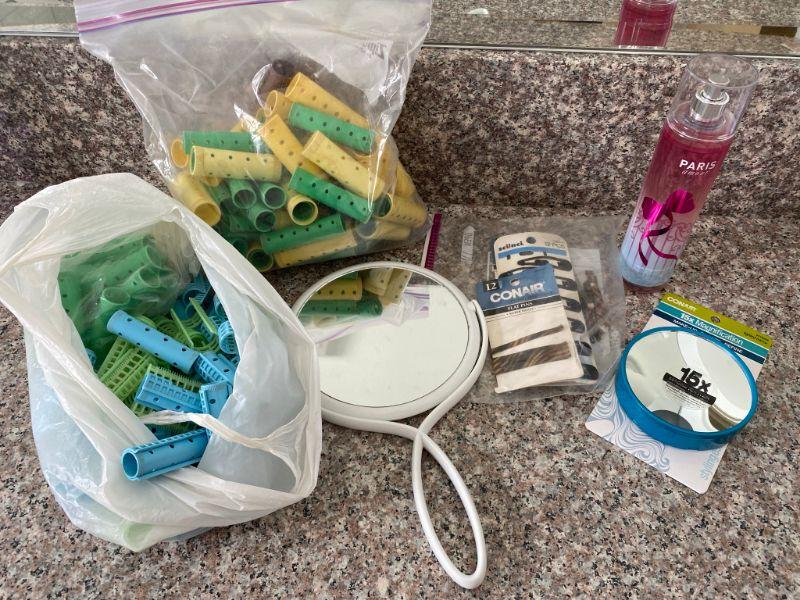 Lot of beauty supplies. A lot of plastic hair curlers, various sizes, a couple of mirrors, bobby pins & barrettes, and a full bottle of Bath & Body Works body spray in Paris Amour.
