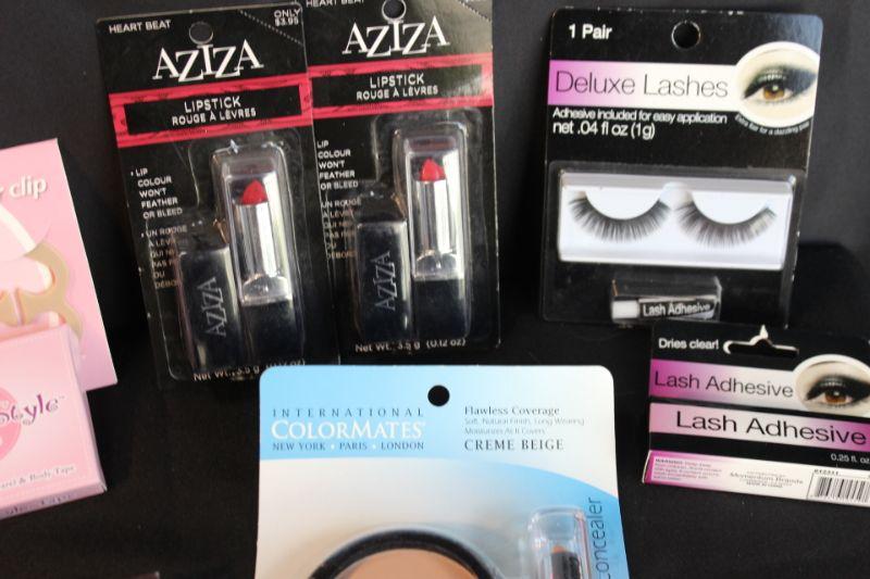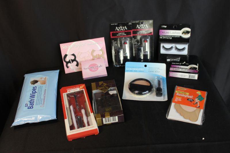 Beauty items lot. New unopened packages. Lipstick, powder, false eyelashes, manicure sets, Bra strap converters, bootie nylon socks, and a pack of wipes.