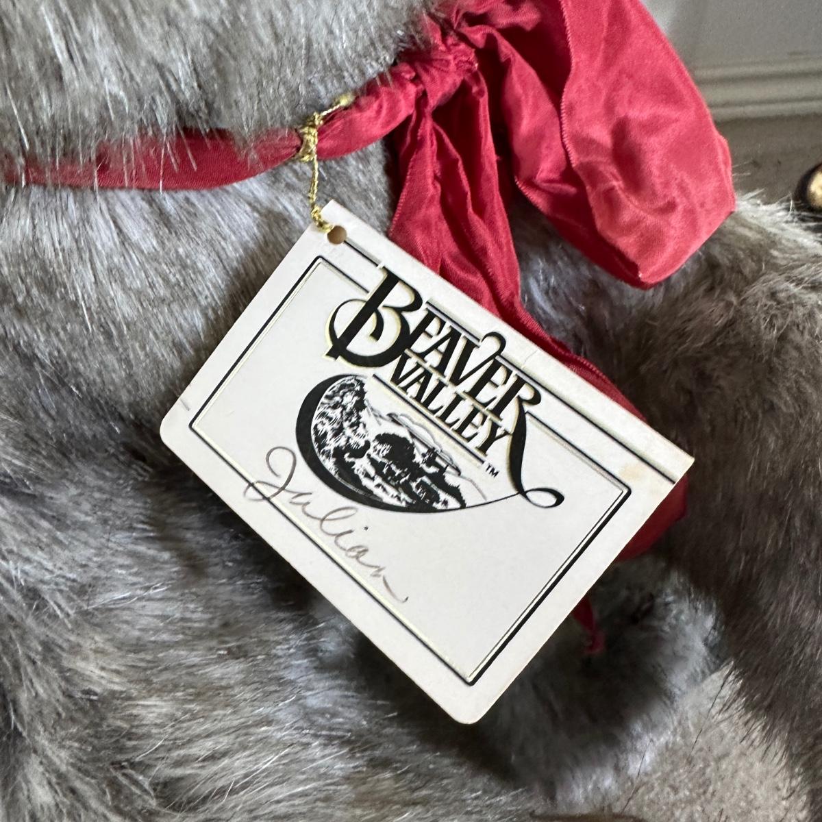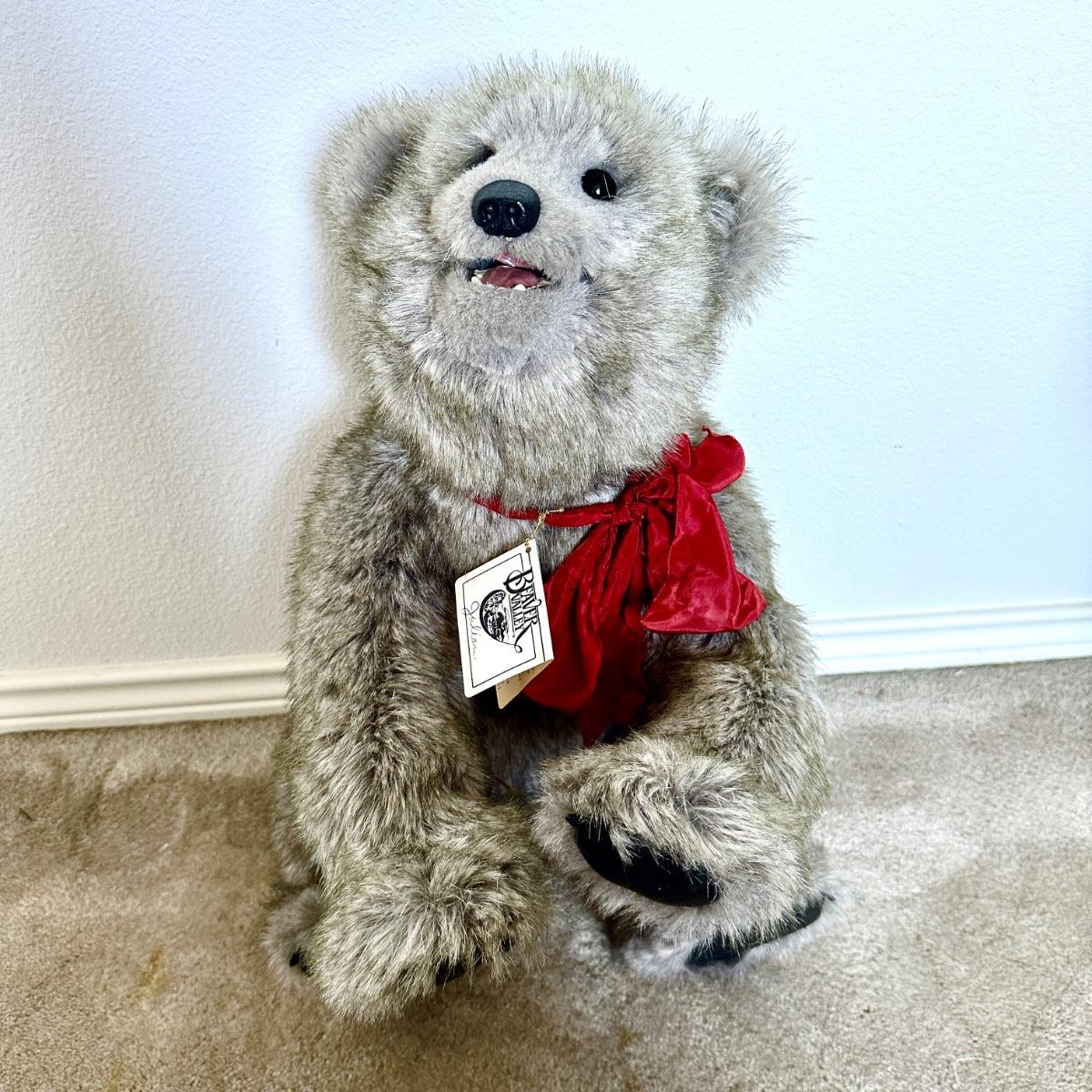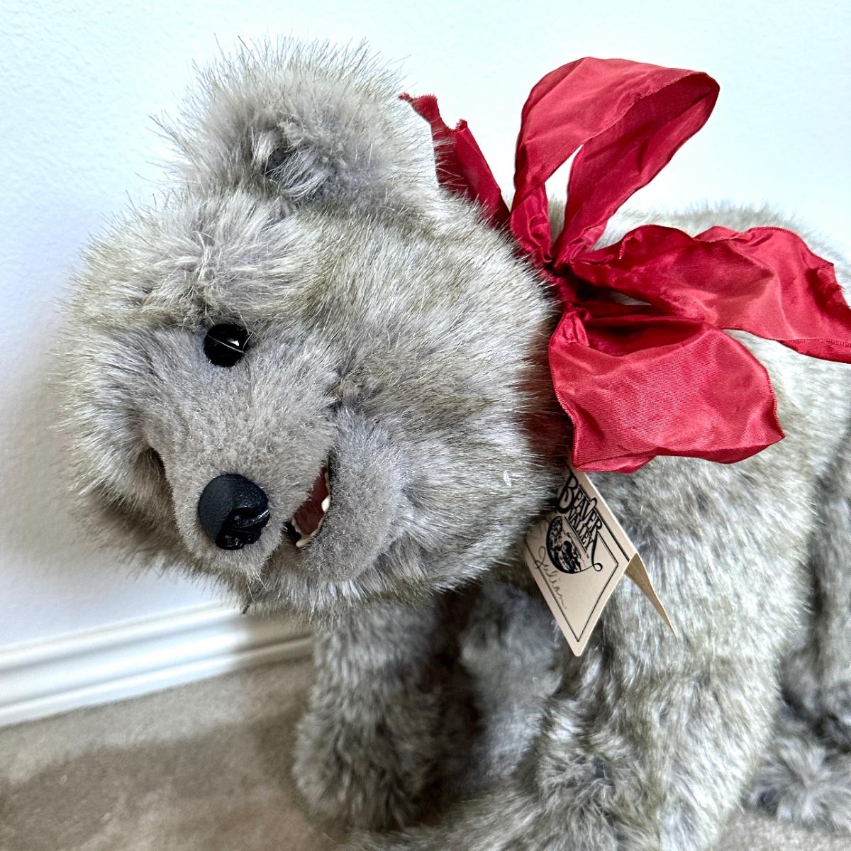 Julian from Beaver Valley. He has glass eyes, handmade nose, hinged mouth with teeth, hand cast claws and flexible armature. Made with acrylic fur in gray. Wears a red ribbon 13 inches tall