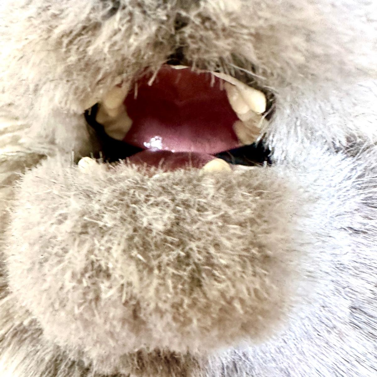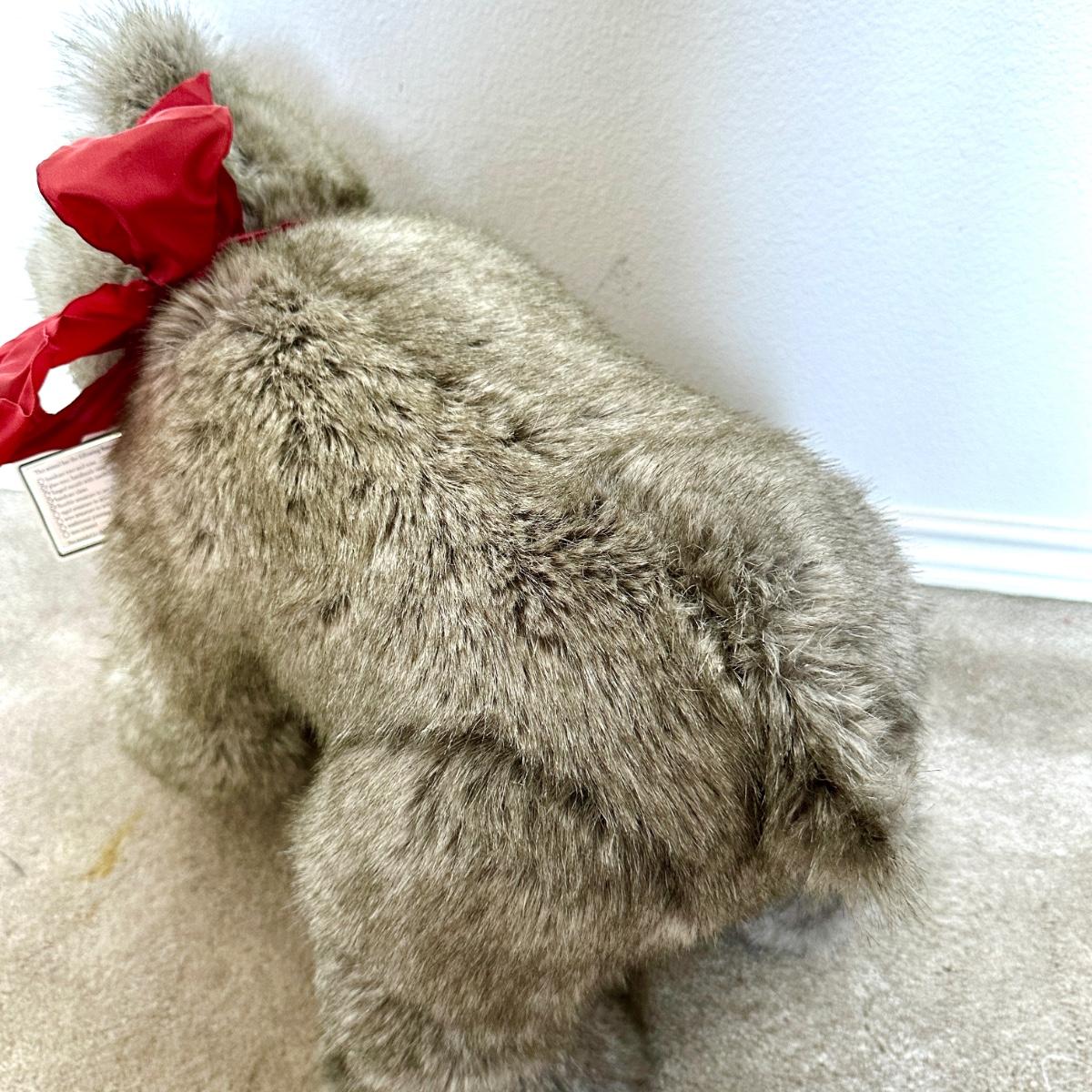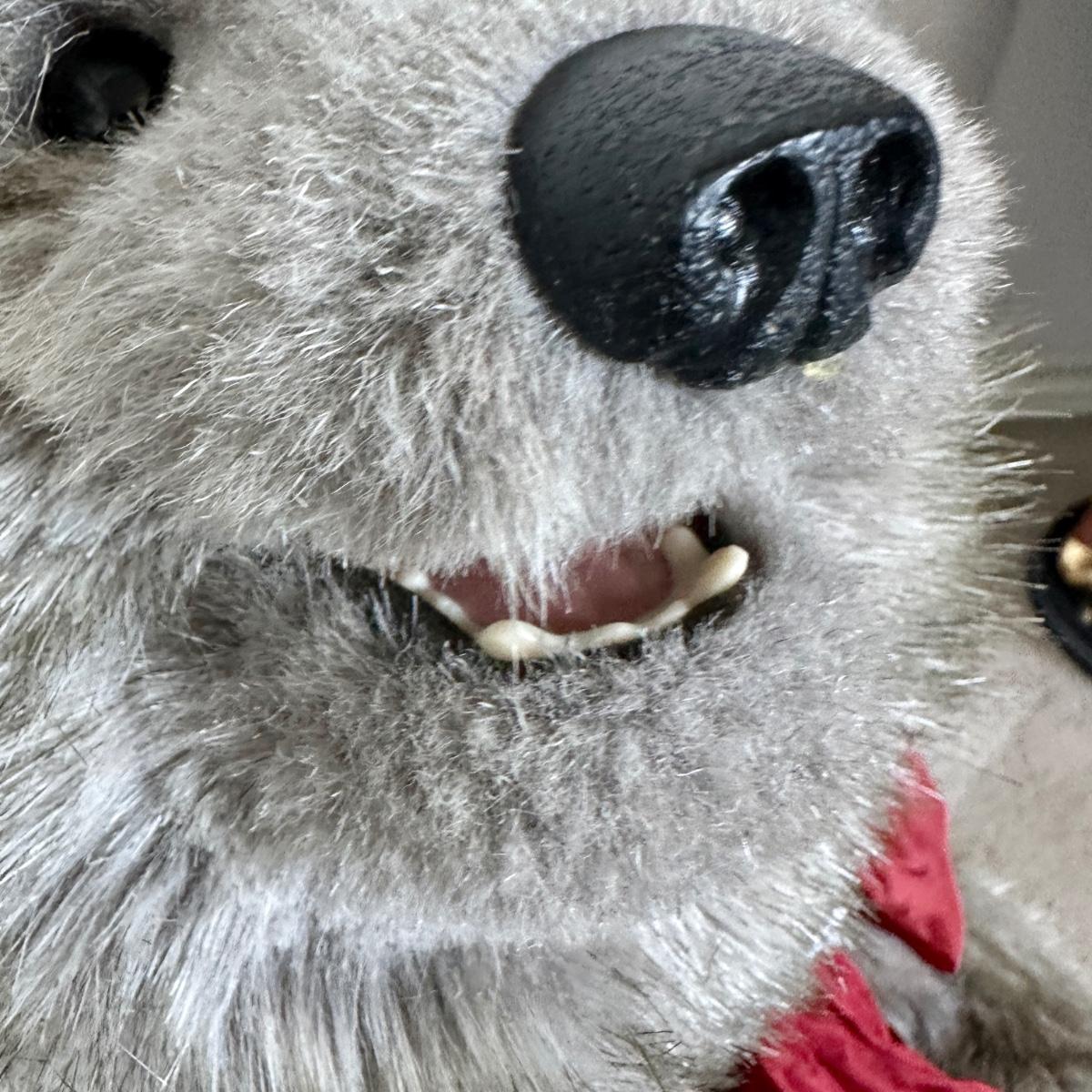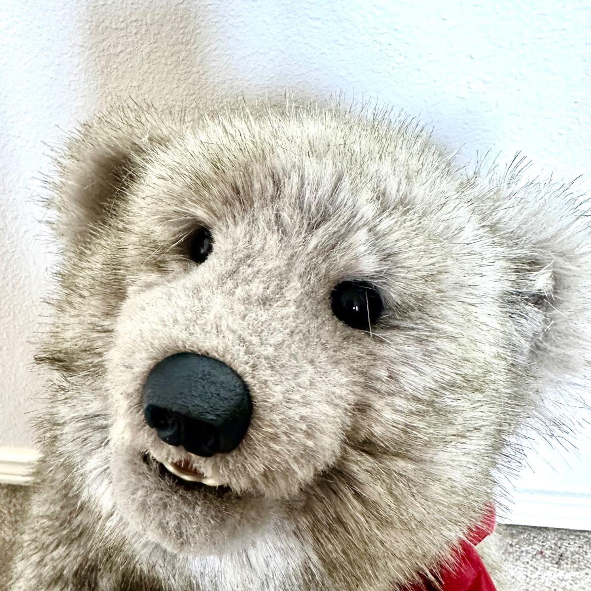 Julian from Beaver Valley. He has glass eyes, handmade nose, hinged mouth with teeth, hand cast claws and flexible armature. Made with acrylic fur in gray. Wears a red ribbon 13 inches tall