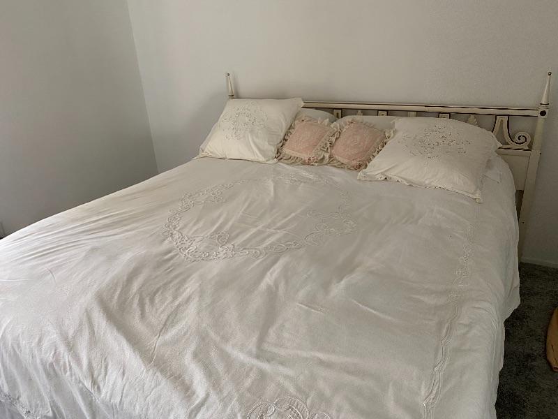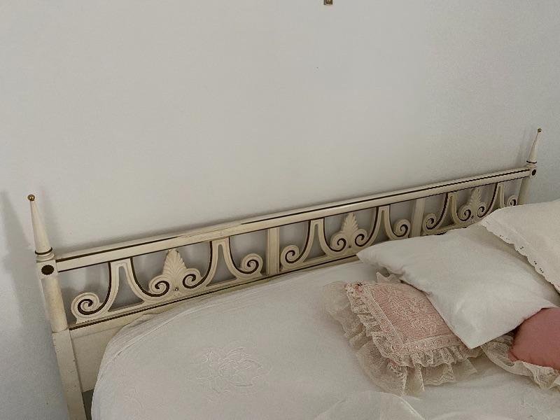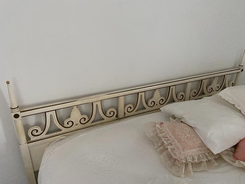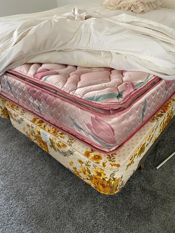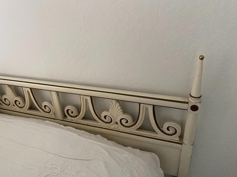 Vintage French Provincial king size headboard with bed. Mattress are older.