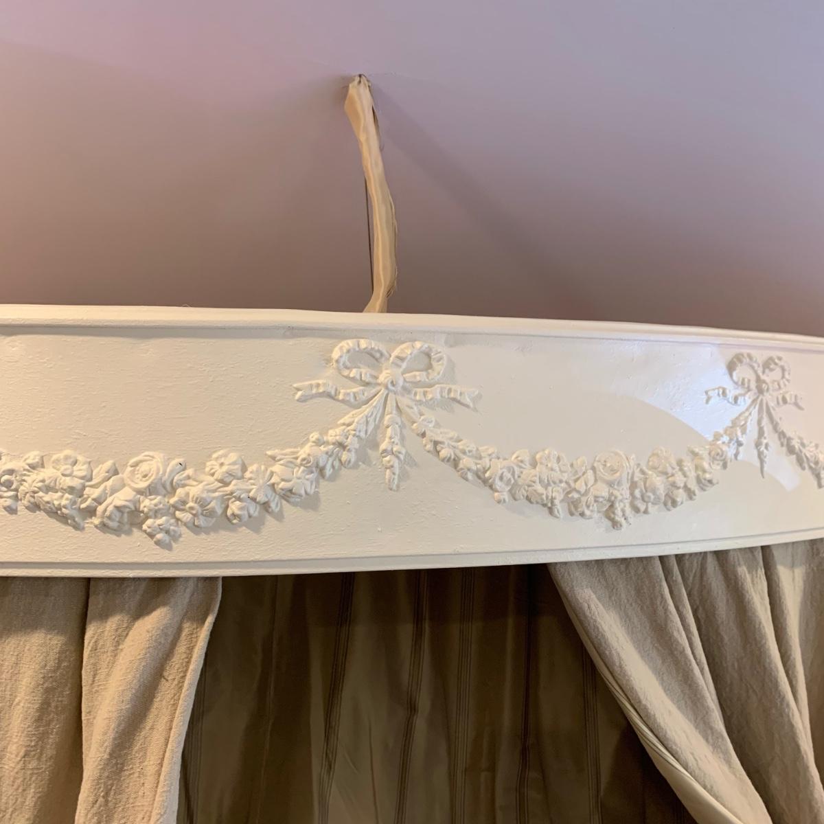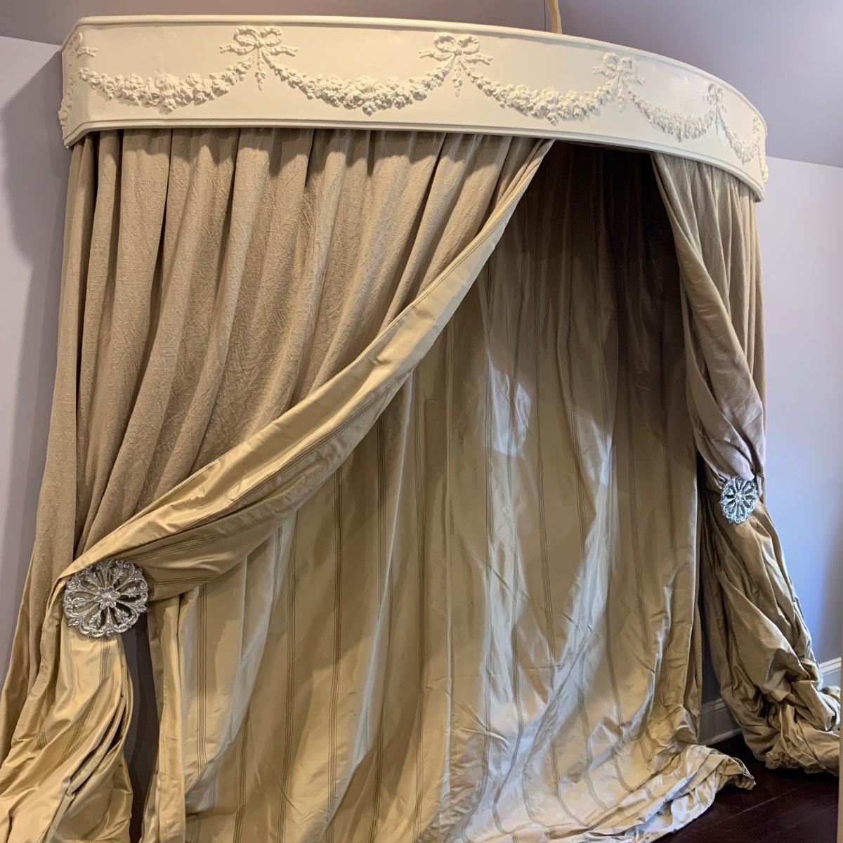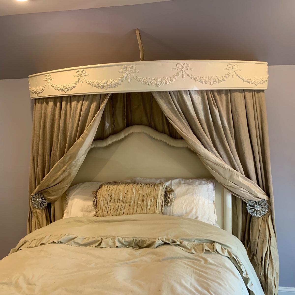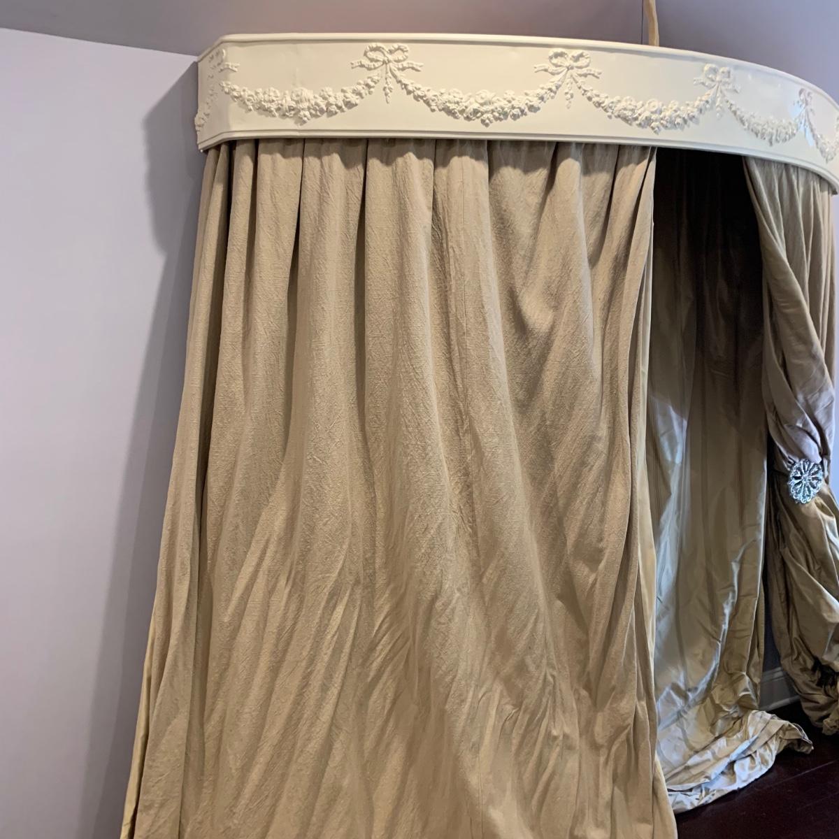 Bed canopy with a cream crow. frame that feels slightly soft to the touch and cloth panels that appear to be linen. There are three cloth panels “” two side curtains and one back panel. The curtains are held back with rhinestone studded holdbacks. Each side curtain is approximately 81” x 120”H. White frame is approximately 83” x 25” x 9”H. Frame has a wood base. The fabric has come detached from parts of the frame and will need to be reattached.