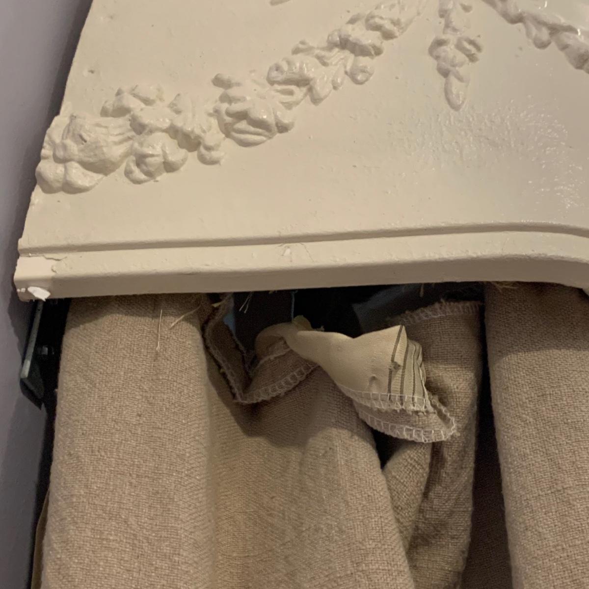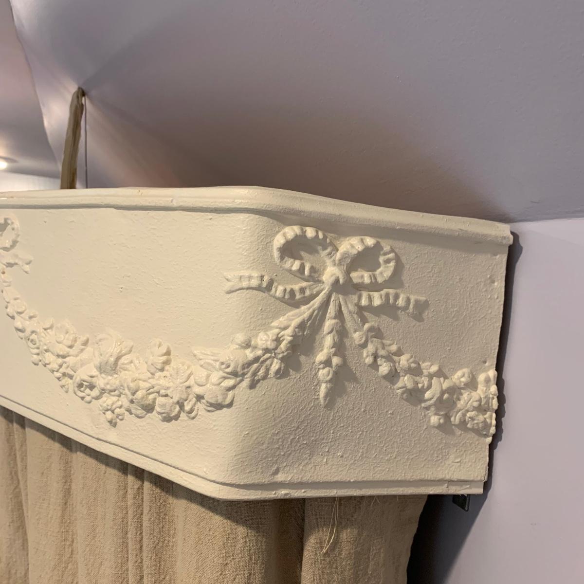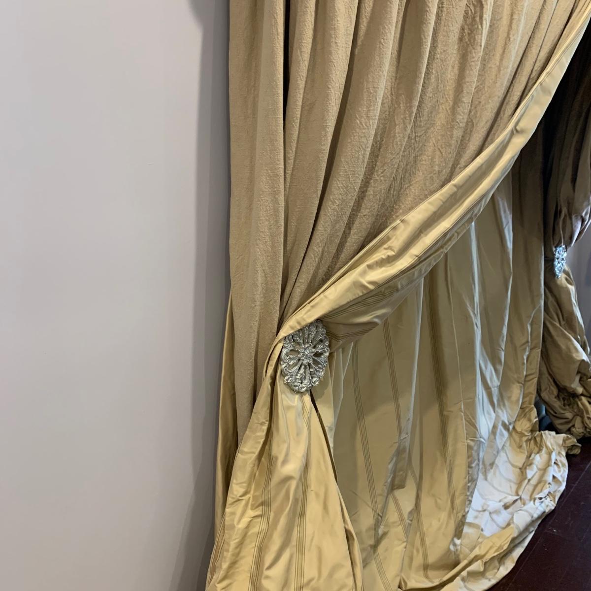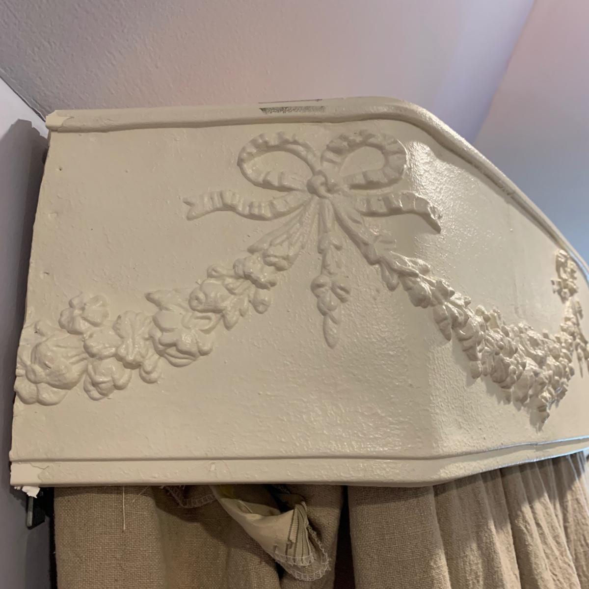 Bed canopy with a cream crow. frame that feels slightly soft to the touch and cloth panels that appear to be linen. There are three cloth panels “” two side curtains and one back panel. The curtains are held back with rhinestone studded holdbacks. Each side curtain is approximately 81” x 120”H. White frame is approximately 83” x 25” x 9”H. Frame has a wood base. The fabric has come detached from parts of the frame and will need to be reattached.