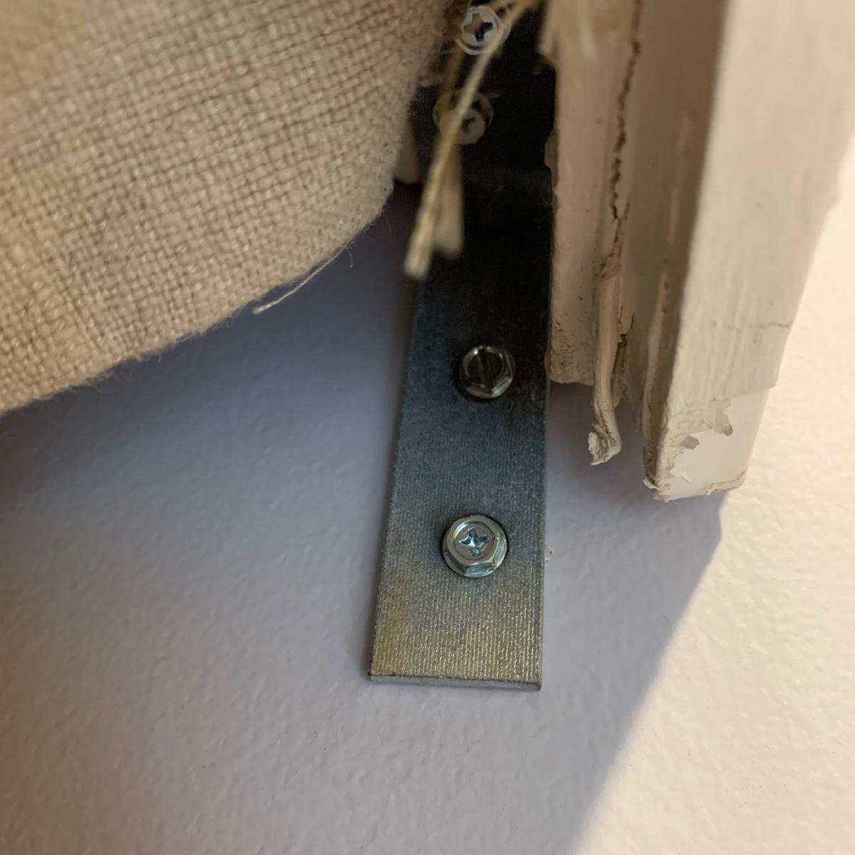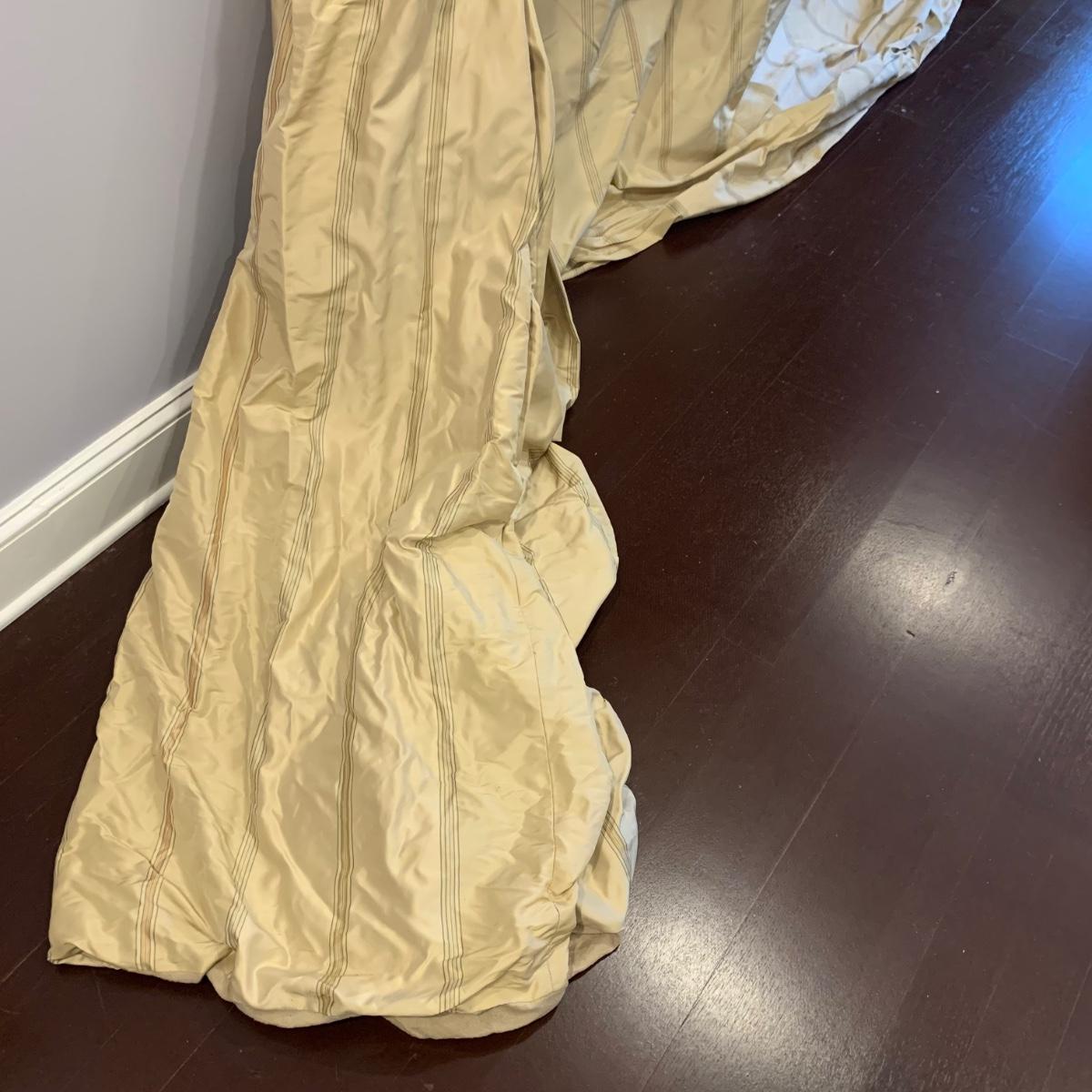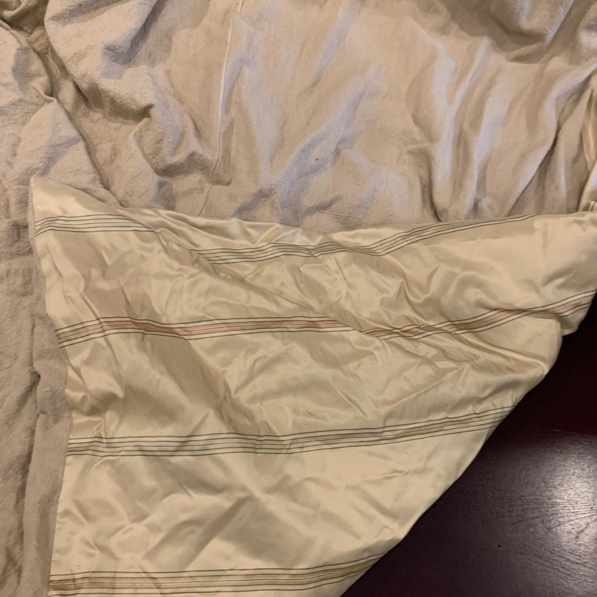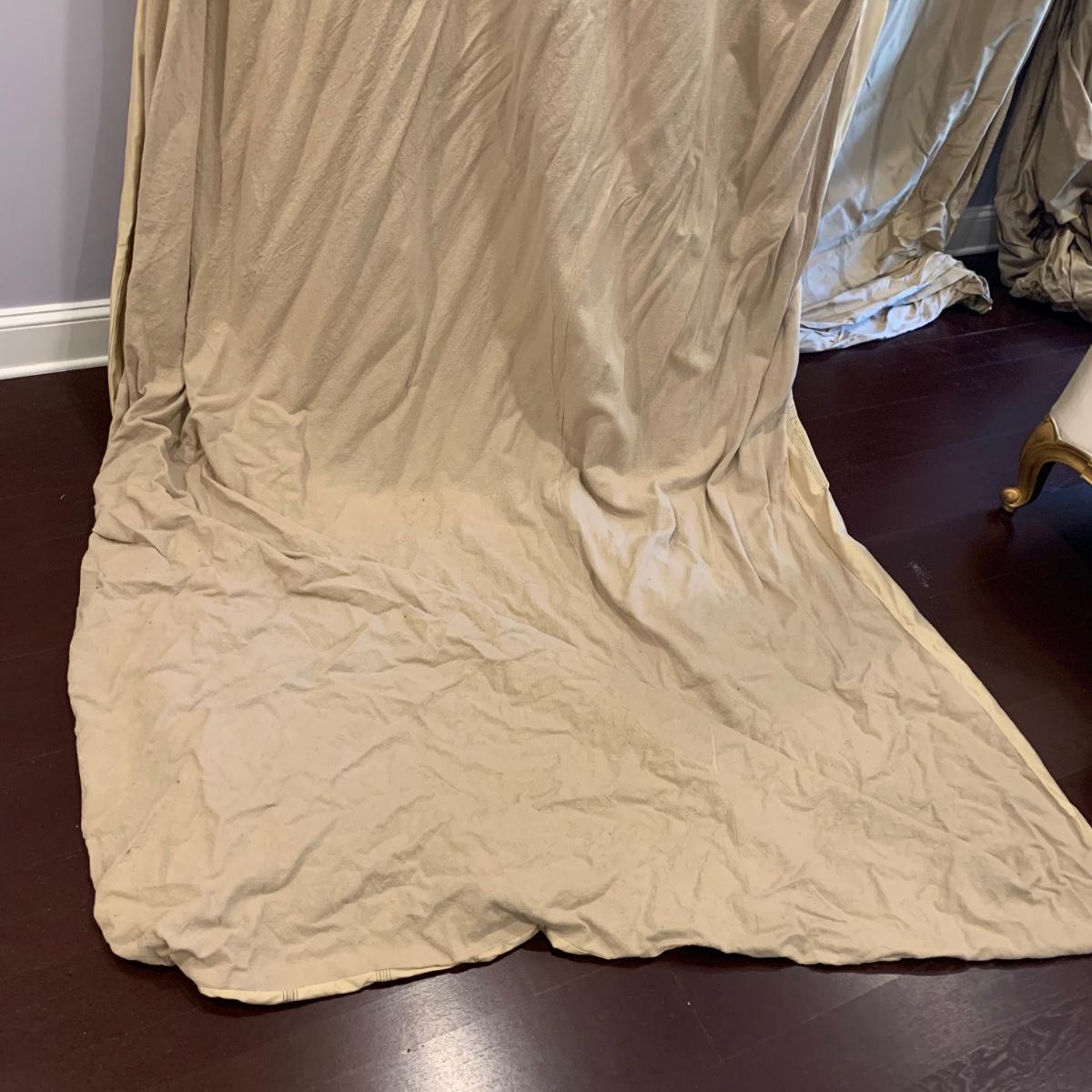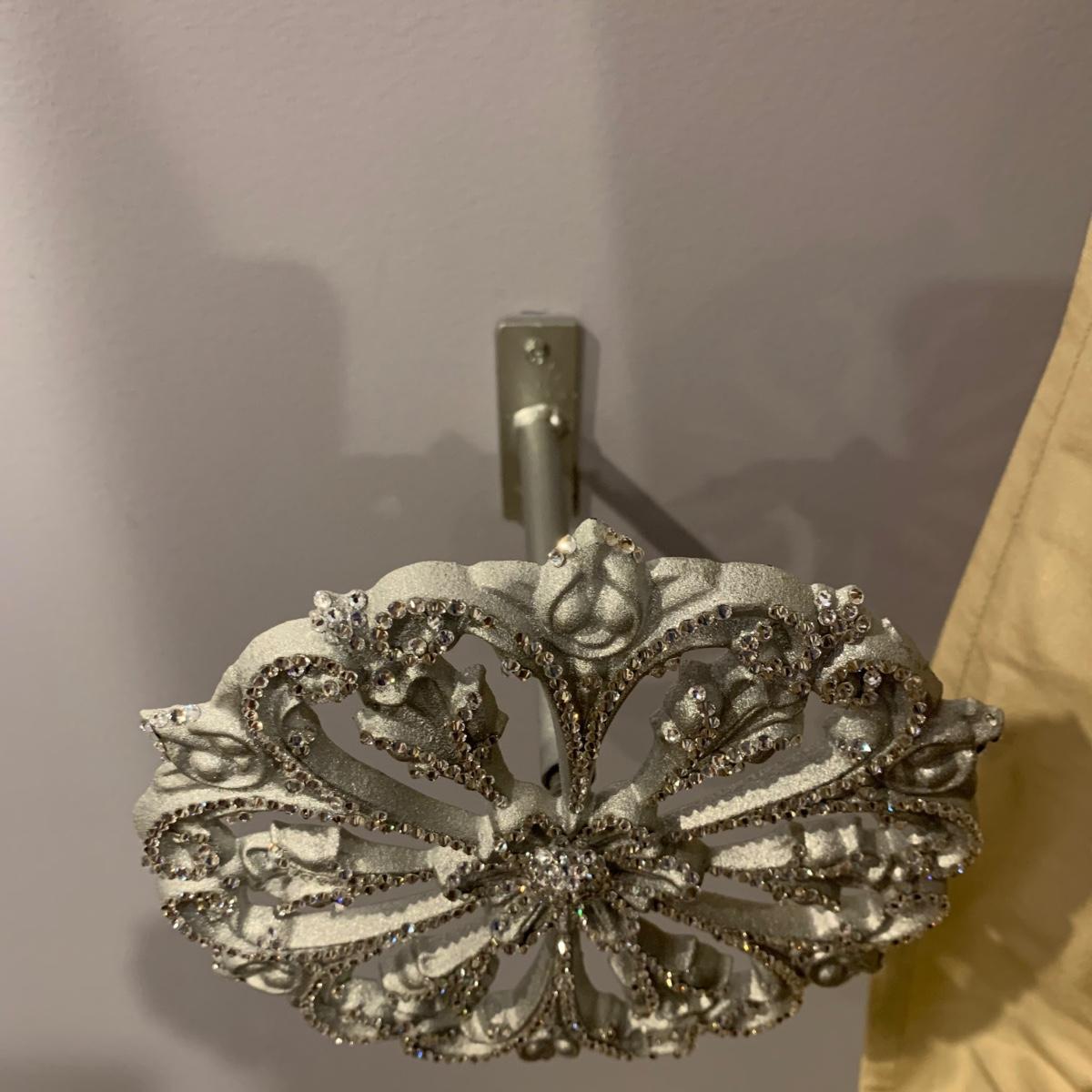 Bed canopy with a cream crow. frame that feels slightly soft to the touch and cloth panels that appear to be linen. There are three cloth panels “” two side curtains and one back panel. The curtains are held back with rhinestone studded holdbacks. Each side curtain is approximately 81” x 120”H. White frame is approximately 83” x 25” x 9”H. Frame has a wood base. The fabric has come detached from parts of the frame and will need to be reattached.