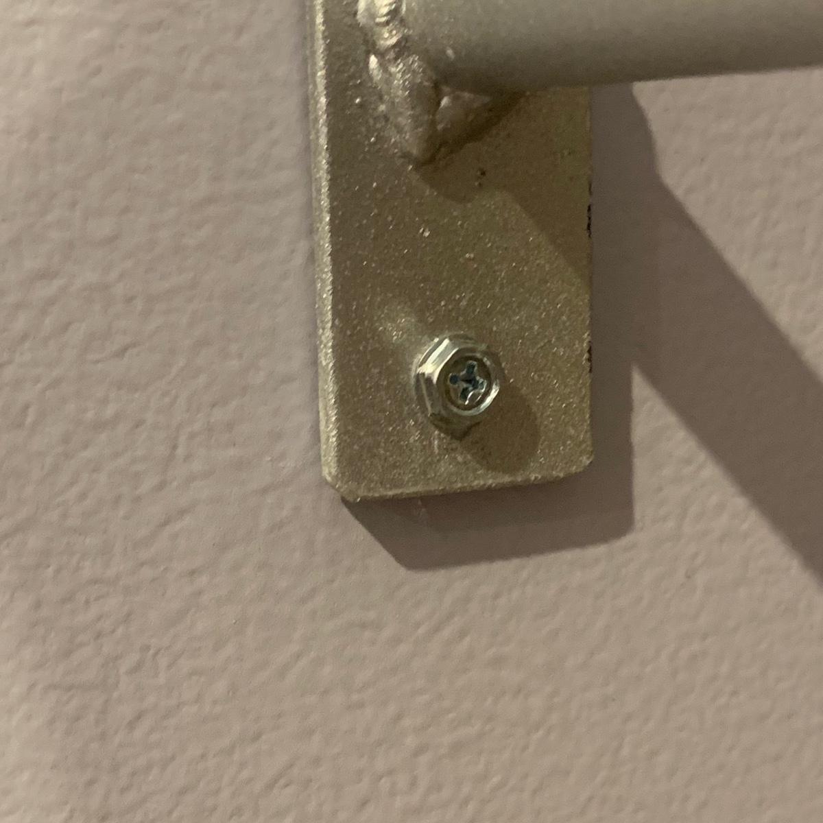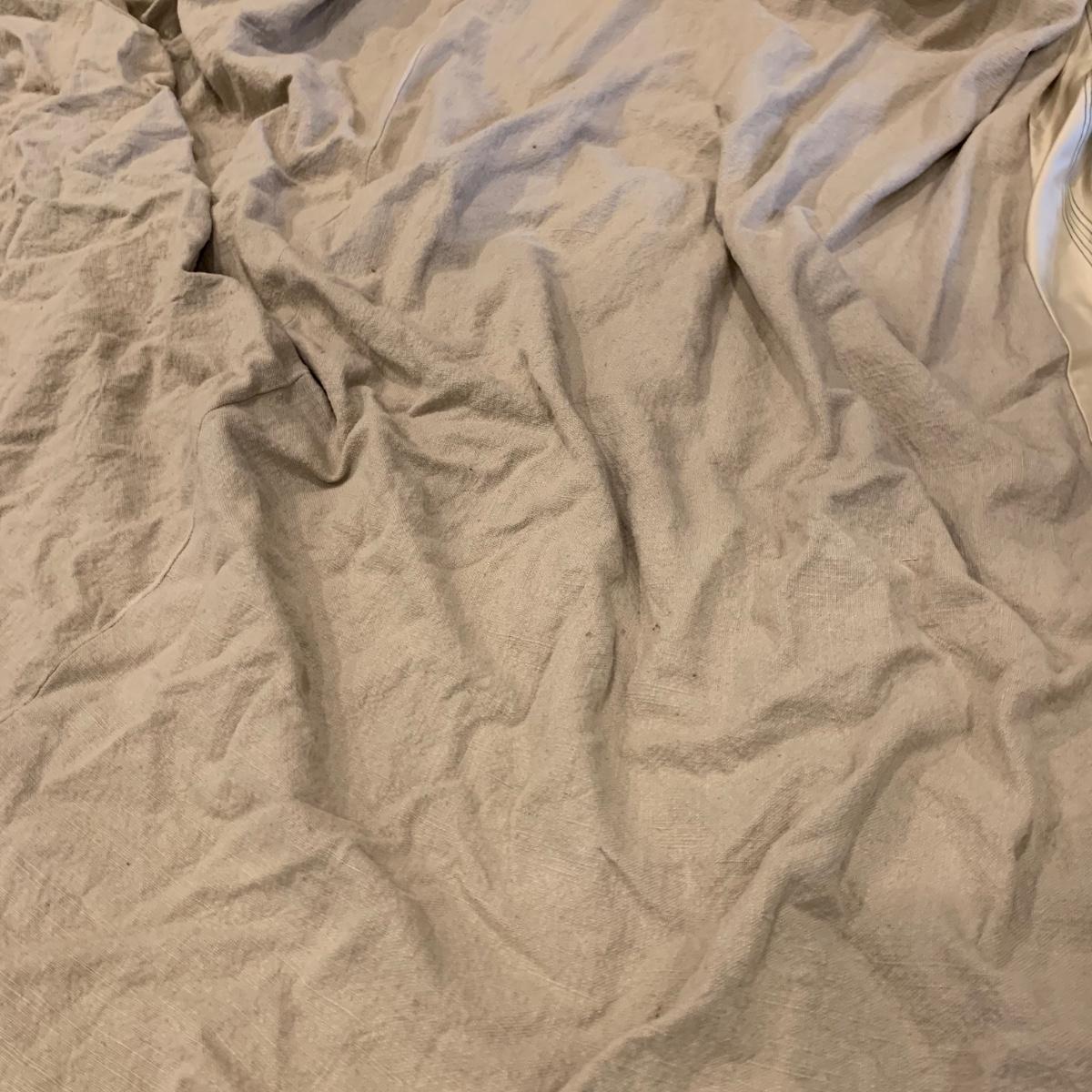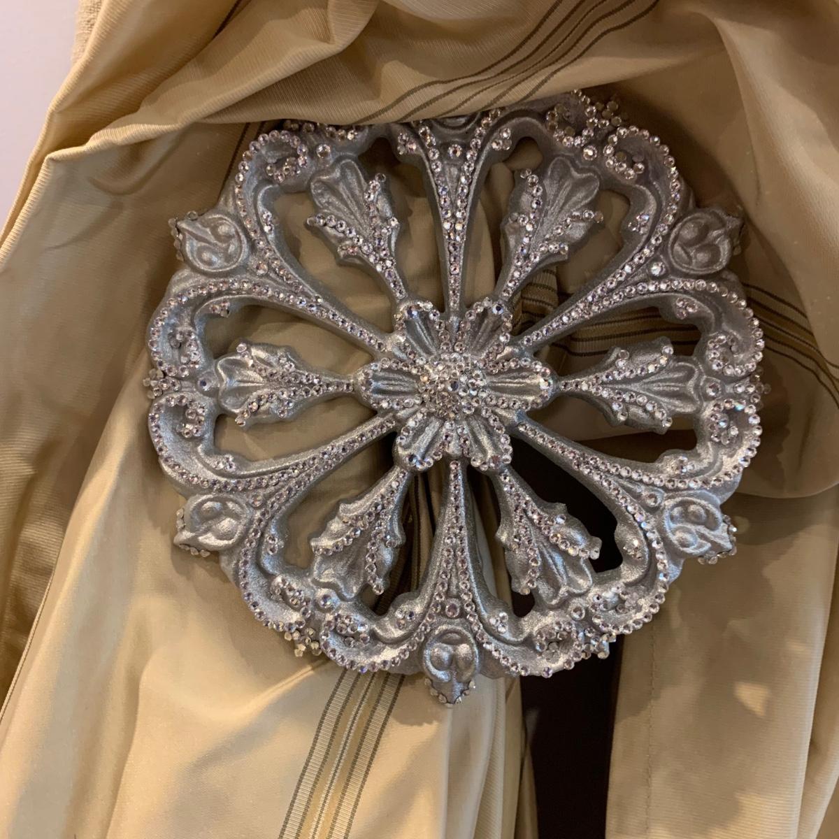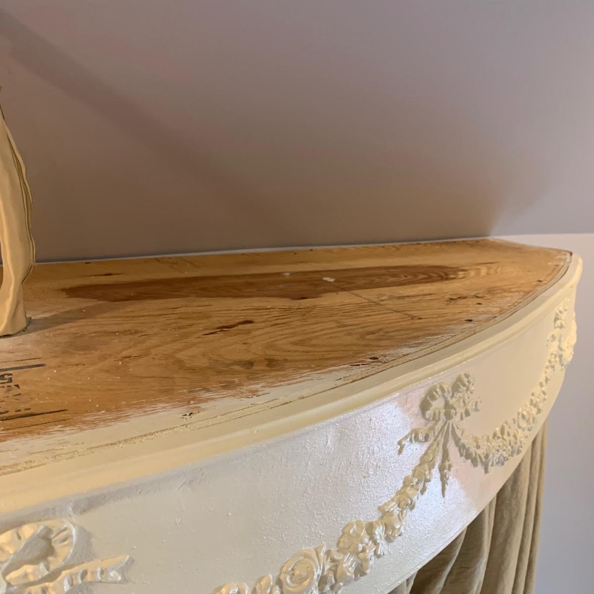 Bed canopy with a cream crow. frame that feels slightly soft to the touch and cloth panels that appear to be linen. There are three cloth panels “” two side curtains and one back panel. The curtains are held back with rhinestone studded holdbacks. Each side curtain is approximately 81” x 120”H. White frame is approximately 83” x 25” x 9”H. Frame has a wood base. The fabric has come detached from parts of the frame and will need to be reattached.