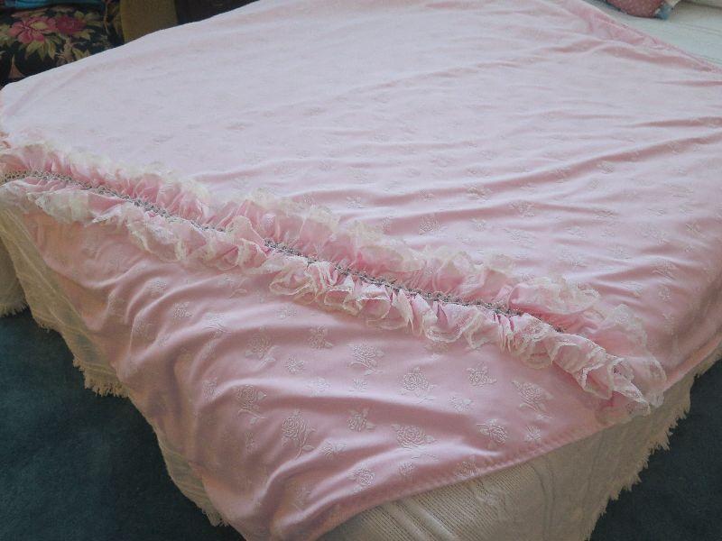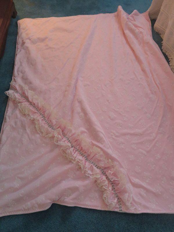 Vintage Twin size, hand crafted bed cover. Embossed flowers, lace and beads on end, reverse side is soft, warm material. Please review all photos and read Terms and Conditions before placing a bid. Pick up is Wednesday, November 20 from 4-7pm and Saturday, November 23 from 9am-2pm in Mantua, New Jersey. All sales are final. All sales are as is, where is. Please bring all boxes, tools, and muscle needed to remove your items. Any photo props are not included. All measurements are approximate. Items come from dog-friendly home.