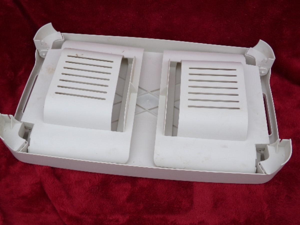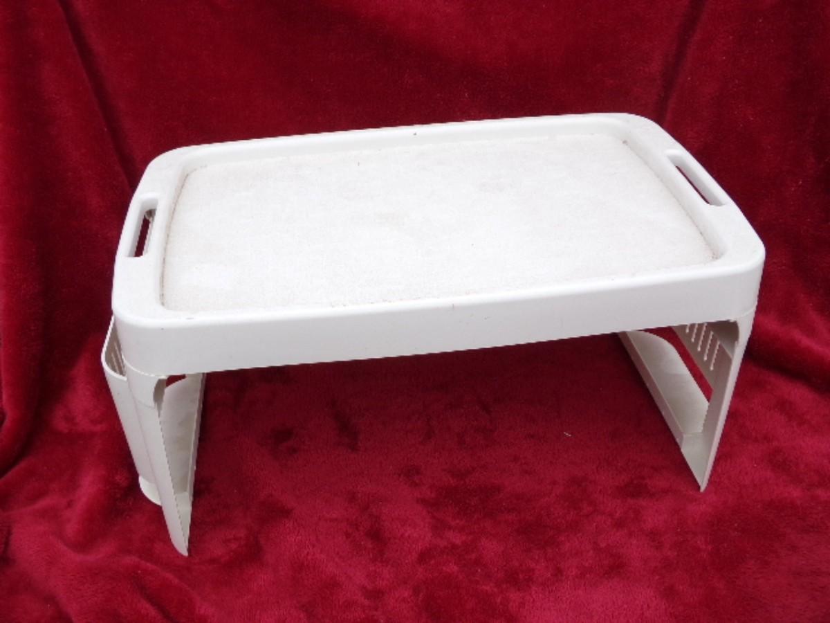 Bed tray, for eating in bed or whatever. Folds up for storage, plastic.