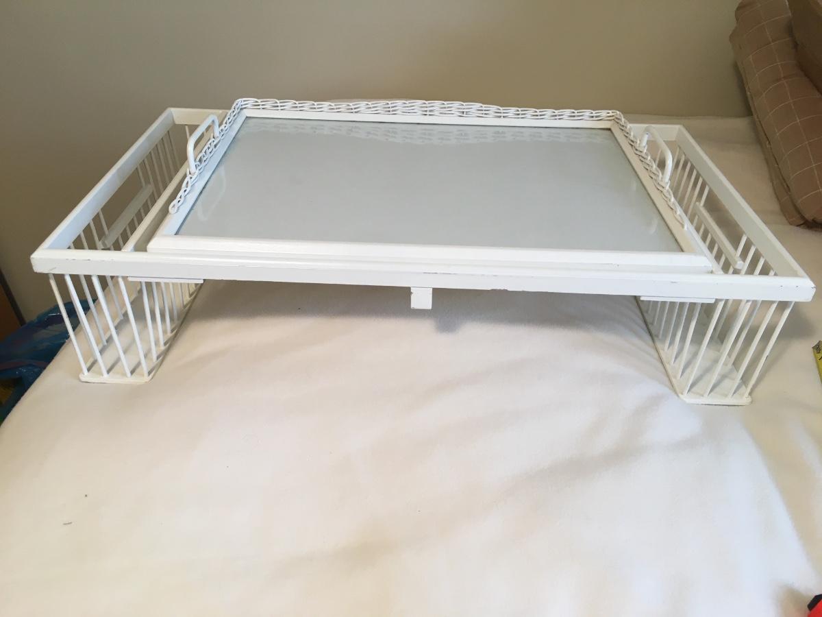 Bed tray with open compartments on either side. Center tray is also removable for easy clean up.