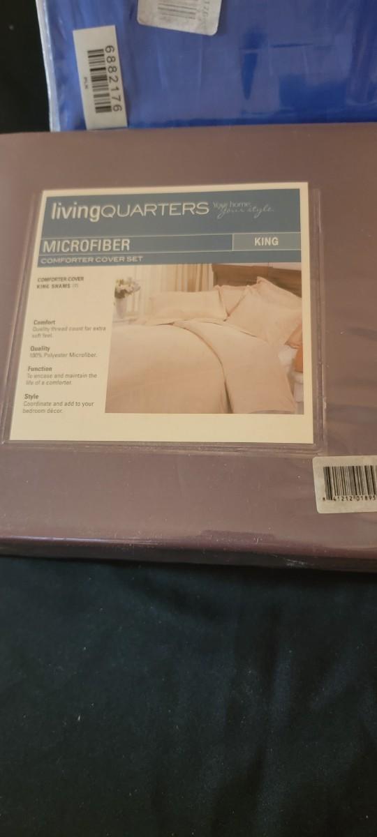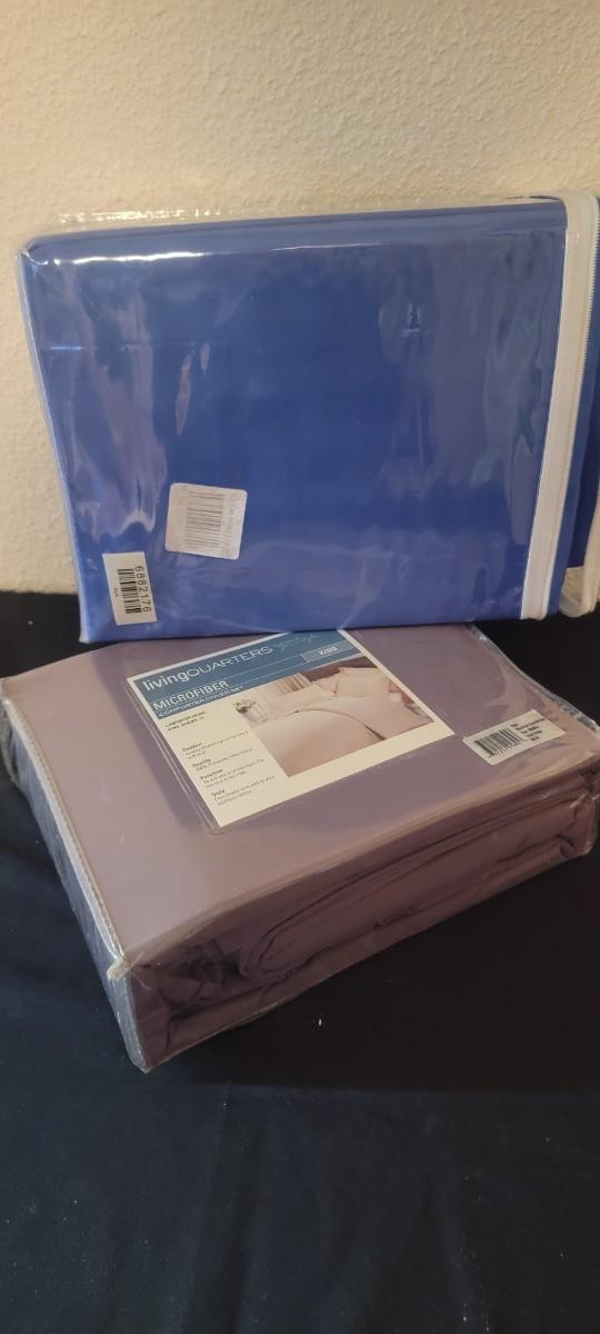 Living quarters king microfiber comforter cover. Blue sheet set, unknown size.