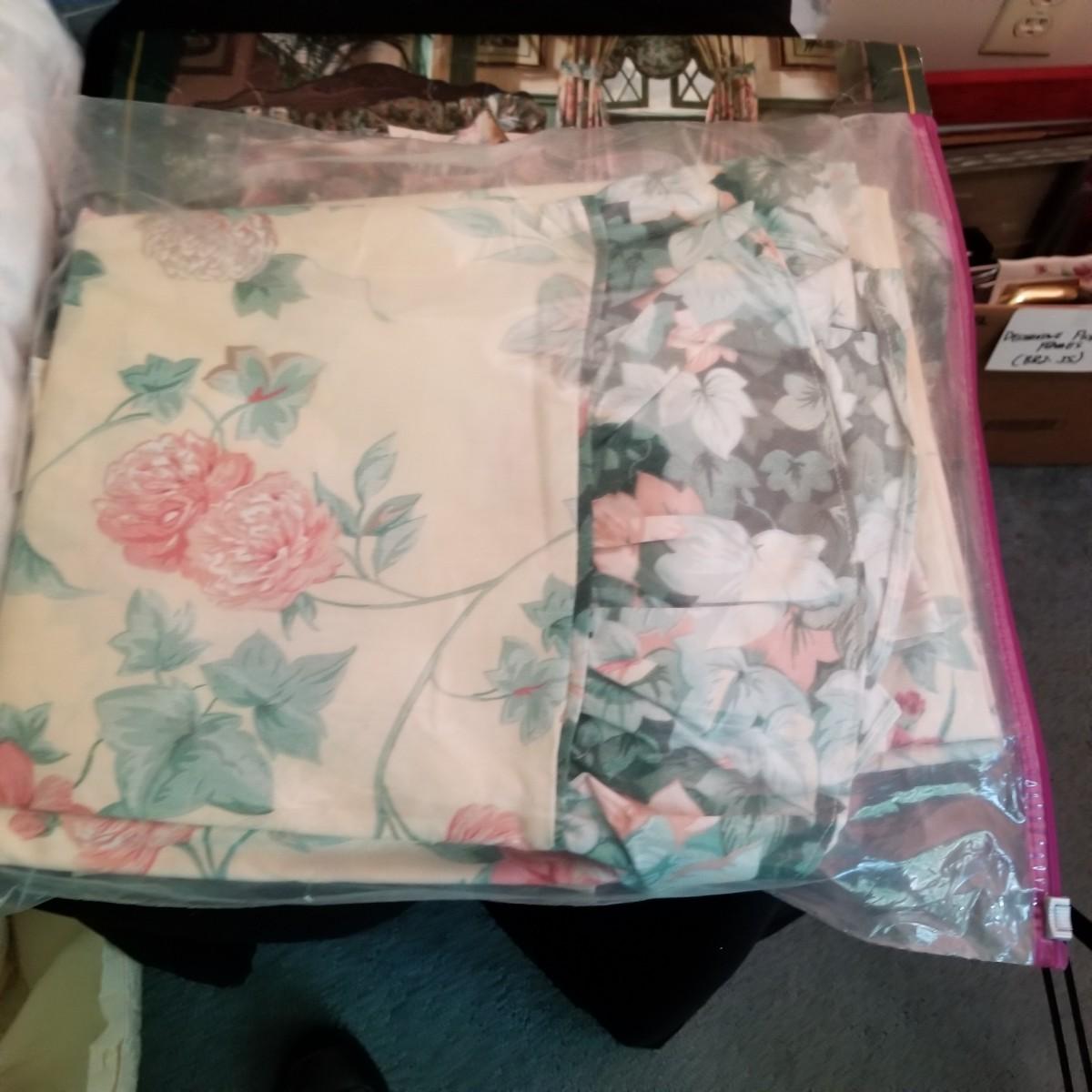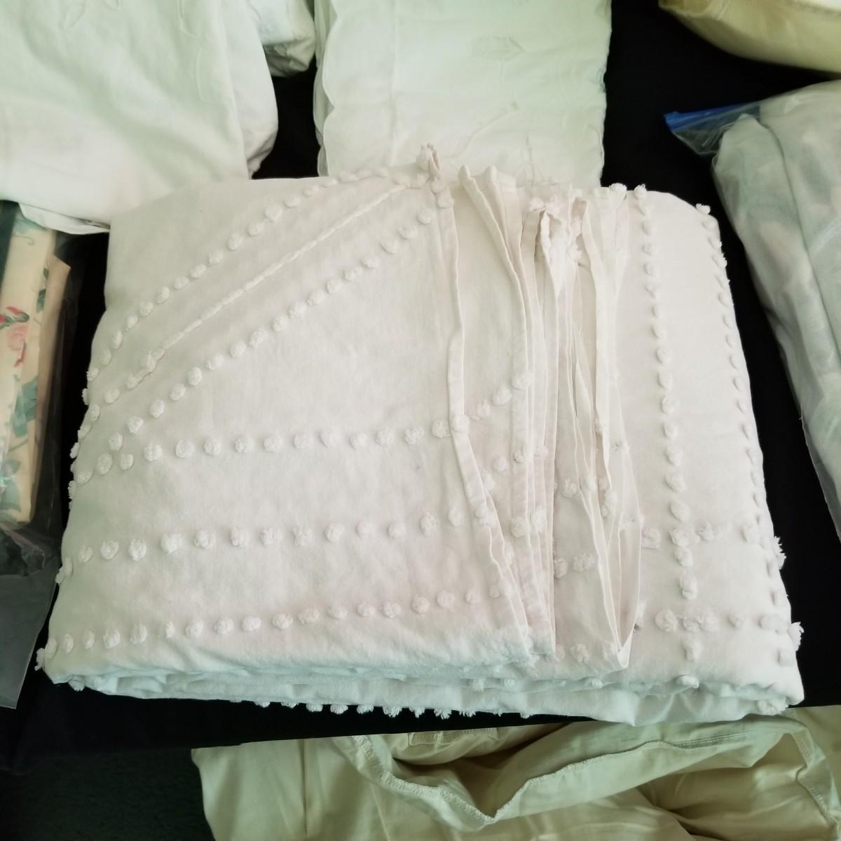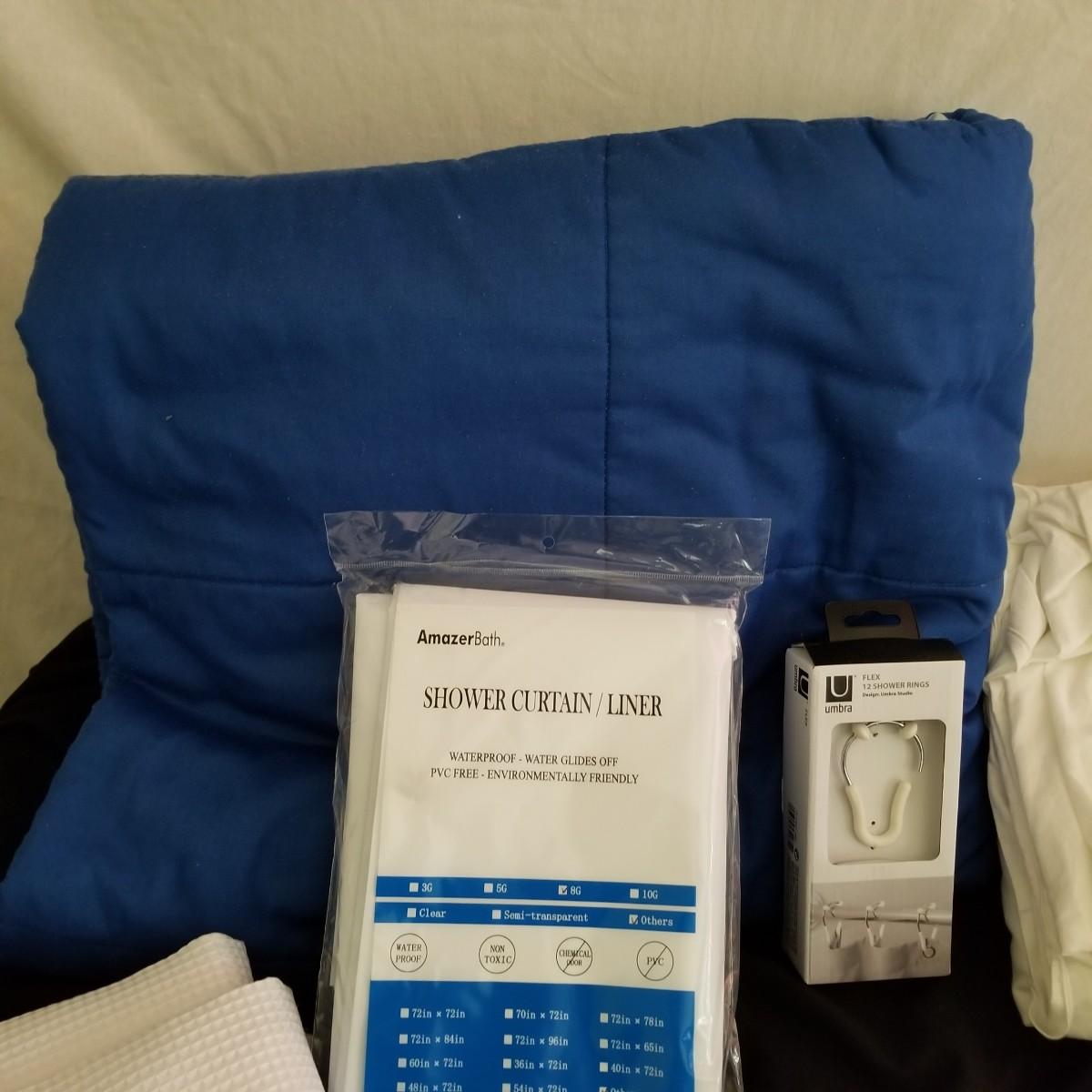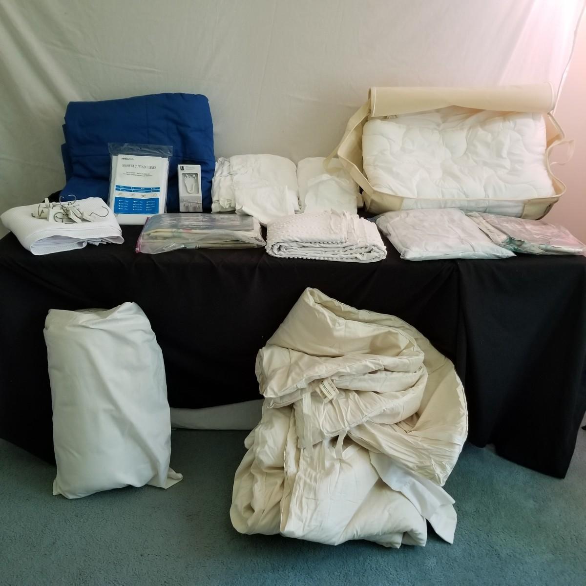 Sheets, comforters, spreads, dust ruffles. Two queen Comfort Ewe wool covers, 80"x84". Chenille bedspread 72"x76". Blue cover throw 68" x84". Shower curtain liner + curtain rings. One white queen size cover for bed. See photos for details. Local pickup only.