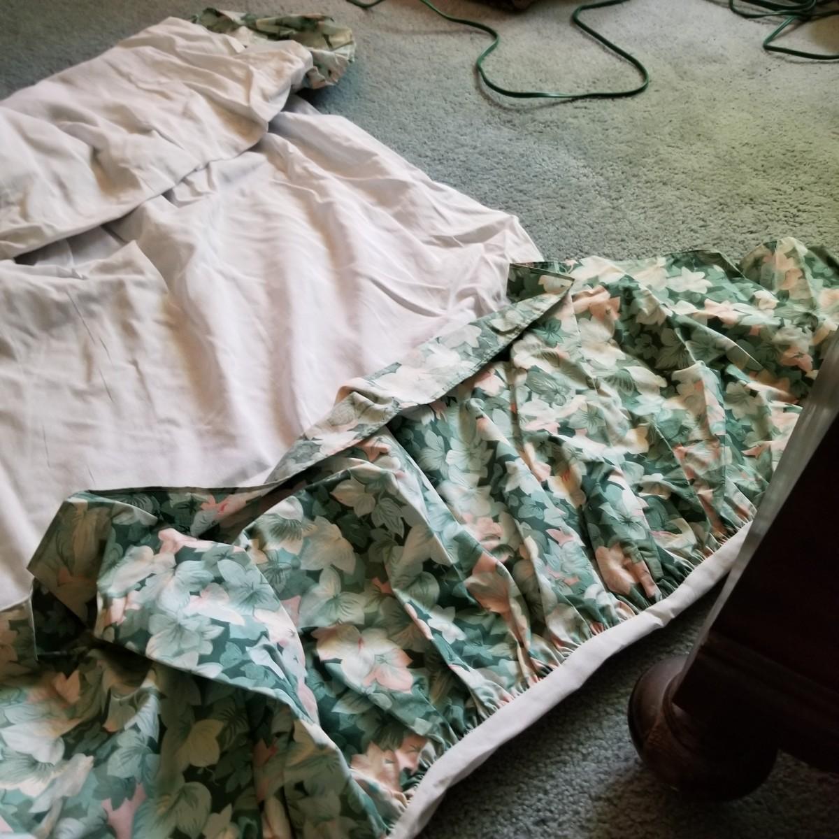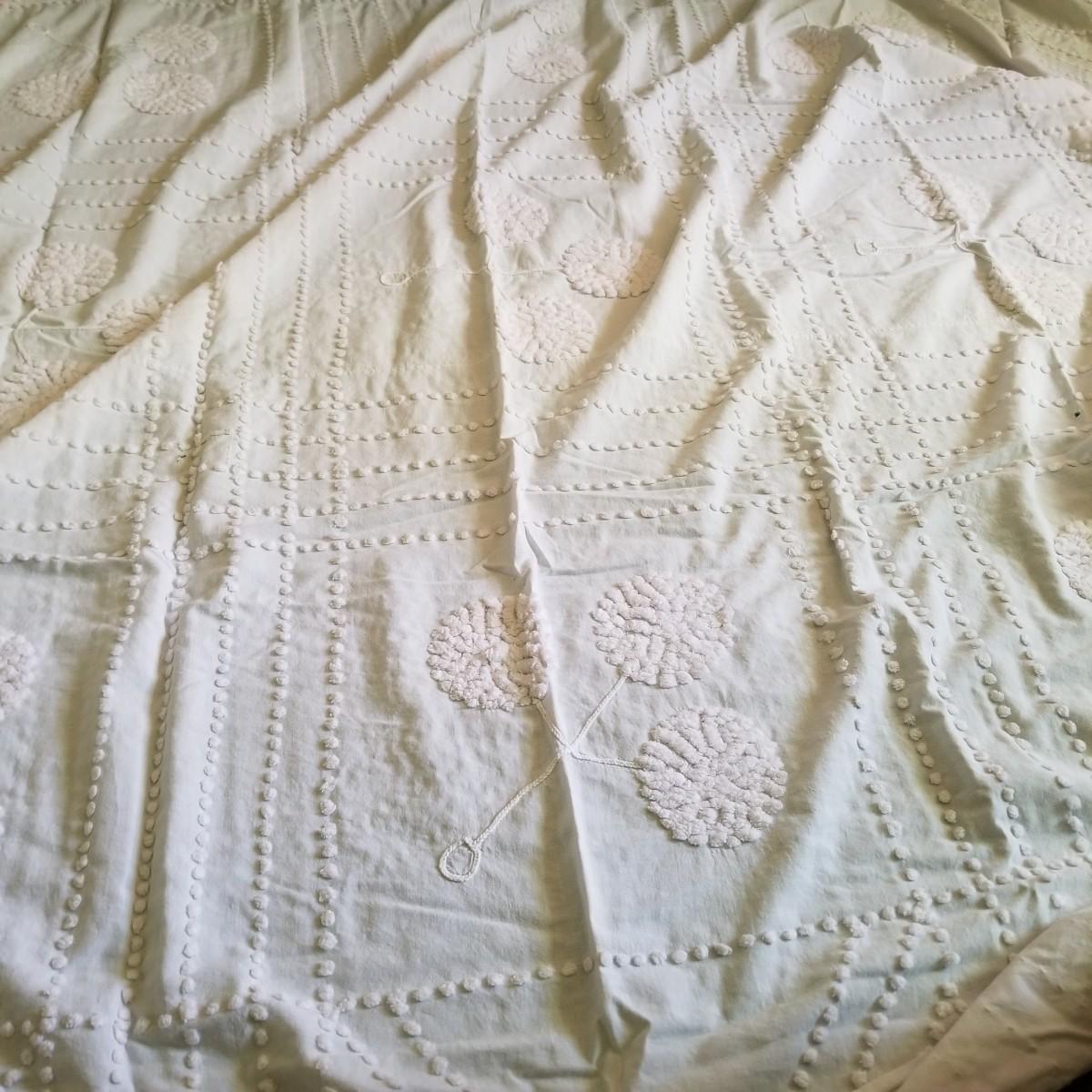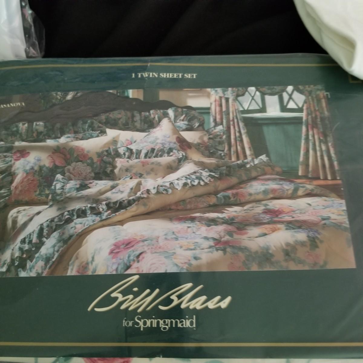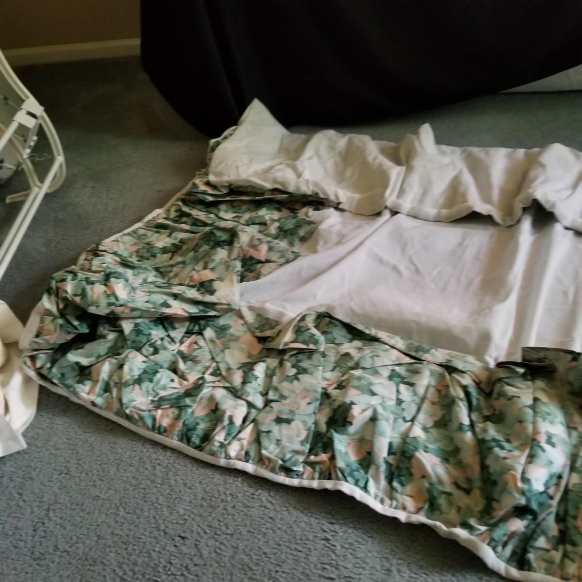 Sheets, comforters, spreads, dust ruffles. Two queen Comfort Ewe wool covers, 80"x84". Chenille bedspread 72"x76". Blue cover throw 68" x84". Shower curtain liner + curtain rings. One white queen size cover for bed. See photos for details. Local pickup only.