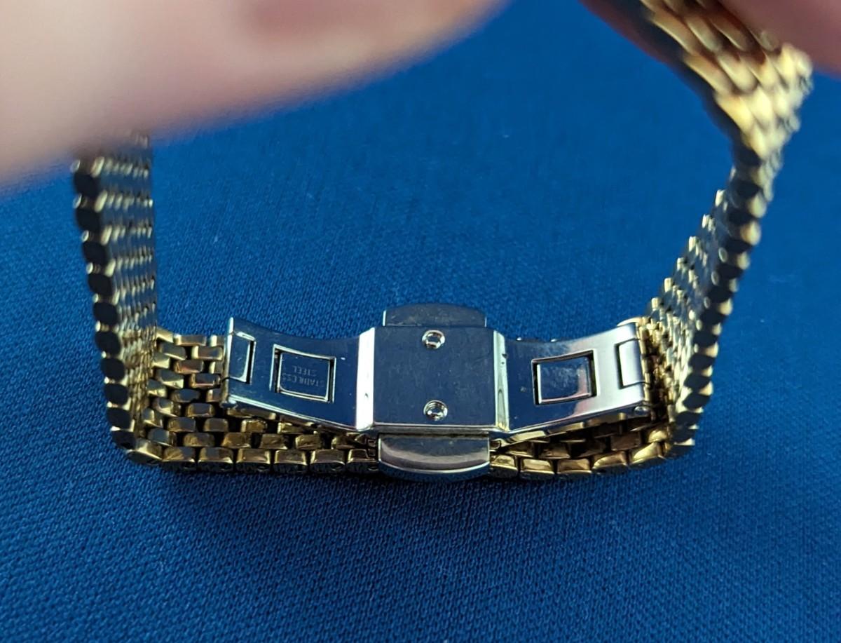 High quality mesh band. My wrist is 7" and this is a bit loose. High quality gold tone finish. No marks indicating gold filled.
