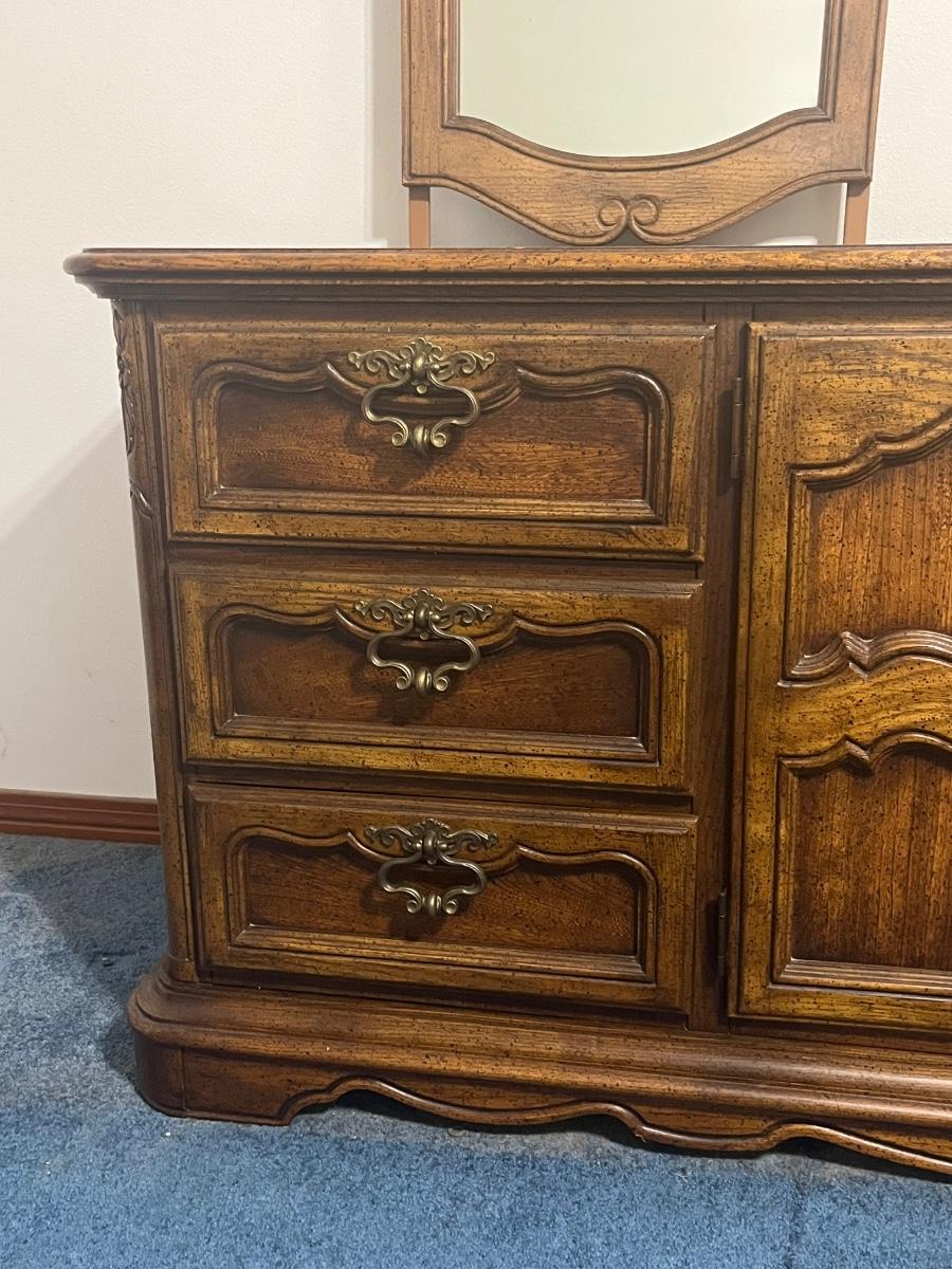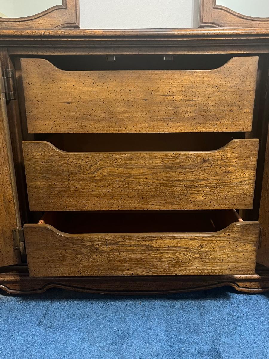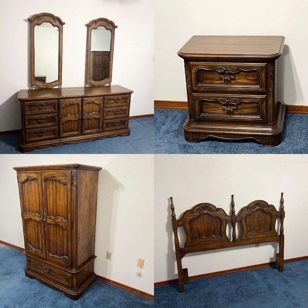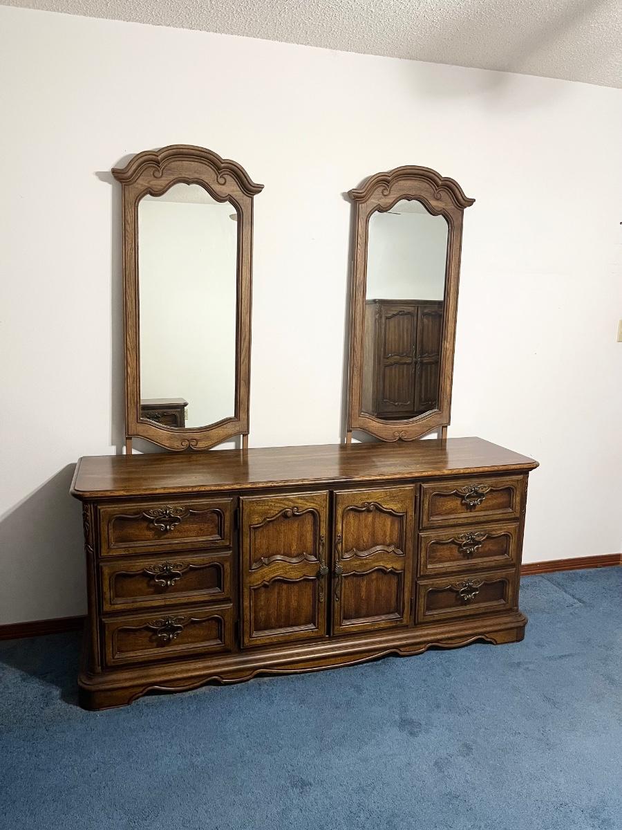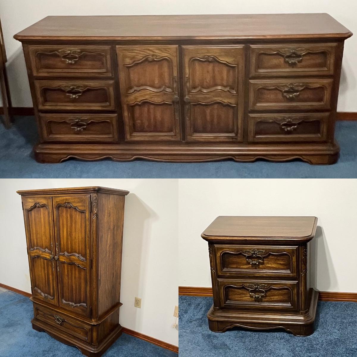 Dresser = 31” H x 72” W x 20” D ~ removable mirrors = 47” H x 23” W x 1.5” D ~ armoire = 60” H x 38” W x 20.5” D ~ bedside table = 23.5” H x 25” W x 16” D ~ headboard = 47” H x 59” W ~ drawers slide easily ~ no bed railings included.
