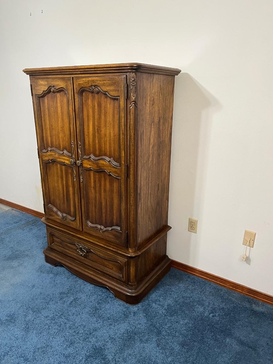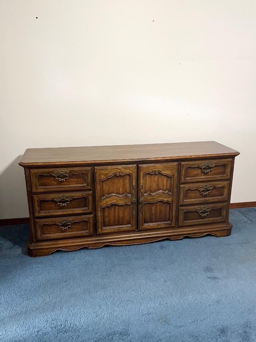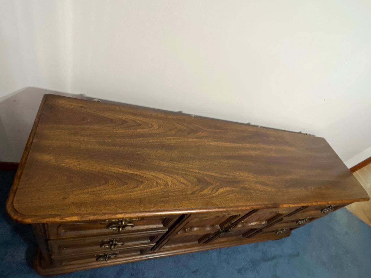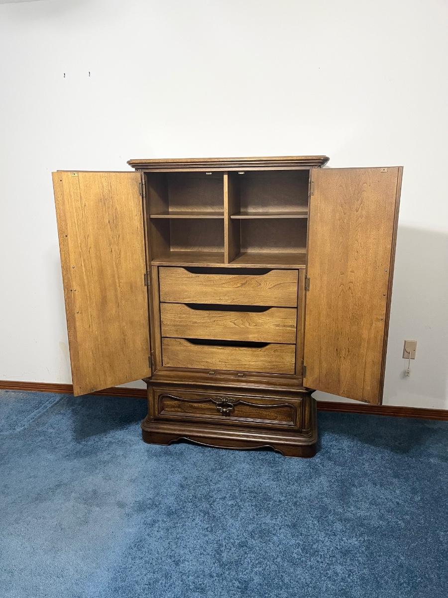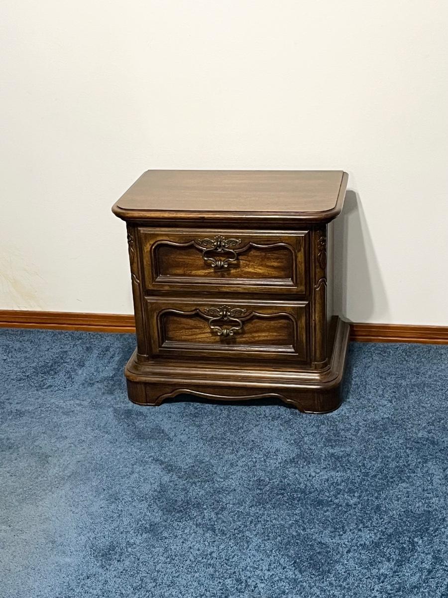 Dresser = 31” H x 72” W x 20” D ~ removable mirrors = 47” H x 23” W x 1.5” D ~ armoire = 60” H x 38” W x 20.5” D ~ bedside table = 23.5” H x 25” W x 16” D ~ headboard = 47” H x 59” W ~ drawers slide easily ~ no bed railings included.