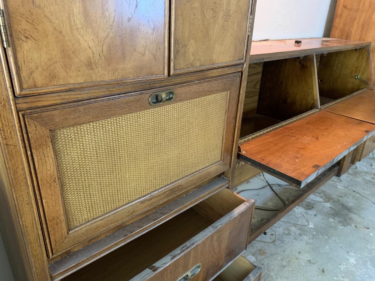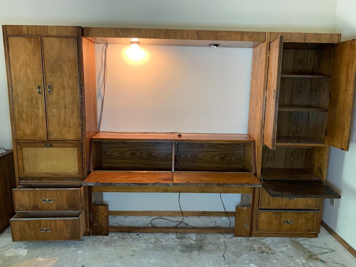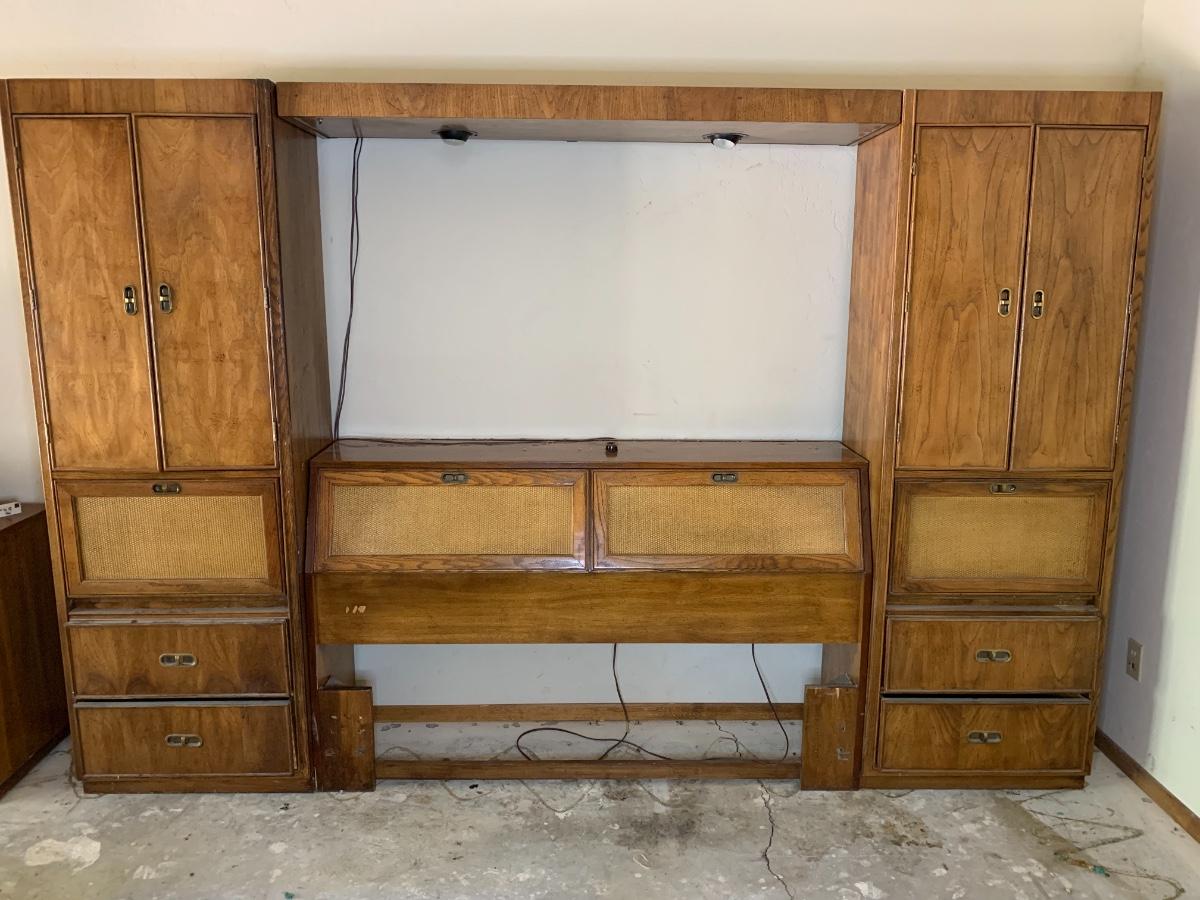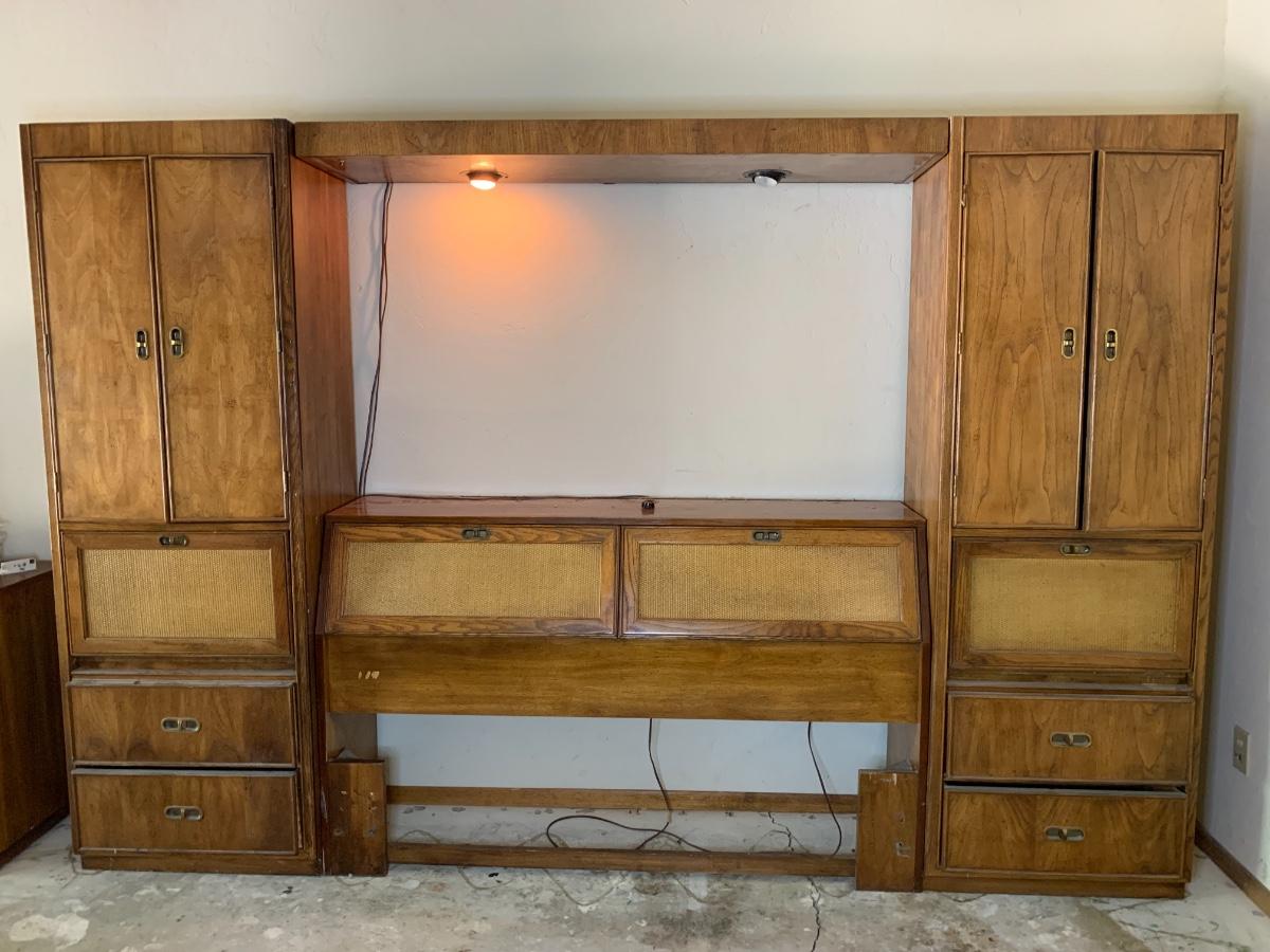 Pair of vintage wood bookcases with a full size headboard. Book cases have an upper cabinet with 2 shelves, a middle fold down desk and two lower drawers. Pulls are brass. Woven pattern on the desk fronts. Headboard features hidden storage behind pull downs woven fronts. There is a piece of wood that runs above over the top connecting the two book cases to give extra display space above and has built in overhead lighting with dimmer knob. Moderate wear, dusty.