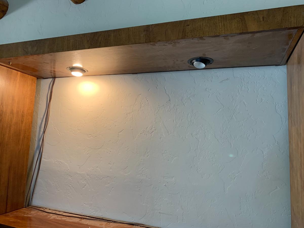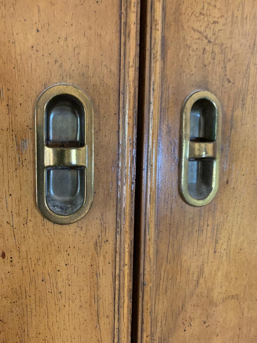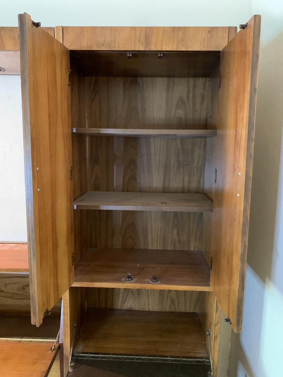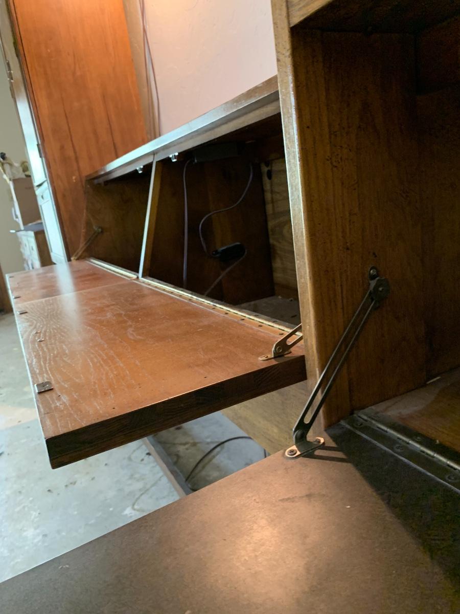 Pair of vintage wood bookcases with a full size headboard. Book cases have an upper cabinet with 2 shelves, a middle fold down desk and two lower drawers. Pulls are brass. Woven pattern on the desk fronts. Headboard features hidden storage behind pull downs woven fronts. There is a piece of wood that runs above over the top connecting the two book cases to give extra display space above and has built in overhead lighting with dimmer knob. Moderate wear, dusty.