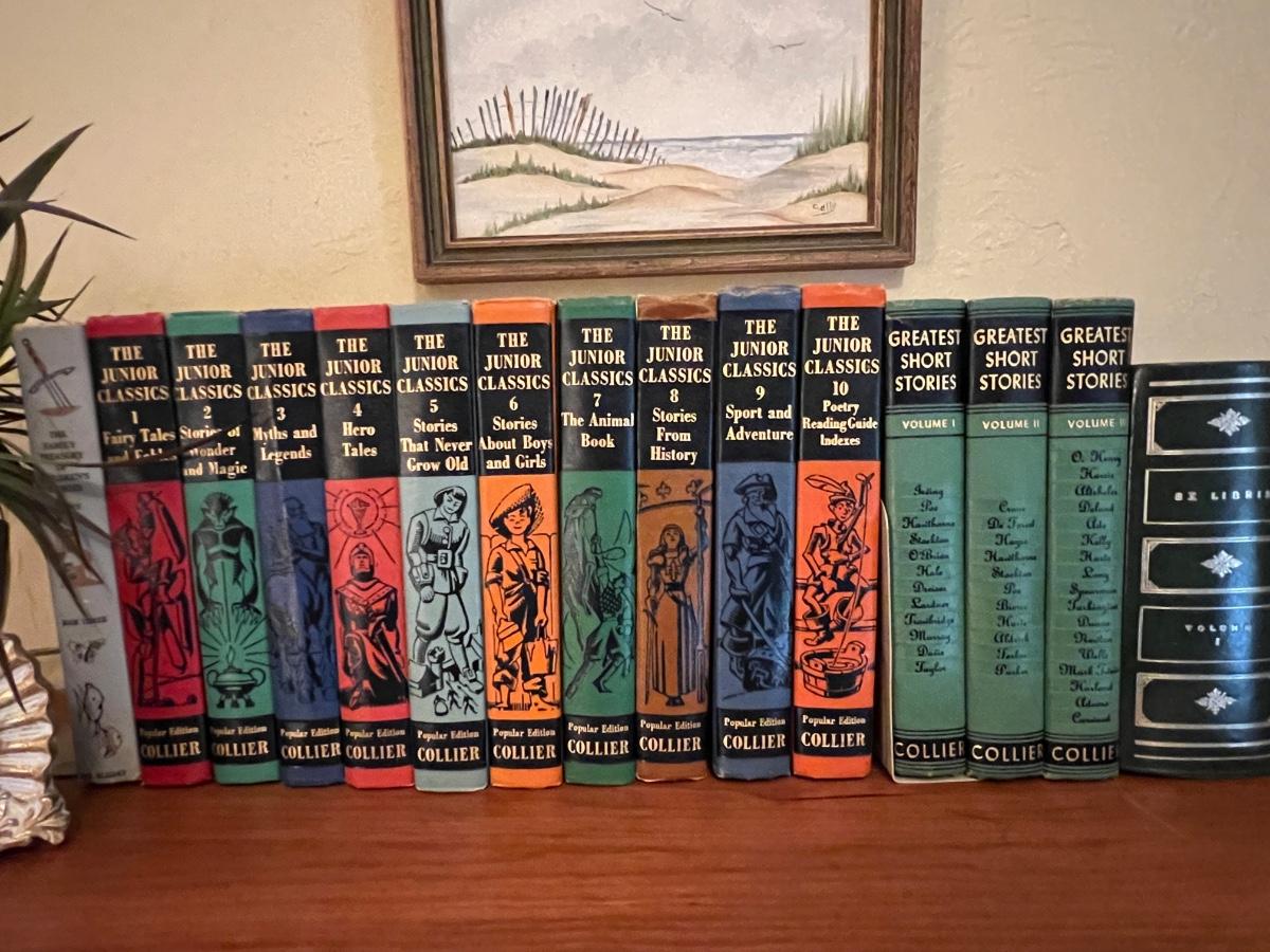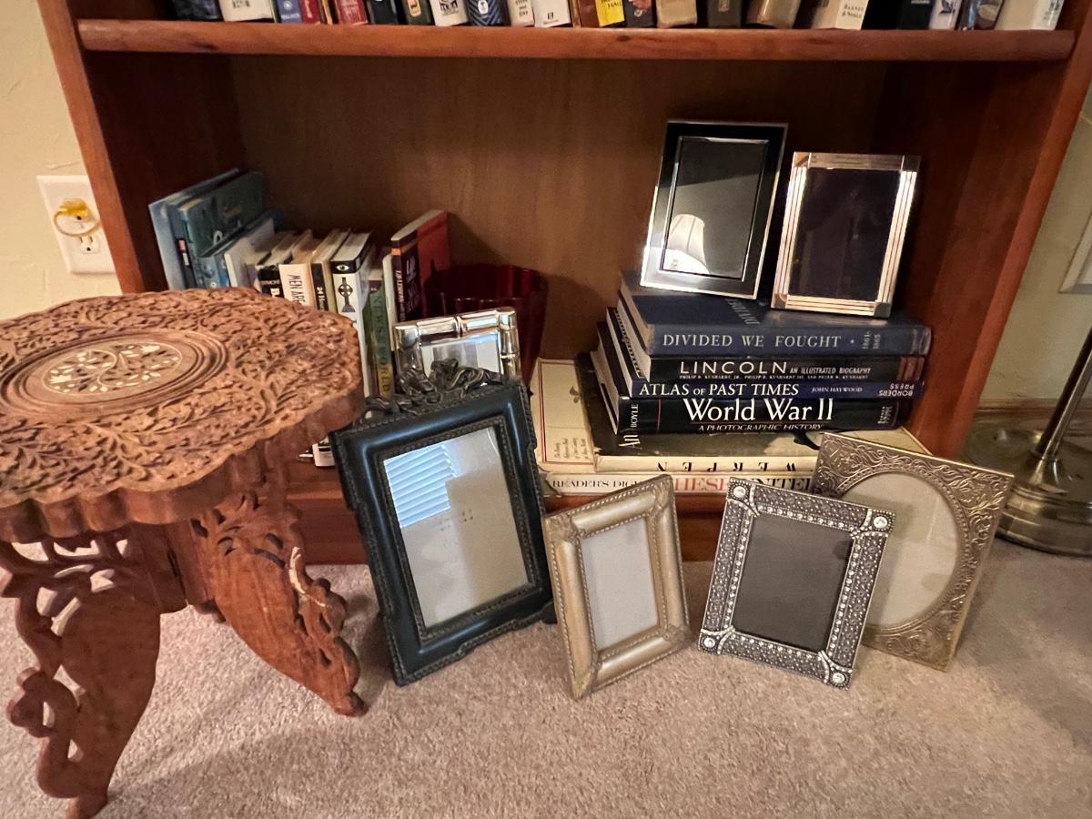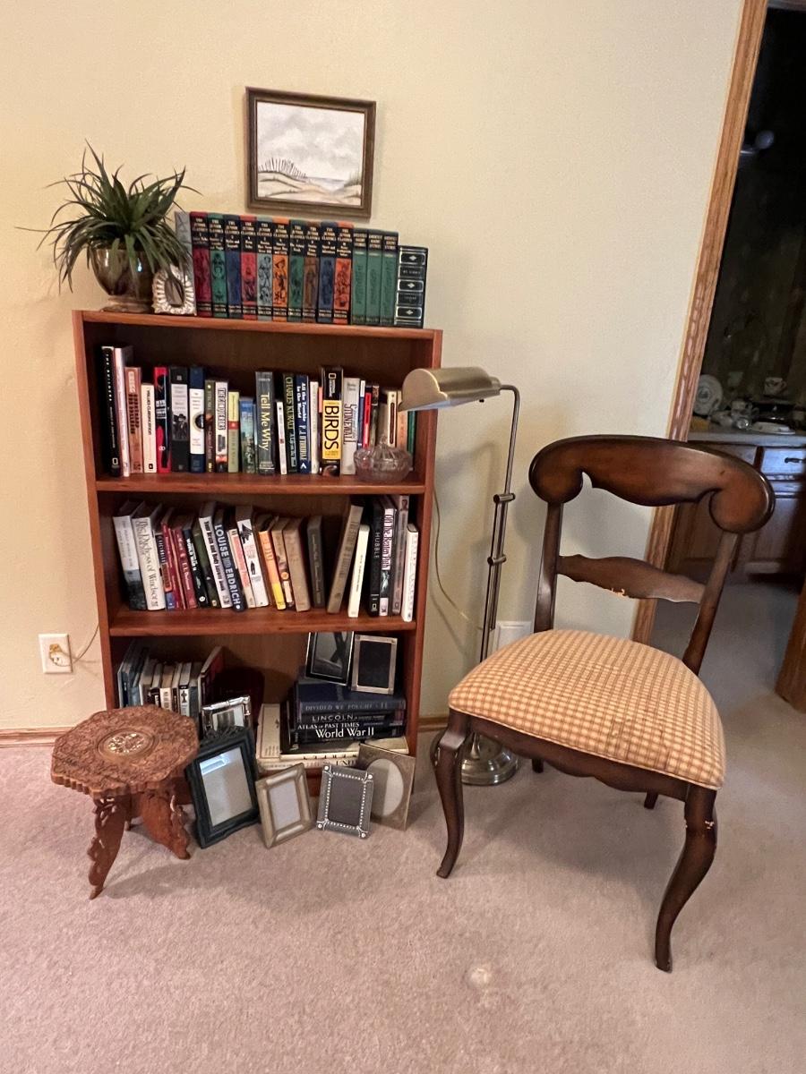 Solid Wood Book Shelf with a collection of Junior Classics and other books, a side chair, original art, footstool, picture frames and decor as pictured.
