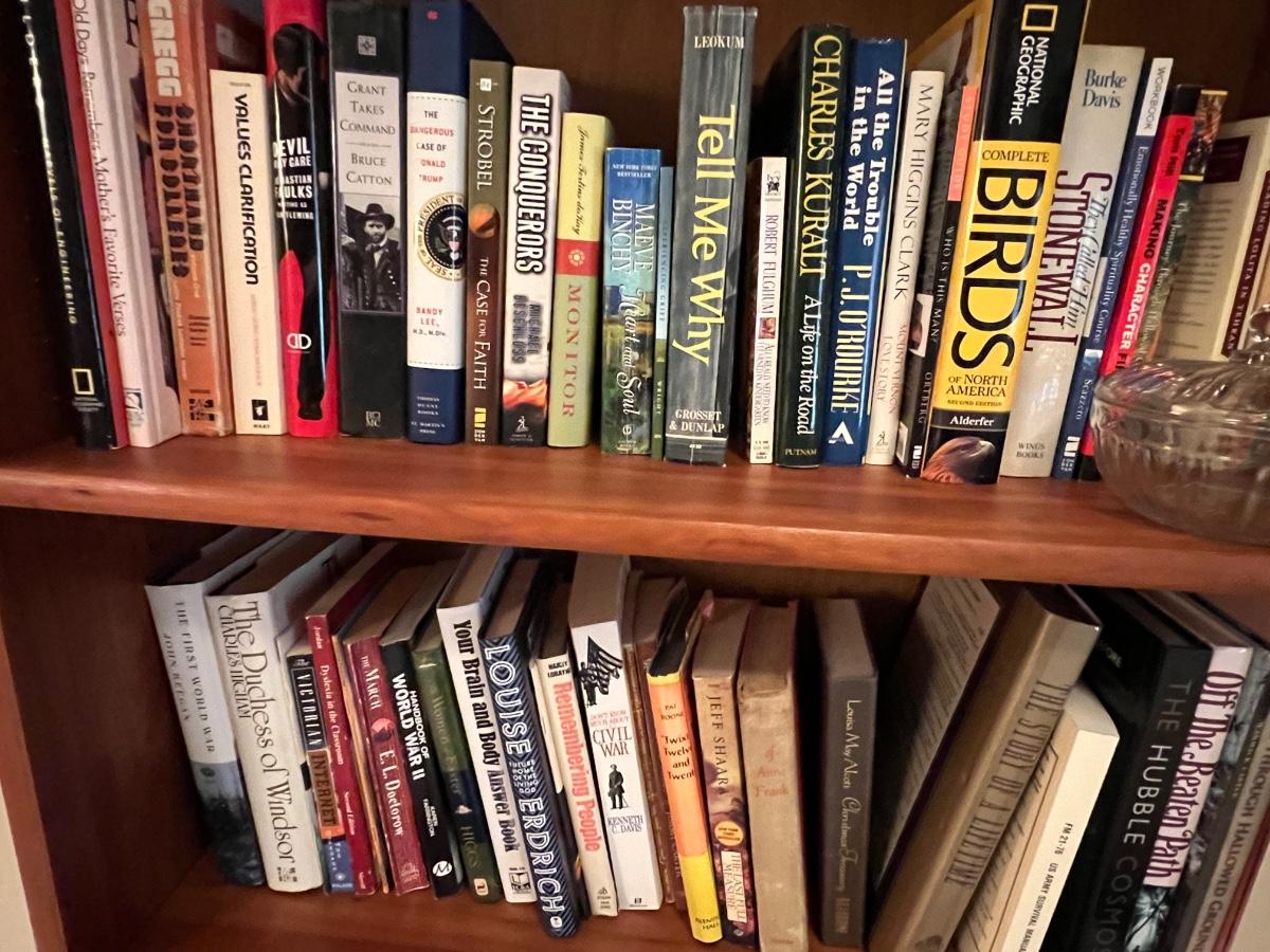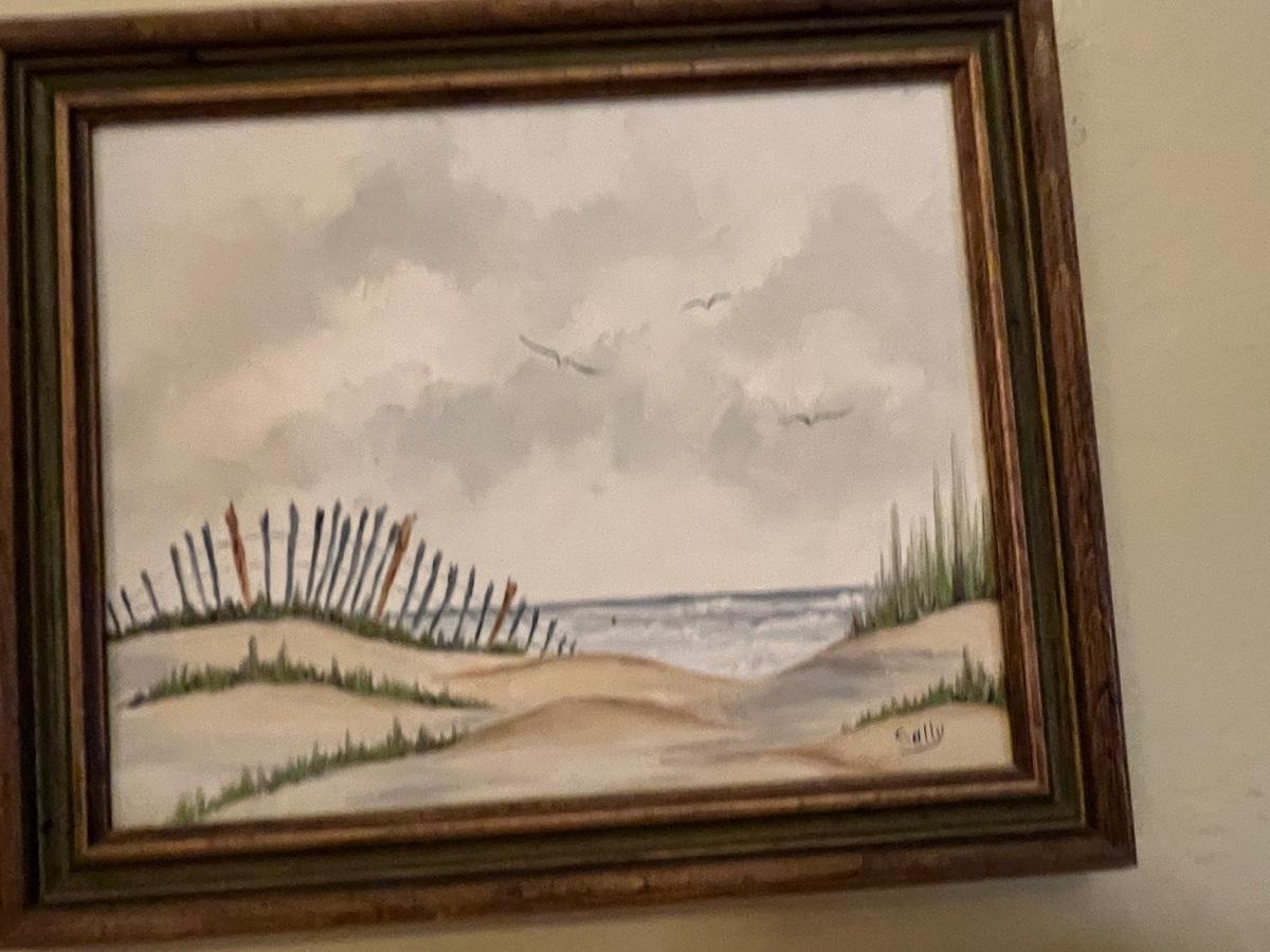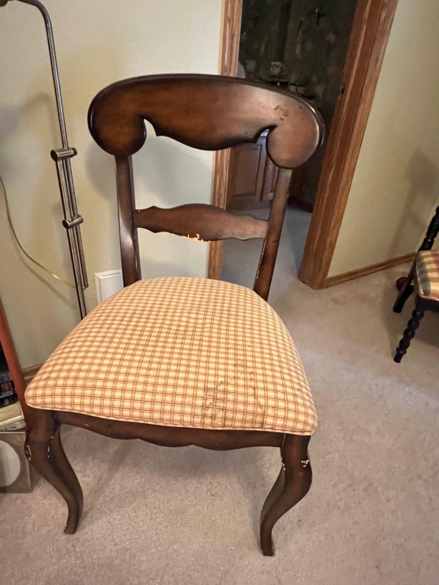 Solid Wood Book Shelf with a collection of Junior Classics and other books, a side chair, original art, footstool, picture frames and decor as pictured.