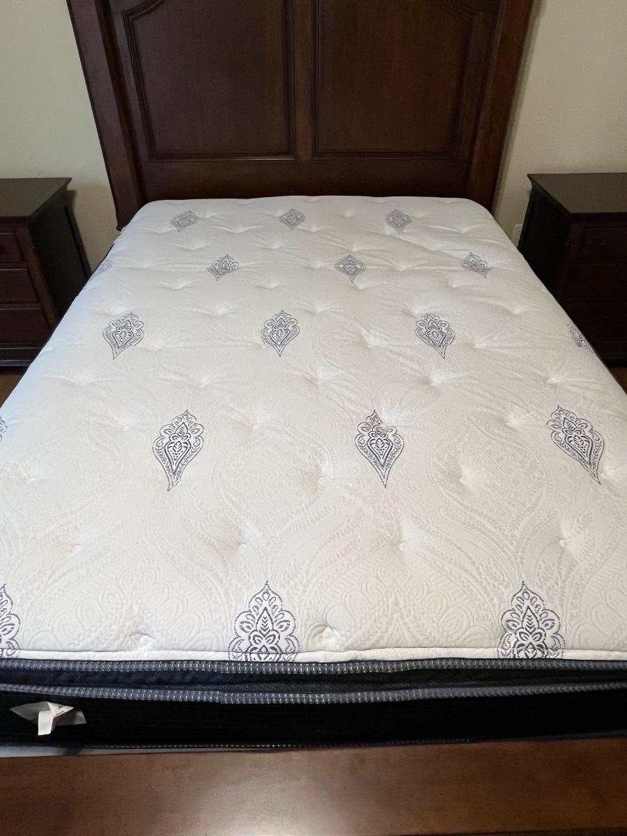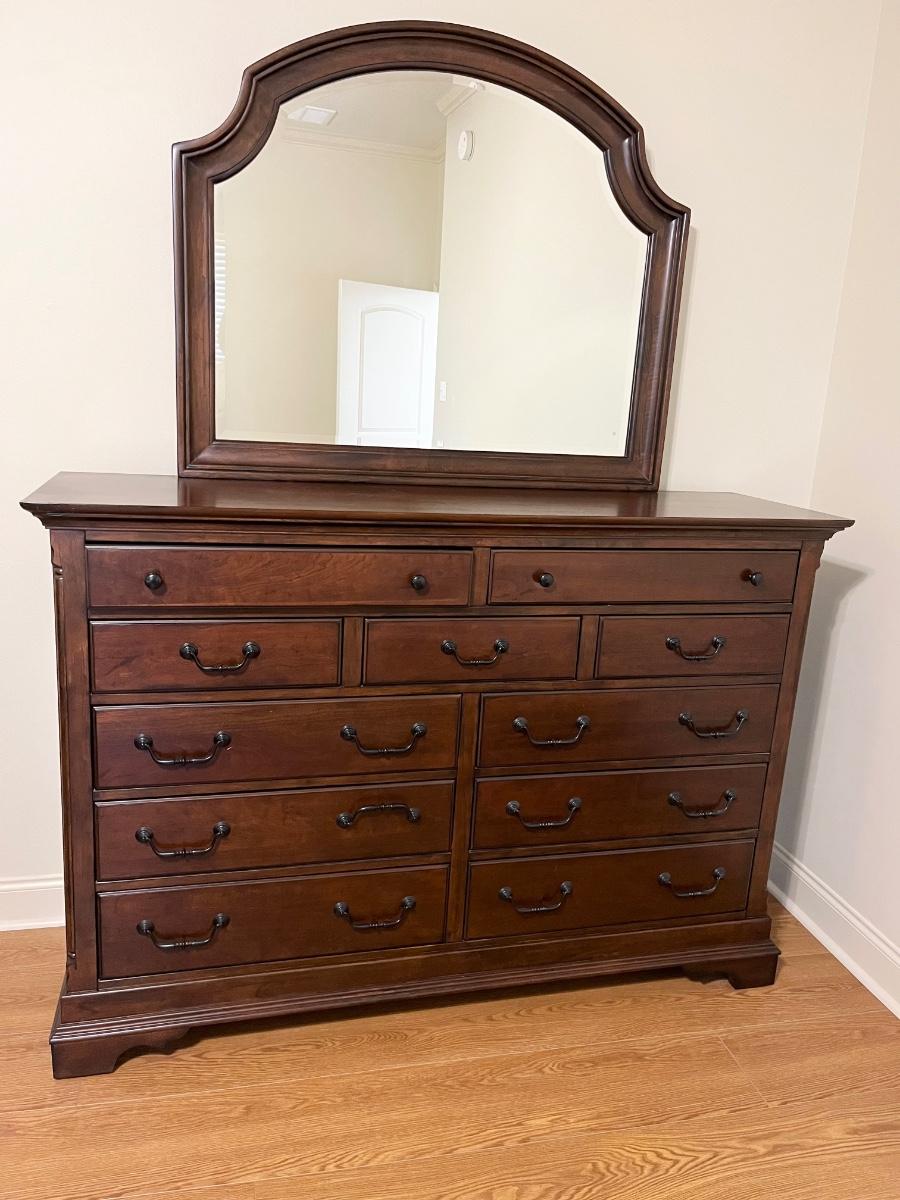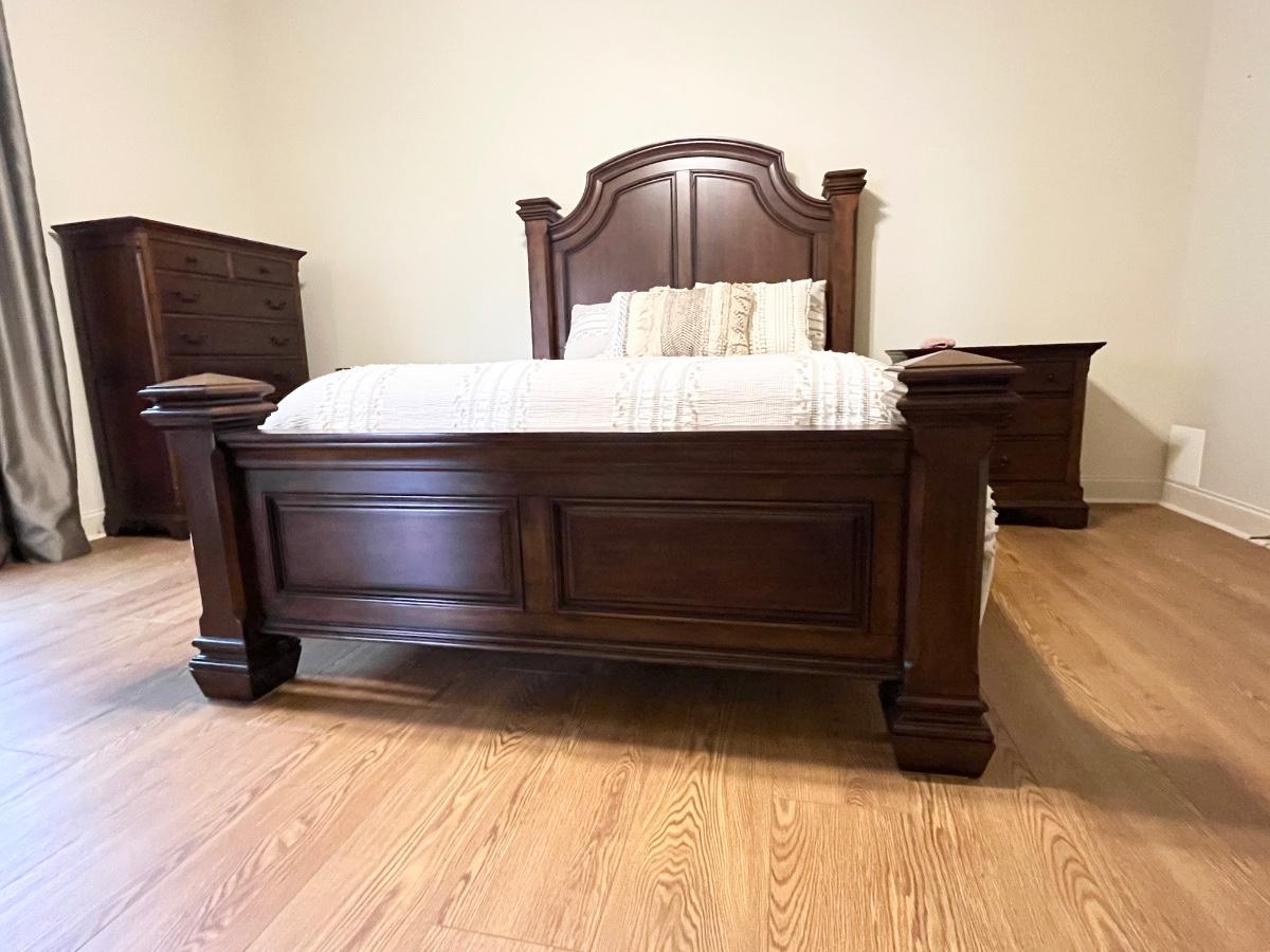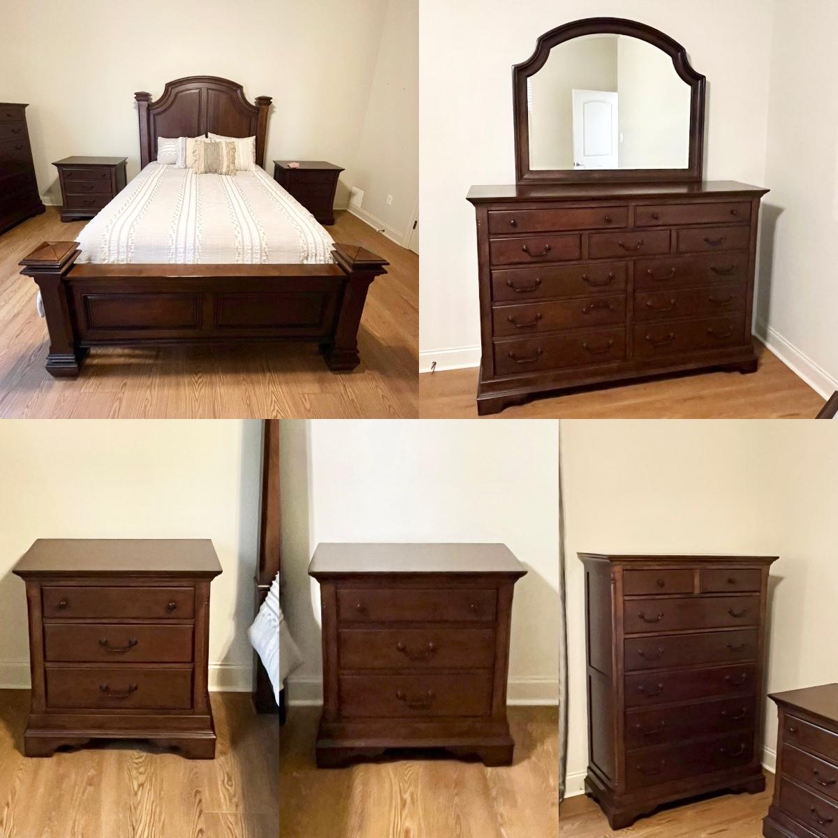 Set includes ~ Simmons Beauty Rest queen mattress ~ Headboard = 72” H x 64” ~ Footboard = 30” H x 64” W ~ Chest of drawers = 56.4” H x 40” W x 19” D ~ Two bedside tables = 31” H x 30” W x 19” D ~ Dresser = 45”.5” H x 65” W x 19” D ~ Mirror 38” H x 46” W