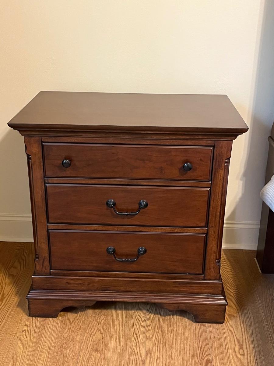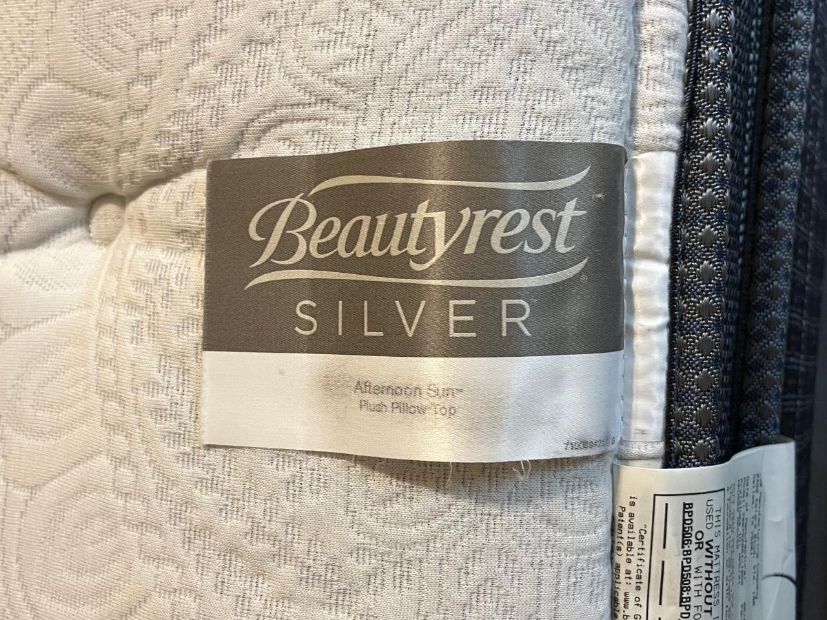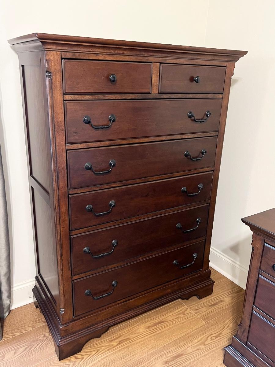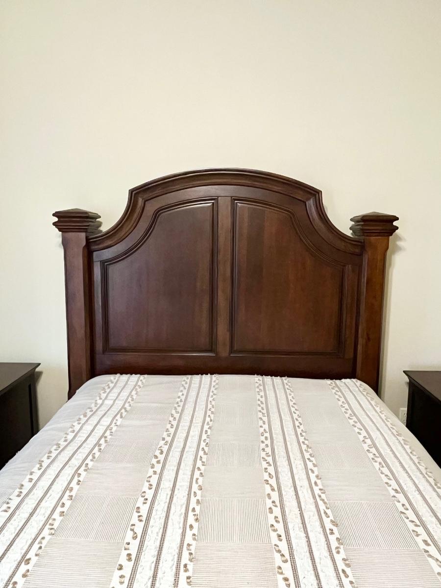 Set includes ~ Simmons Beauty Rest queen mattress ~ Headboard = 72” H x 64” ~ Footboard = 30” H x 64” W ~ Chest of drawers = 56.4” H x 40” W x 19” D ~ Two bedside tables = 31” H x 30” W x 19” D ~ Dresser = 45”.5” H x 65” W x 19” D ~ Mirror 38” H x 46” W