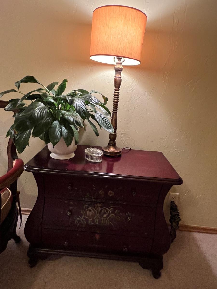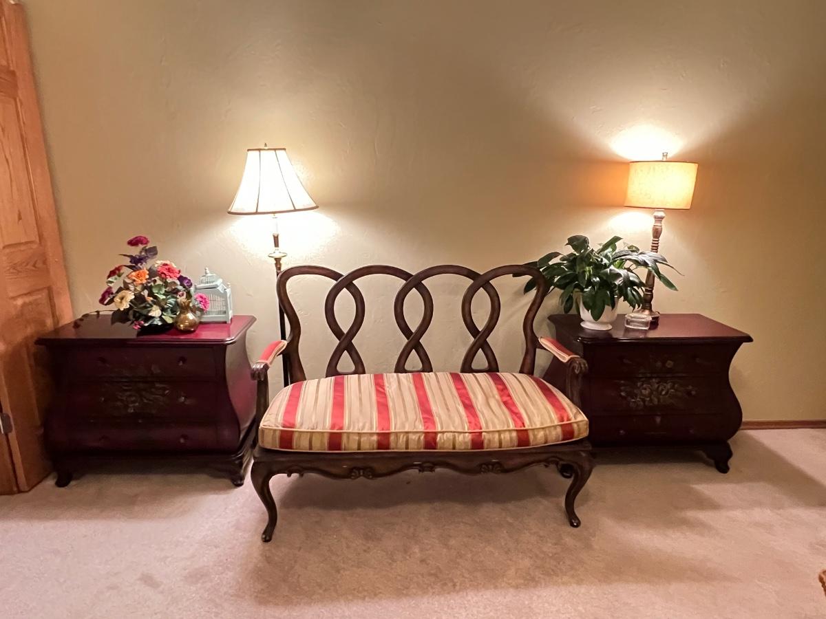 Cane seat settee with 2 tole end tables. 2 lamps and decor as pictured