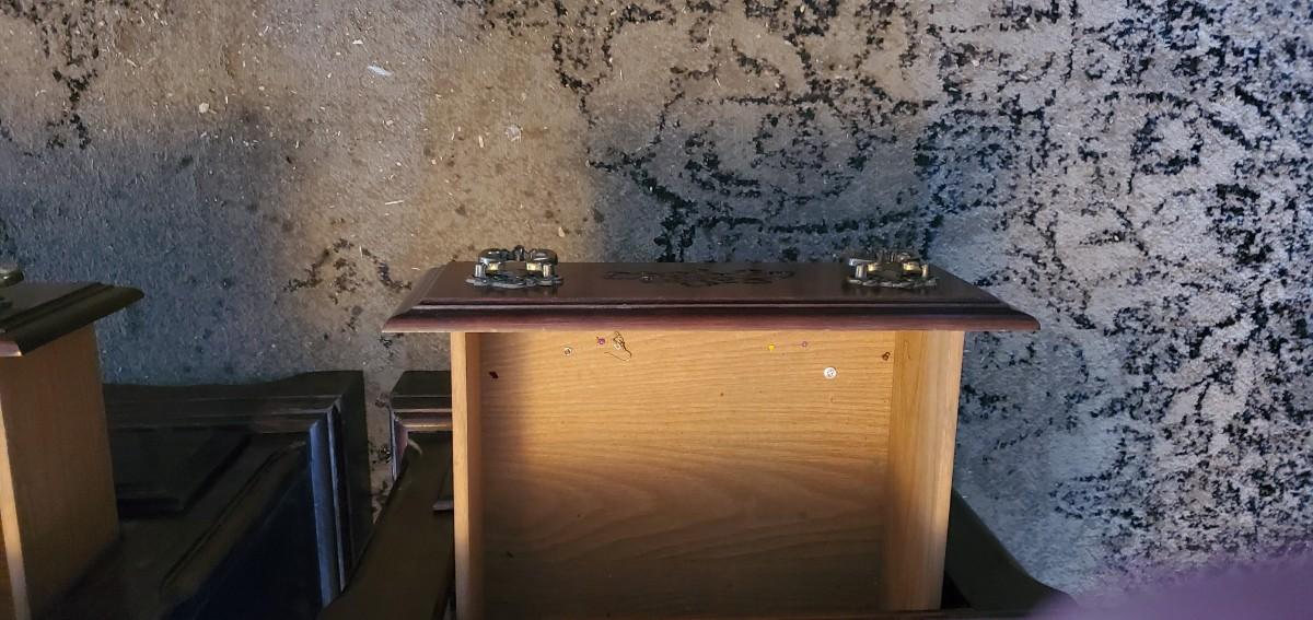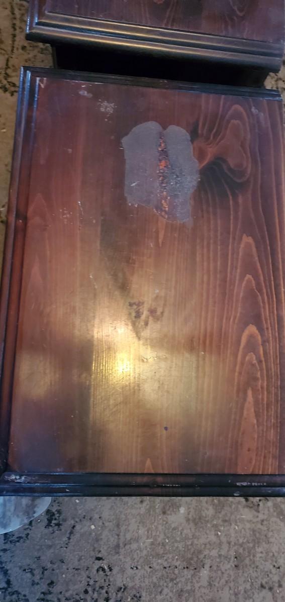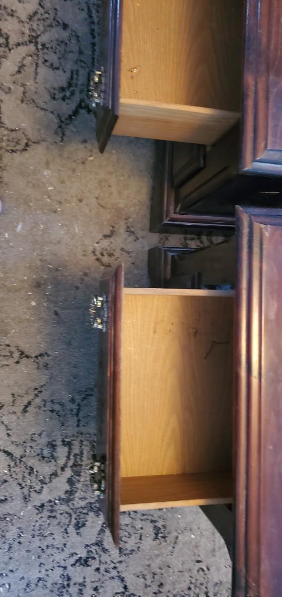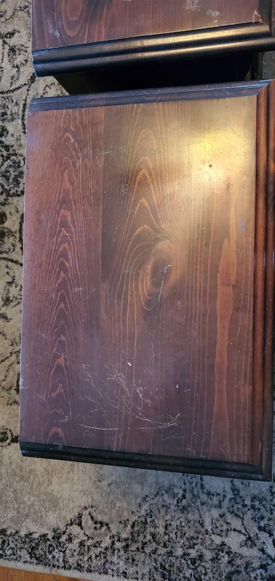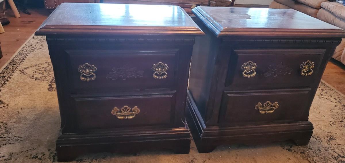 Dark wood color, two drawer bed stands measure 23l×155d×24t,does have some surface wear as shown in pictures